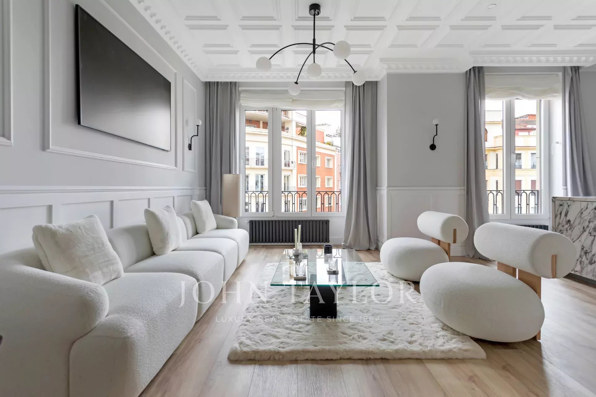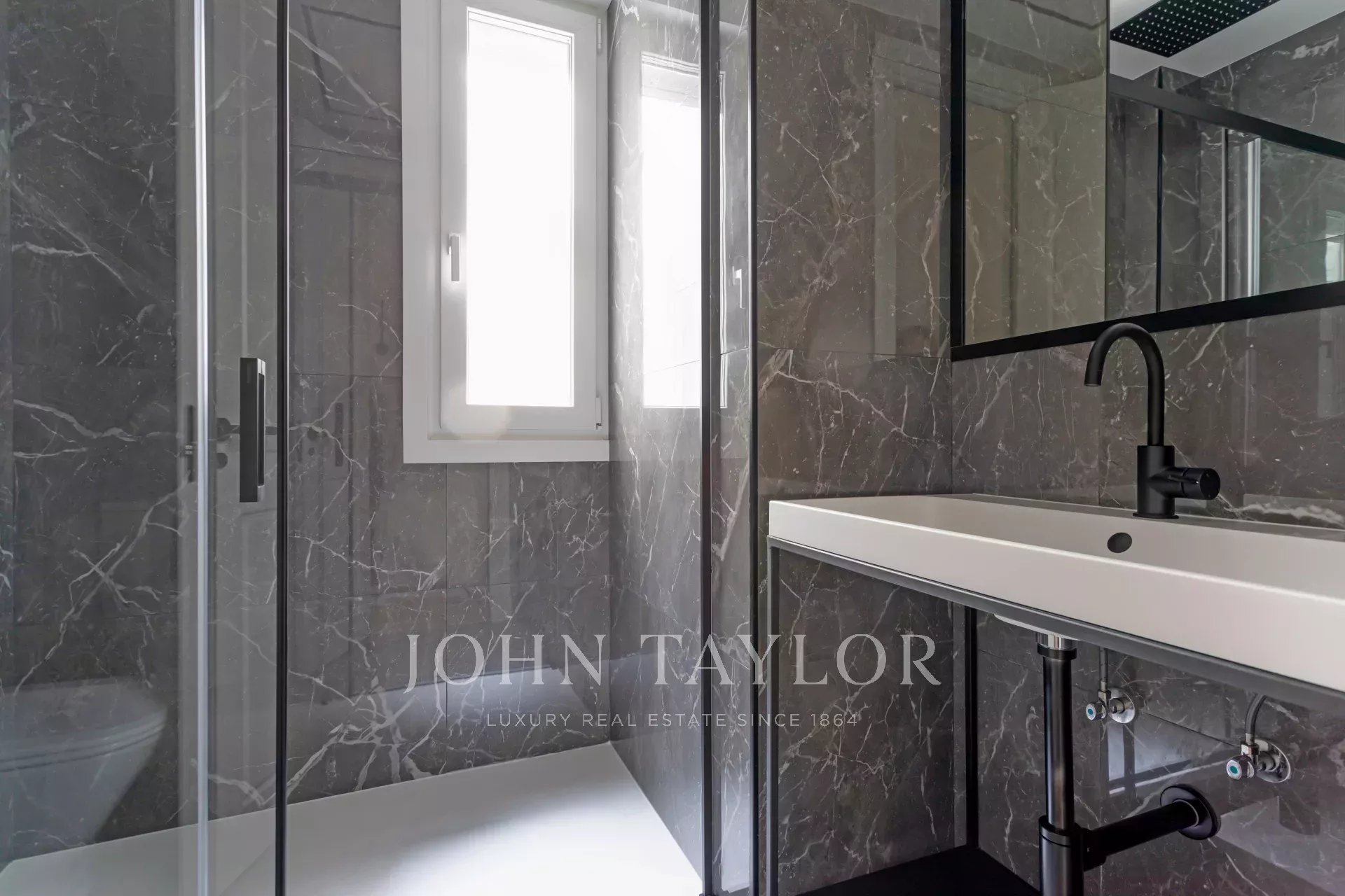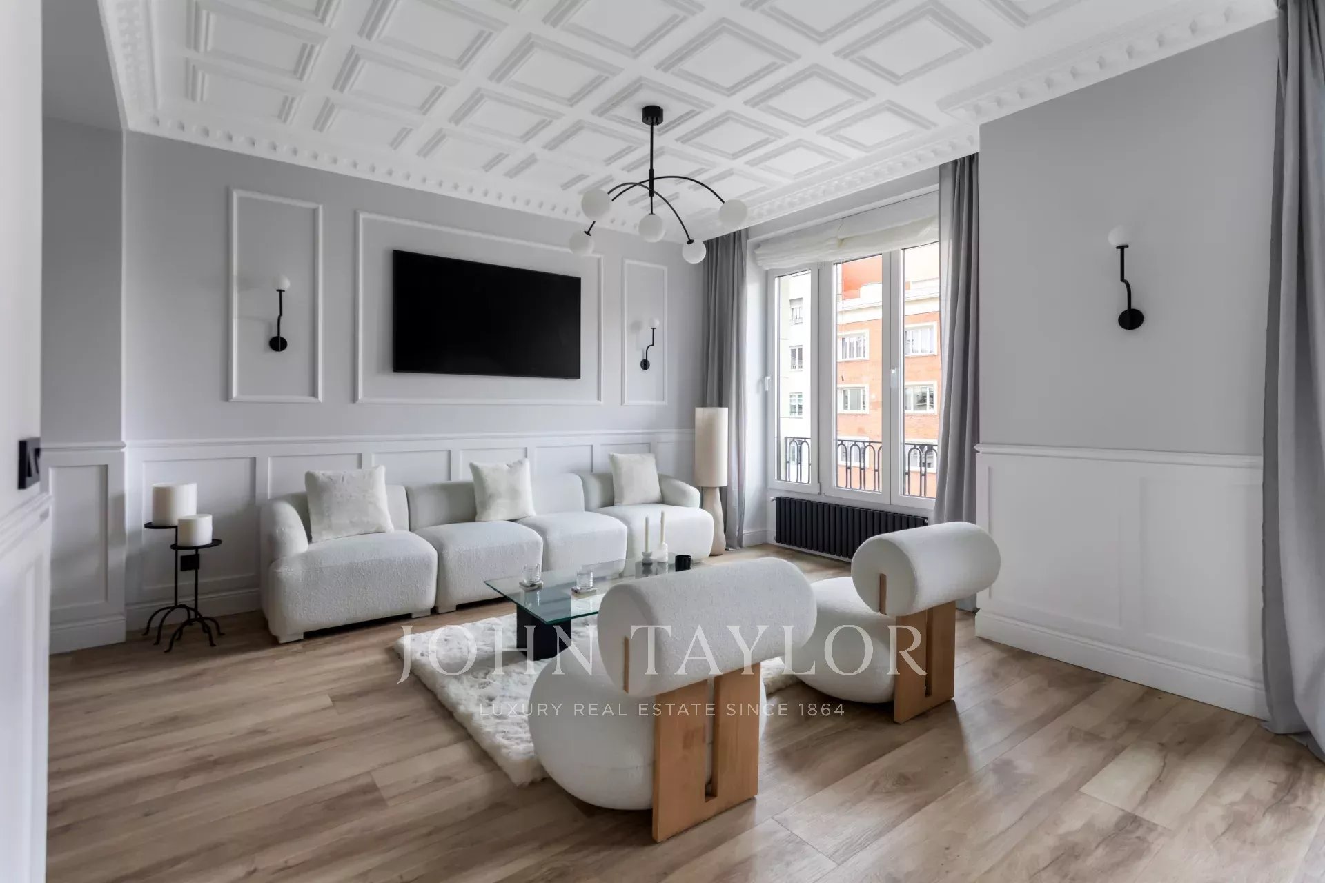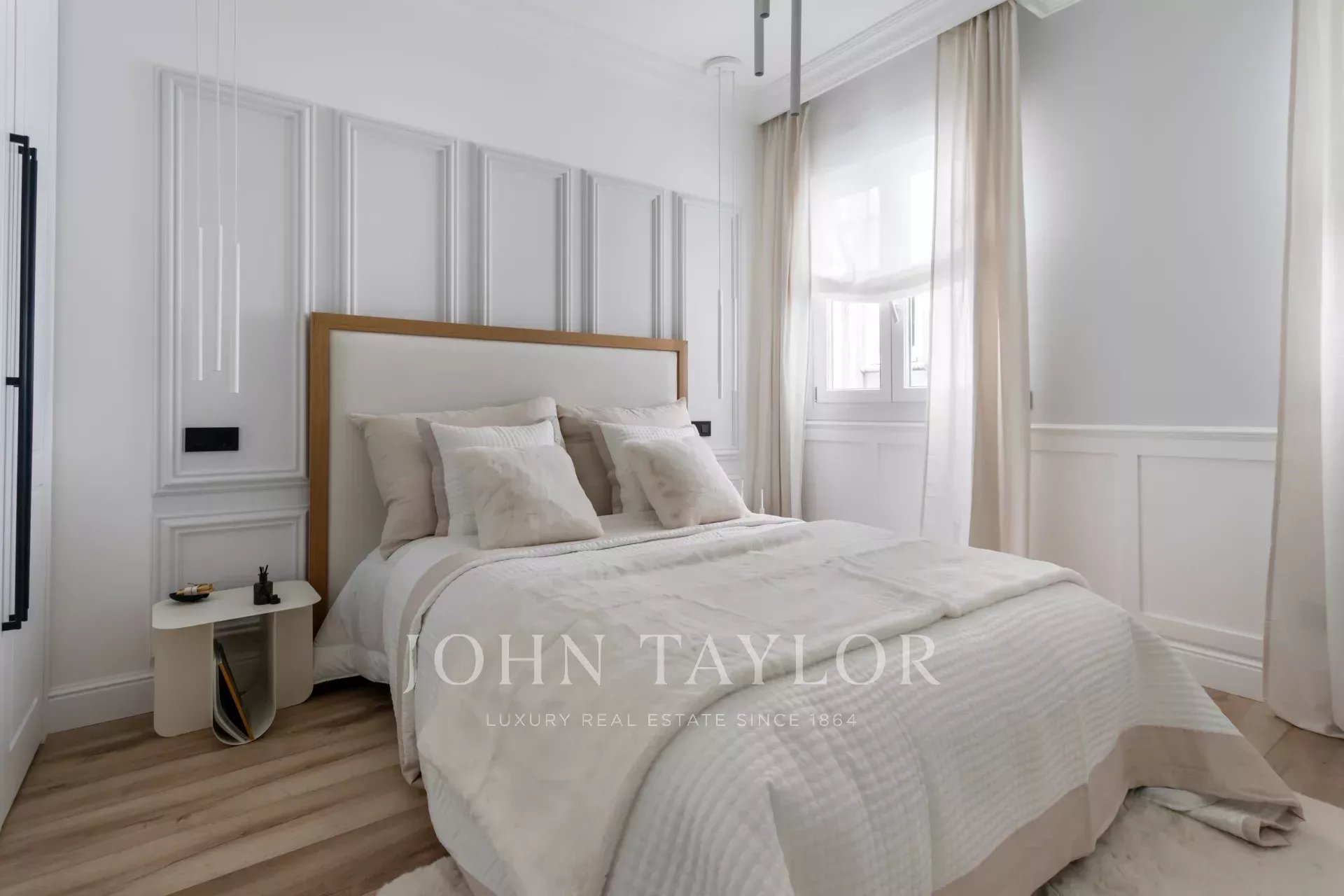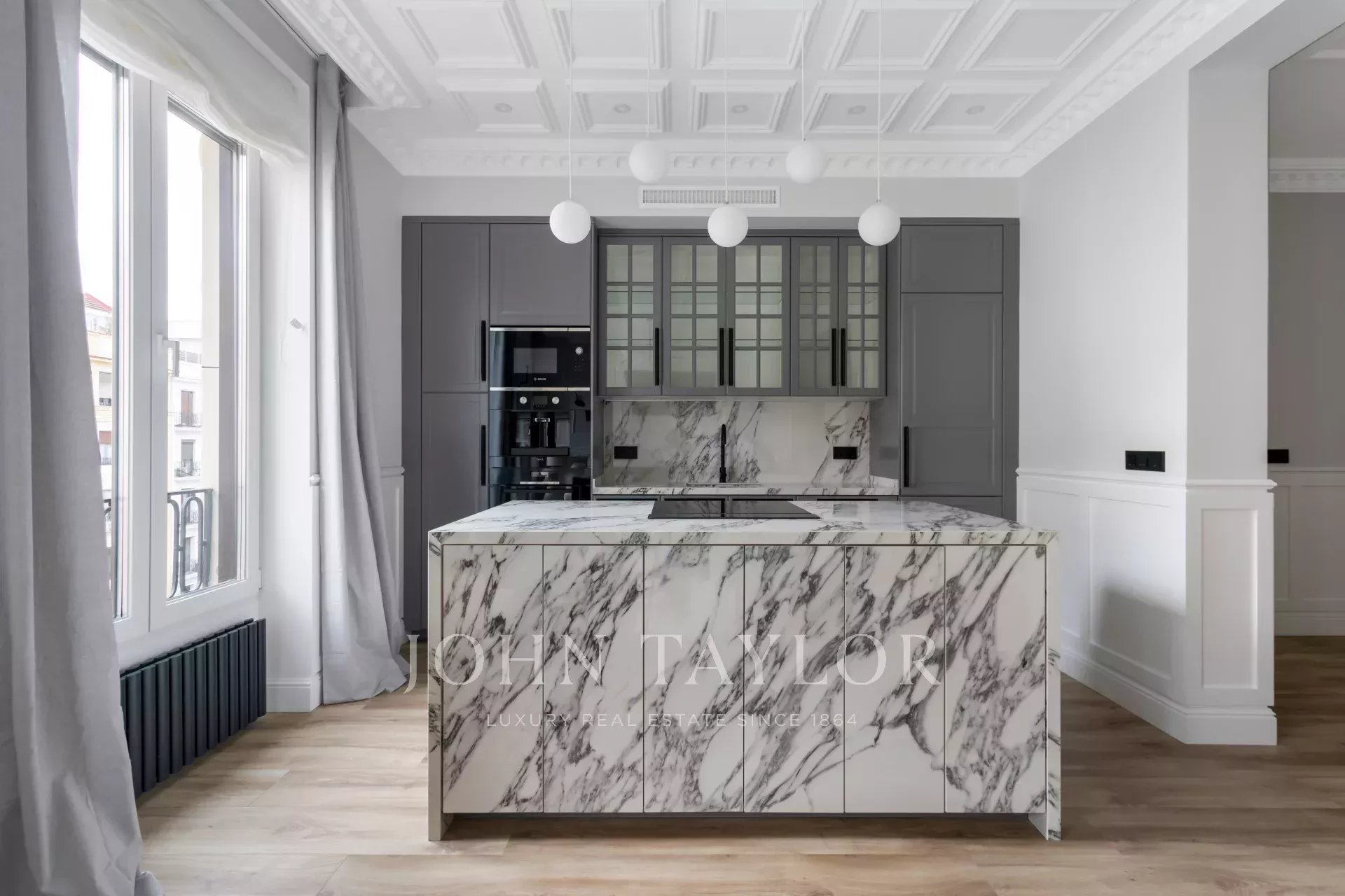 A newly renovated apartment located on the fifth floor of a beautiful building with a classic facade.