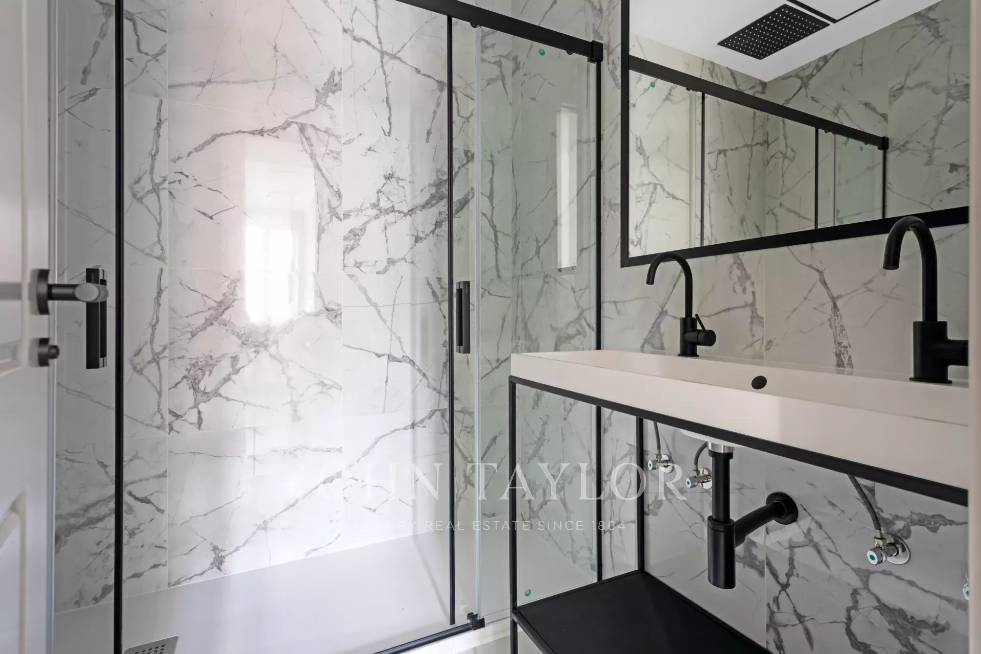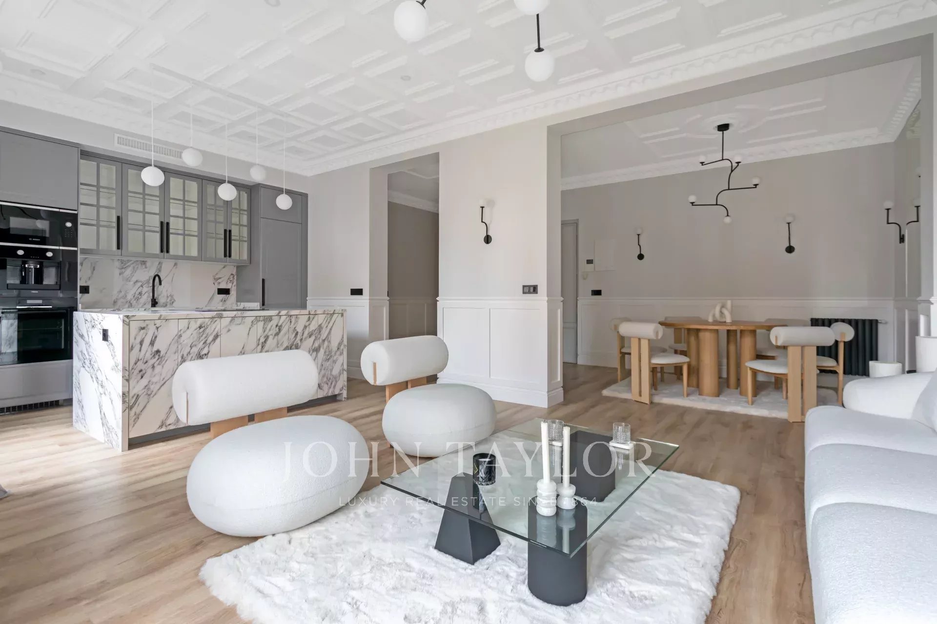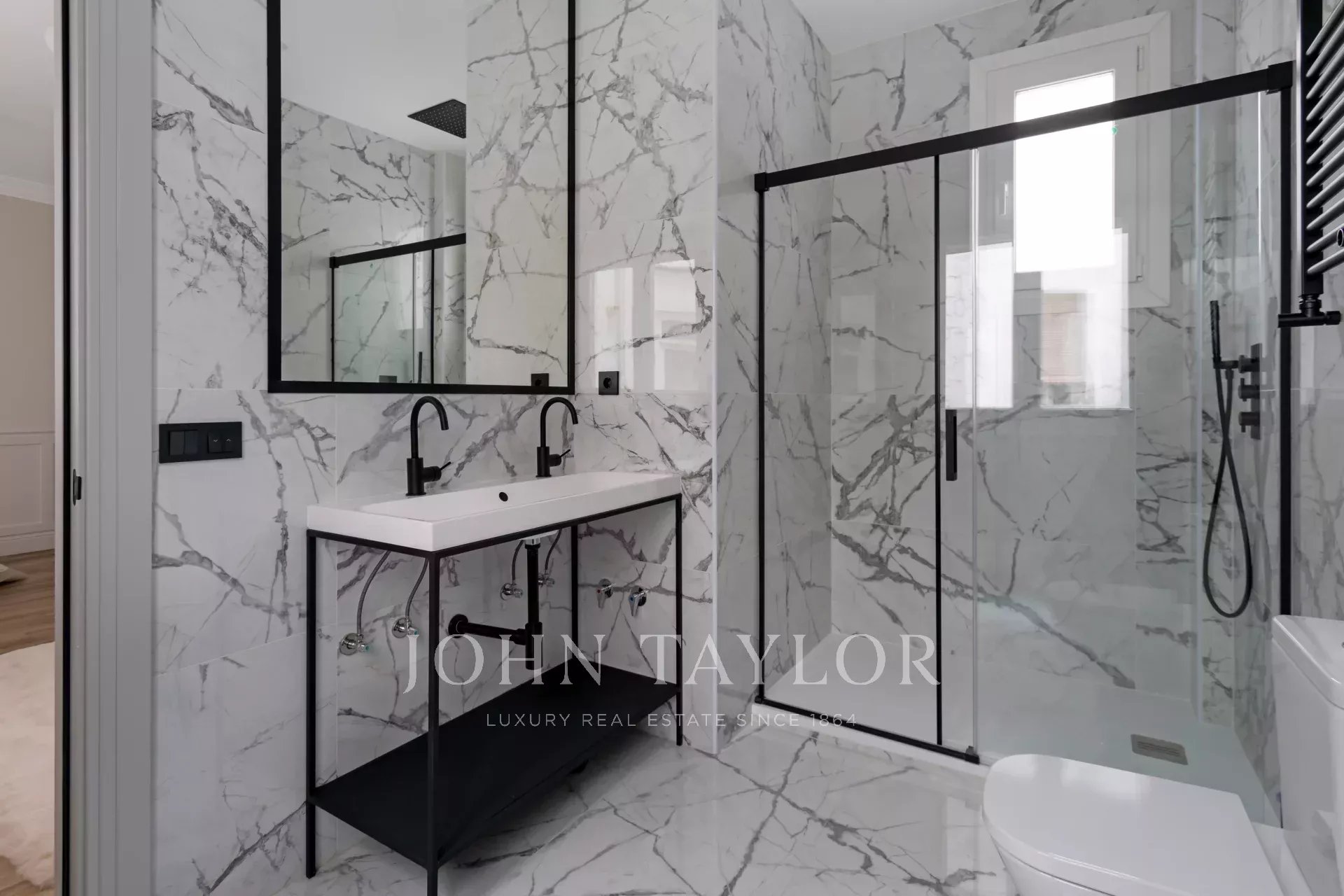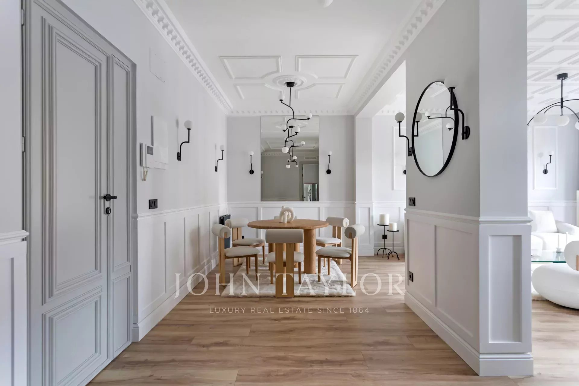A newly renovated apartment located on the fifth floor of a beautiful building with a classic facade.