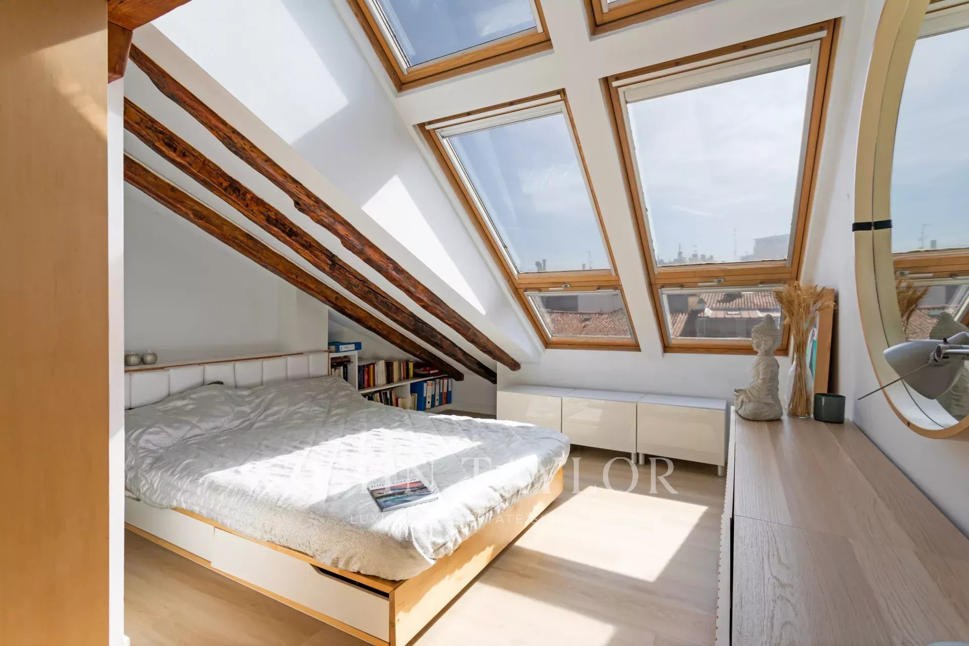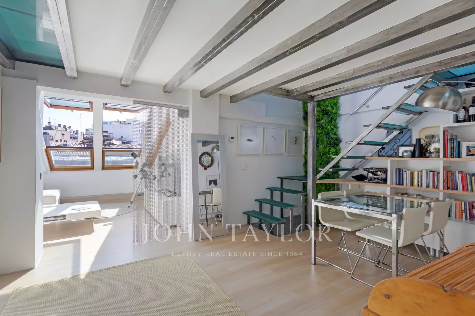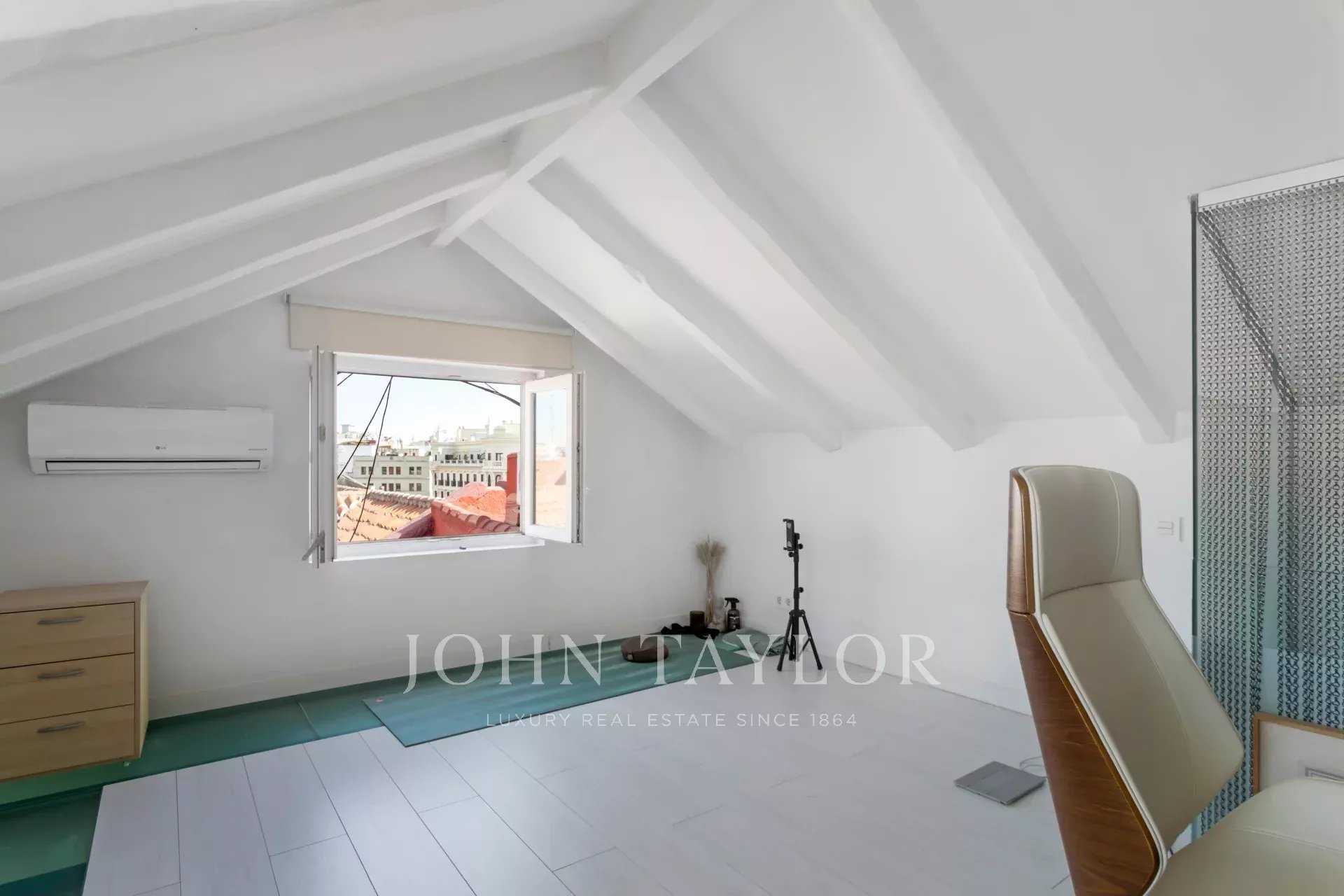 The living room and the bedroom have windows on the roof overlooking Alcalá street, from where you can admire beautiful classical buildings and part of the Retiro Park. This is a penthouse for lovers of sun and natural light.