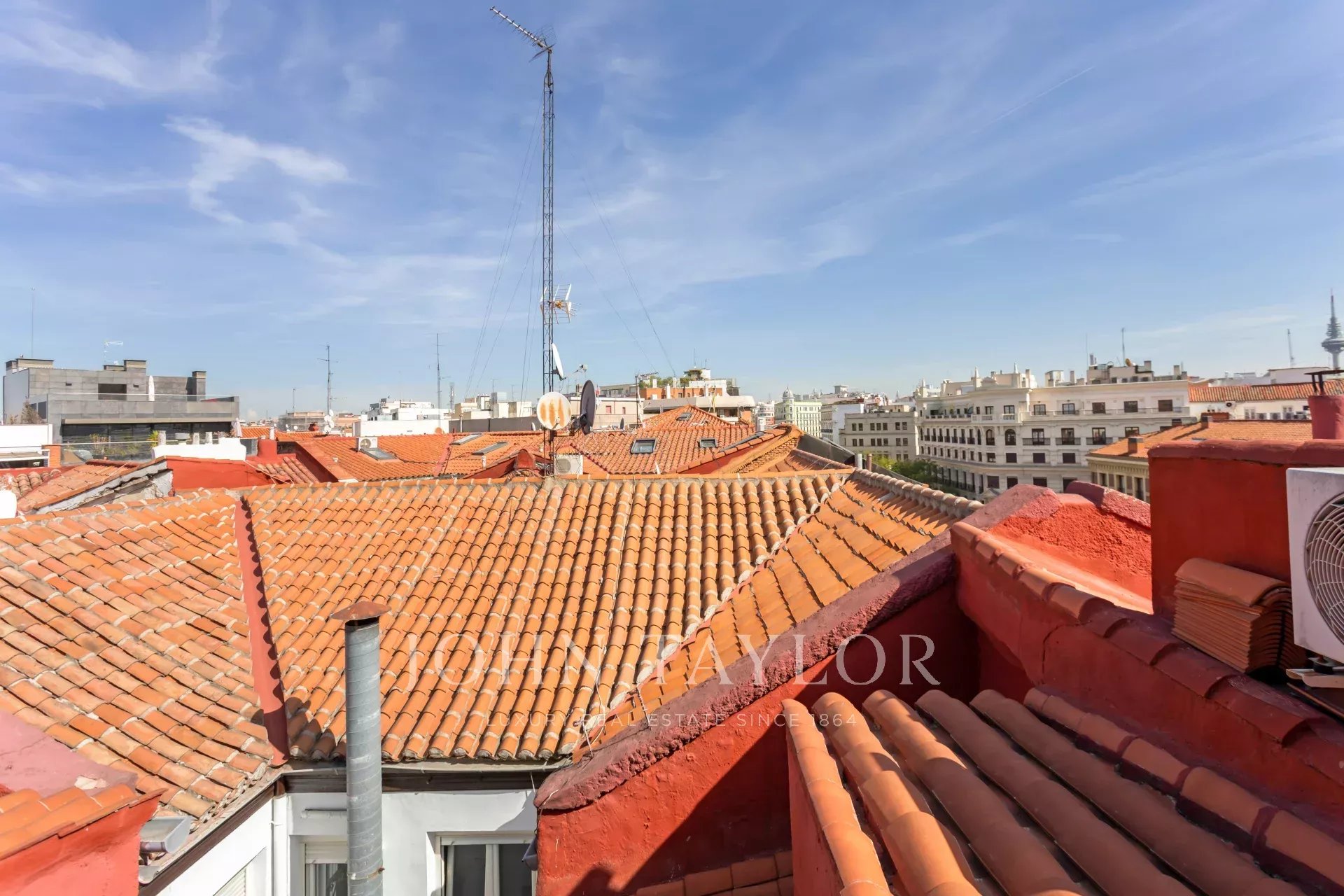 The living room and the bedroom have windows on the roof overlooking Alcalá street, from where you can admire beautiful classical buildings and part of the Retiro Park. This is a penthouse for lovers of sun and natural light.