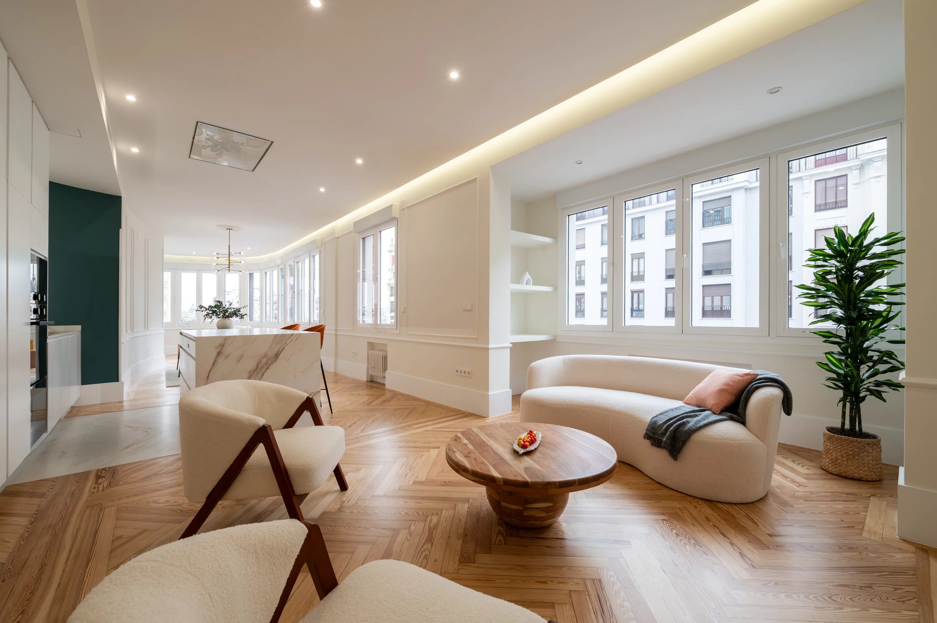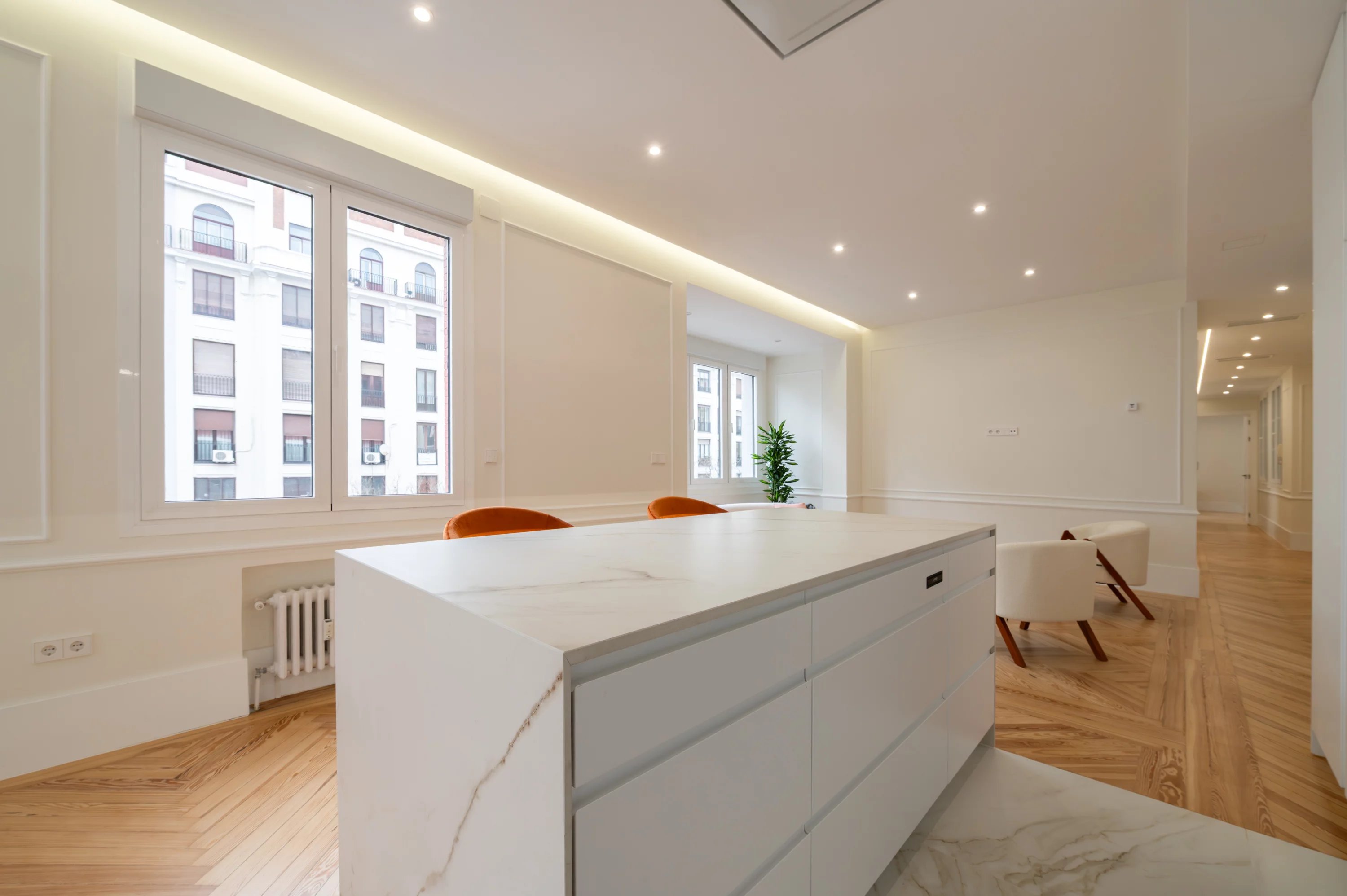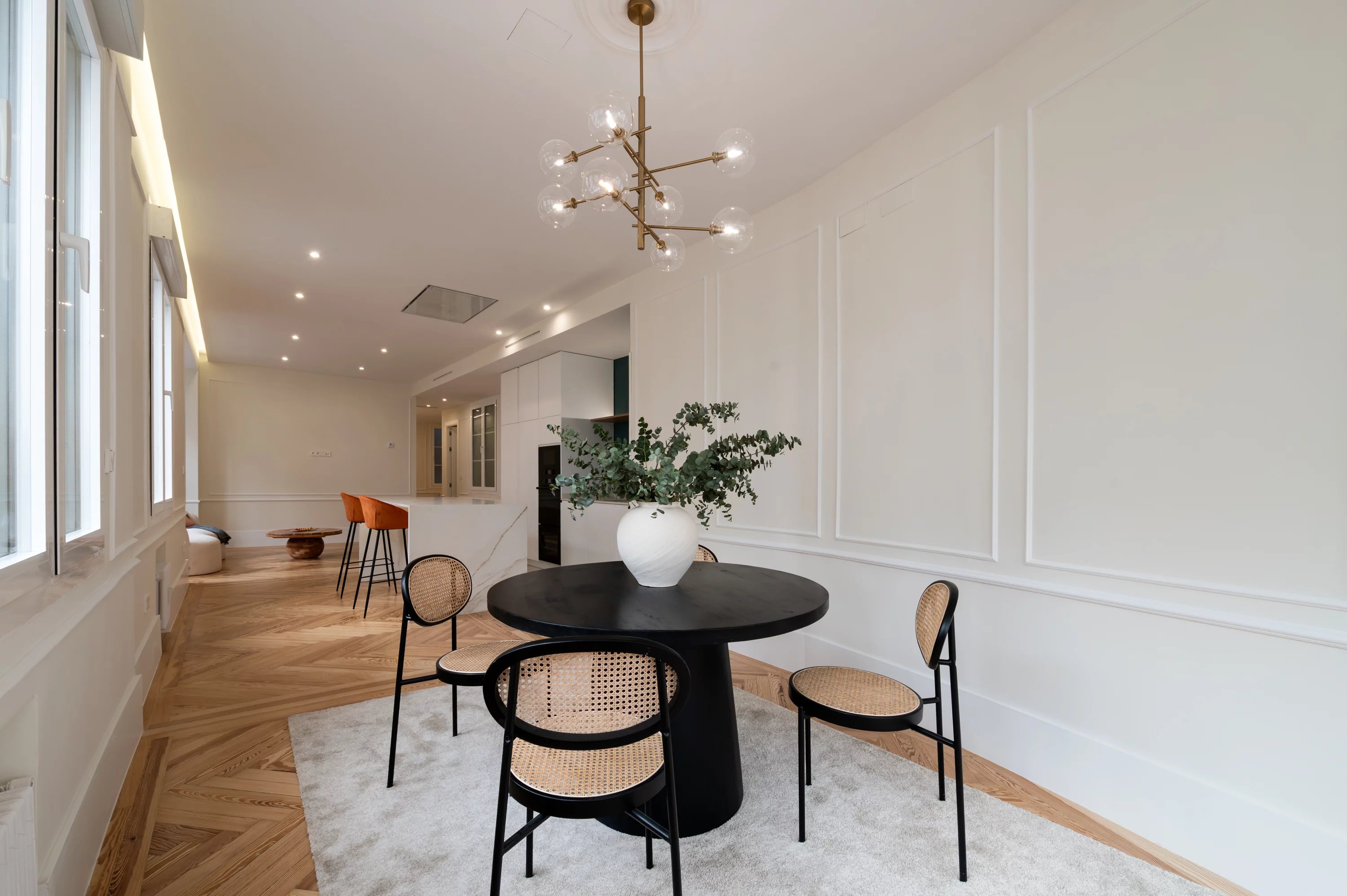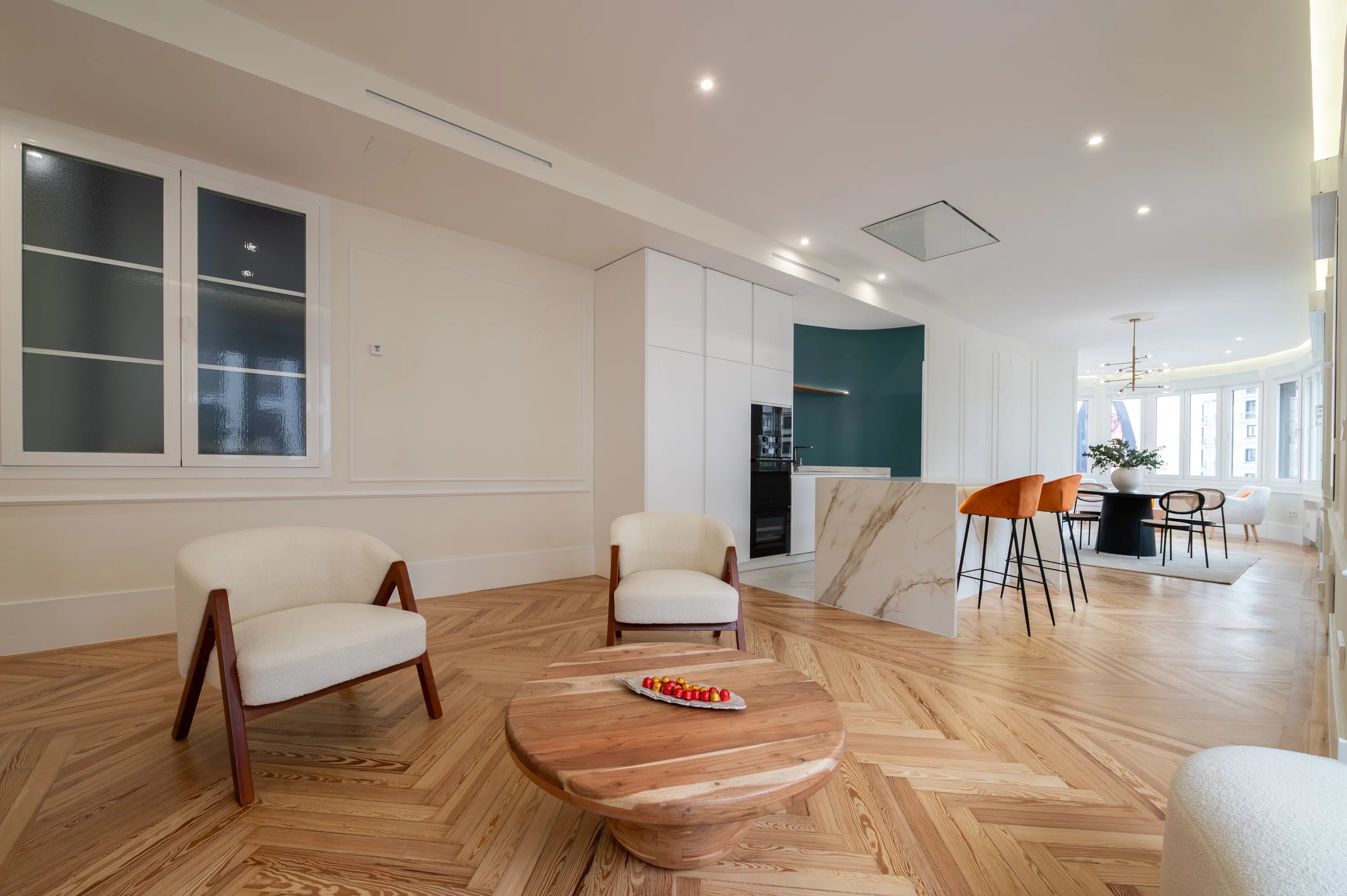 The main living room, spacious and bright, becomes the ideal place to enjoy urban views and the dynamism of Madrid, while the fully equipped kitchen offers a practical and elegant space for everyday life.