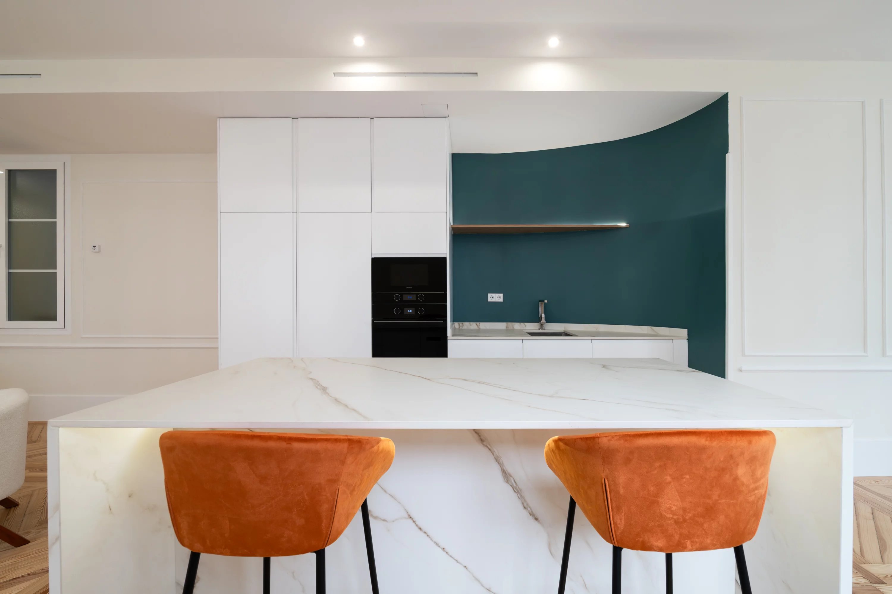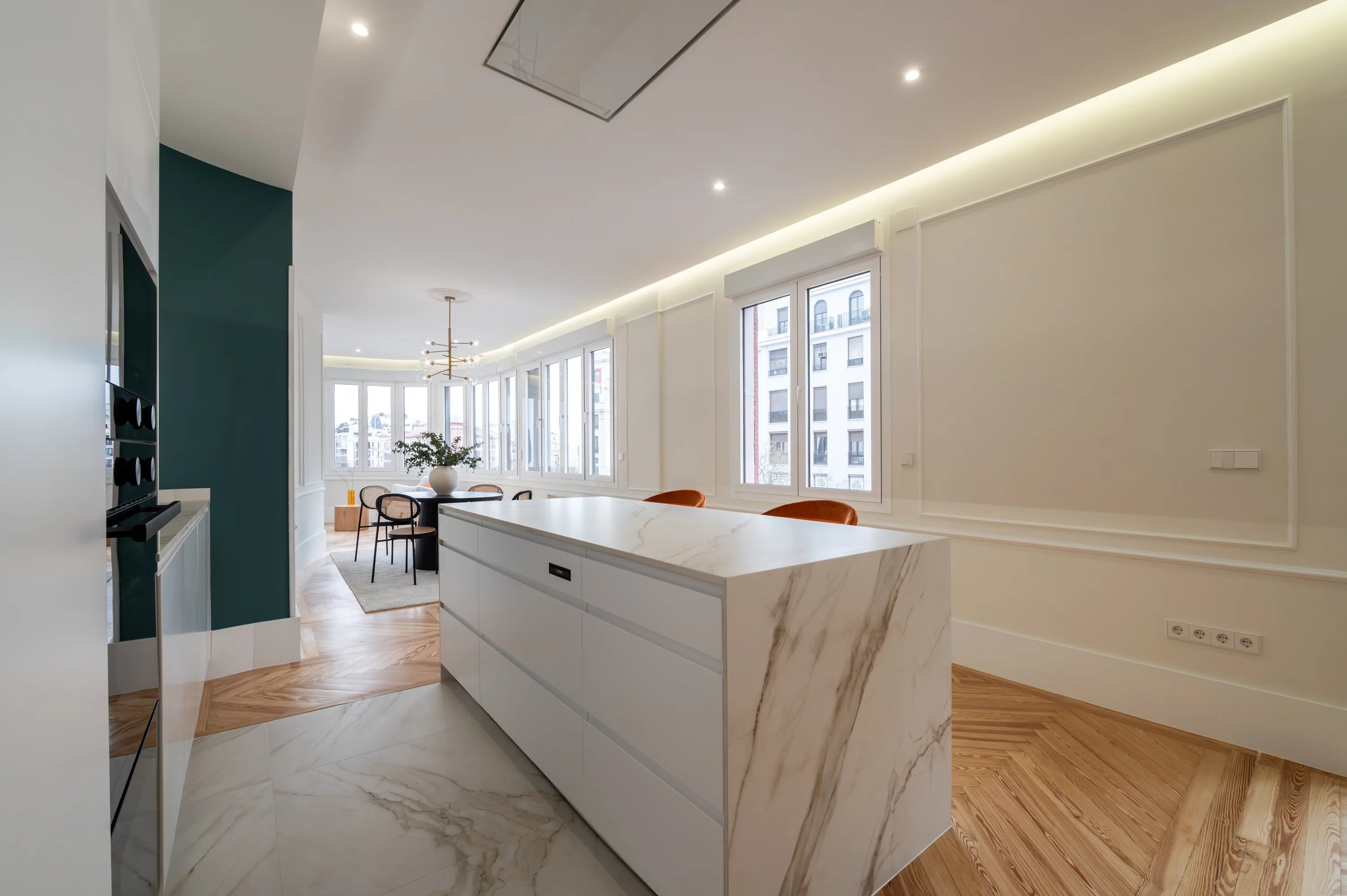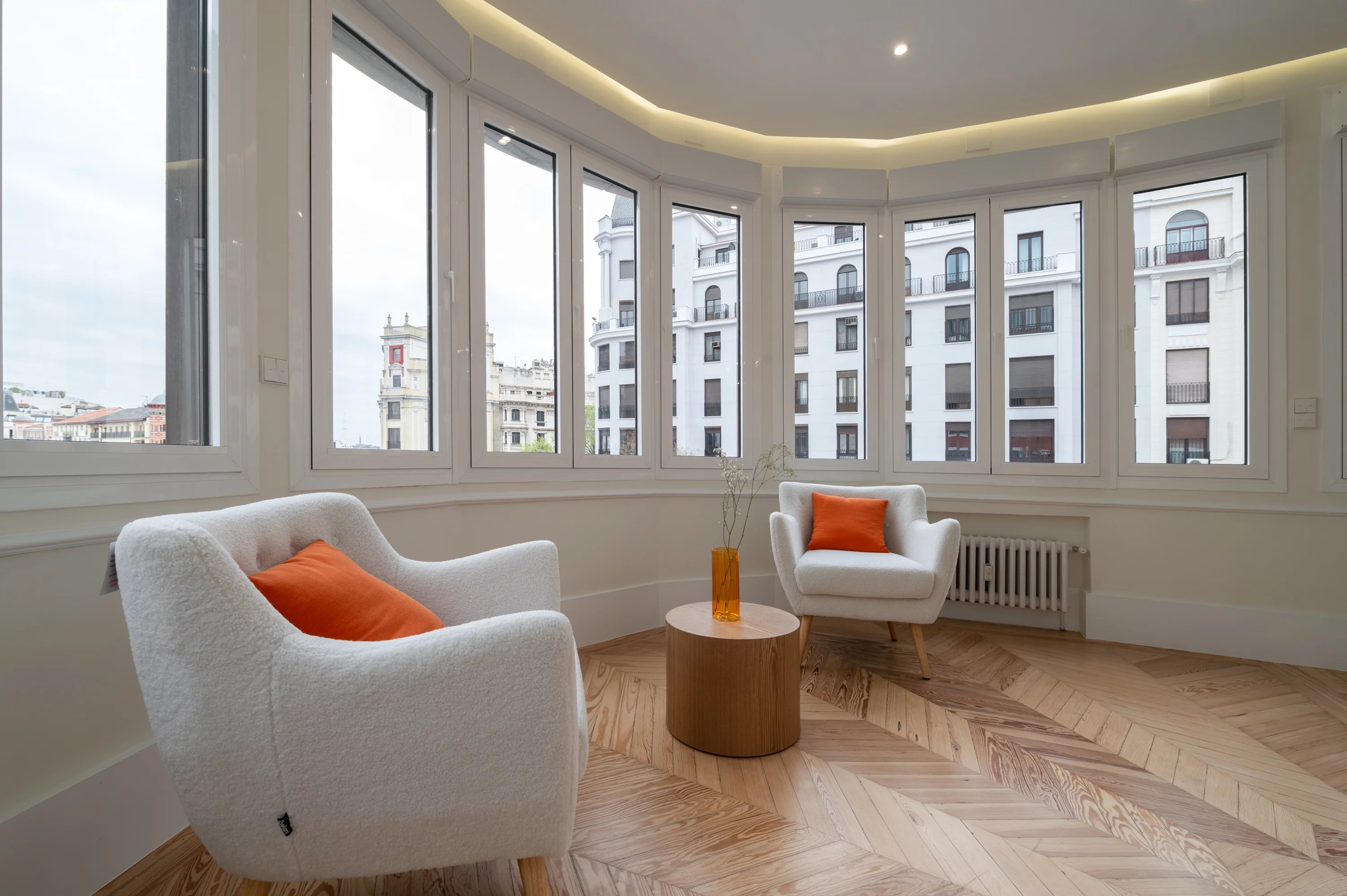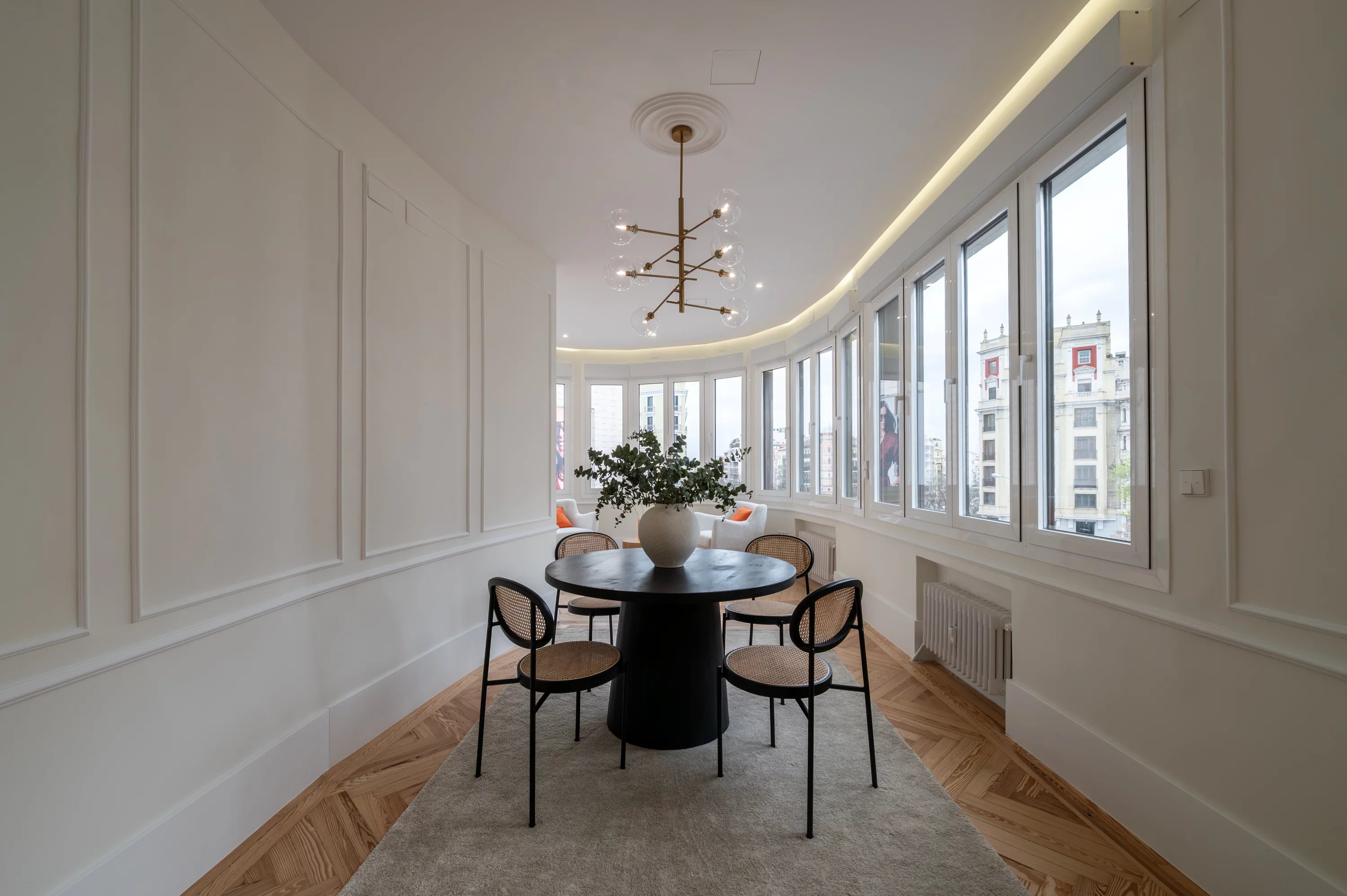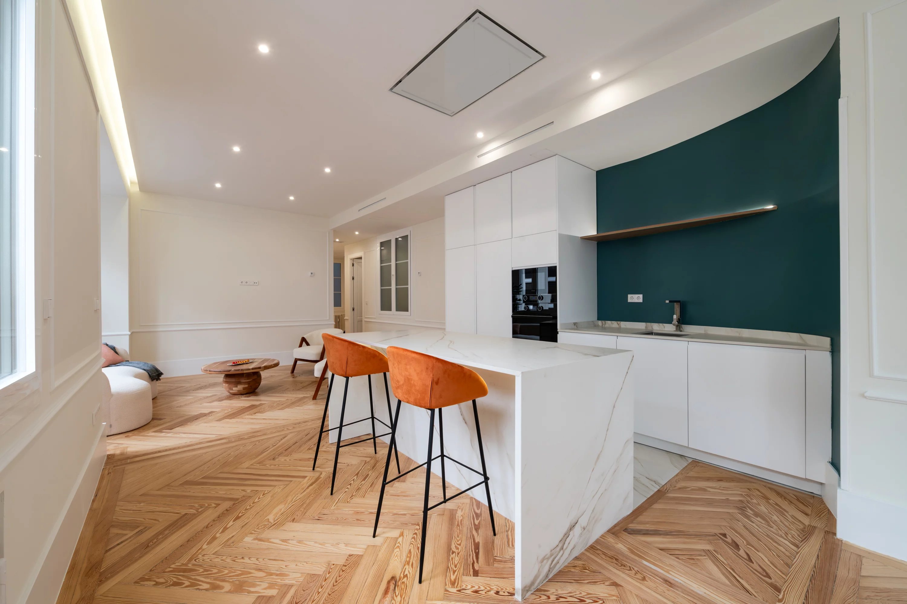 The main living room, spacious and bright, becomes the ideal place to enjoy urban views and the dynamism of Madrid, while the fully equipped kitchen offers a practical and elegant space for everyday life.