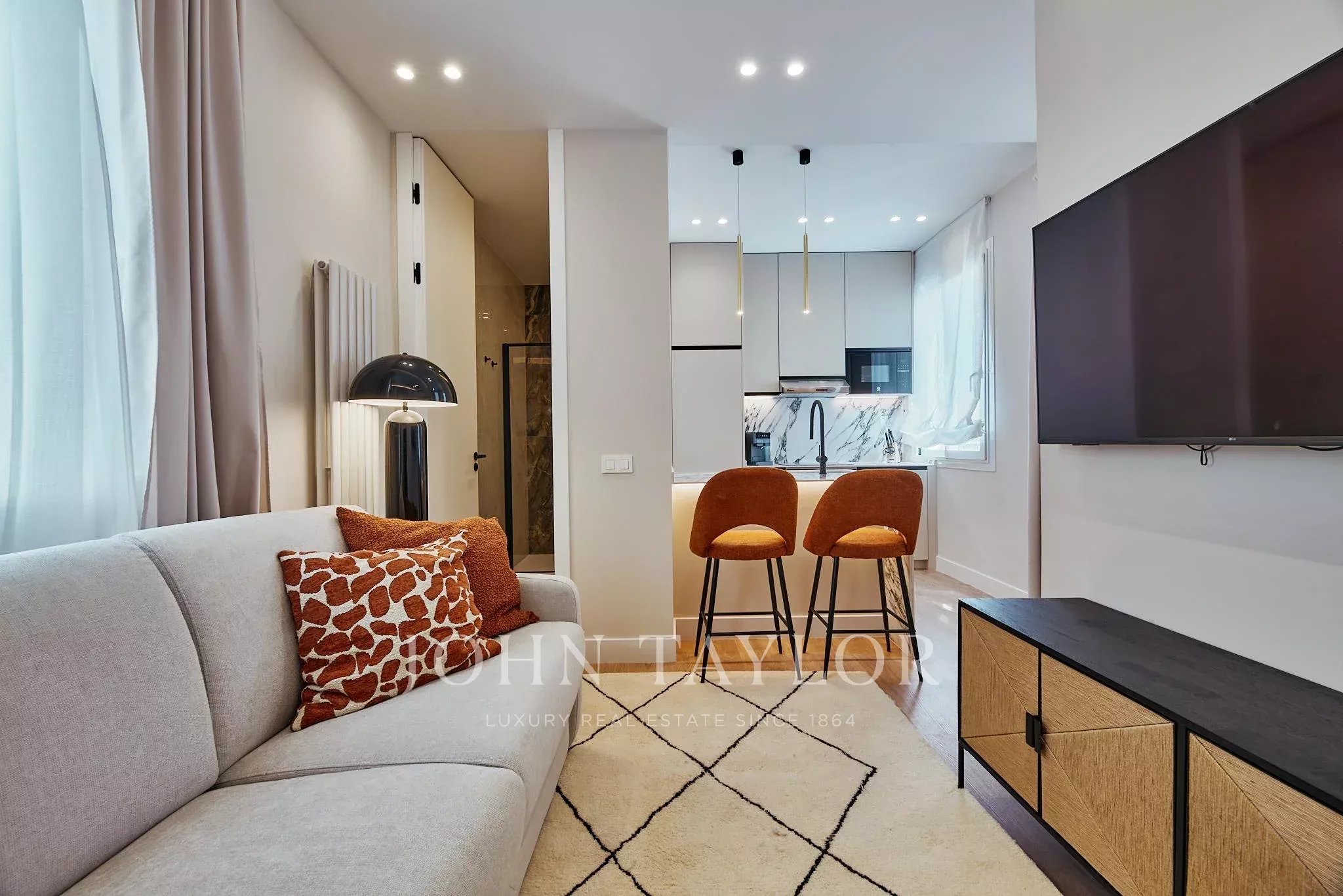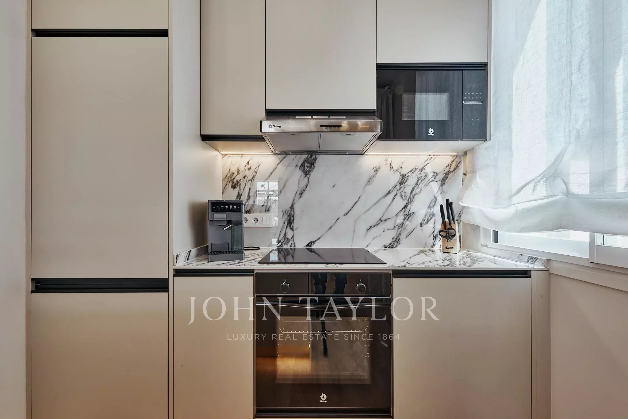 Located in an elegant classic building from 1930, the property has been carefully renovated and is fully furnished, combining character and contemporary sophistication. The home is distributed into a bright living room with direct access to the terrace, a fully equipped integrated kitchen, one bedroom, and a full bathroom.