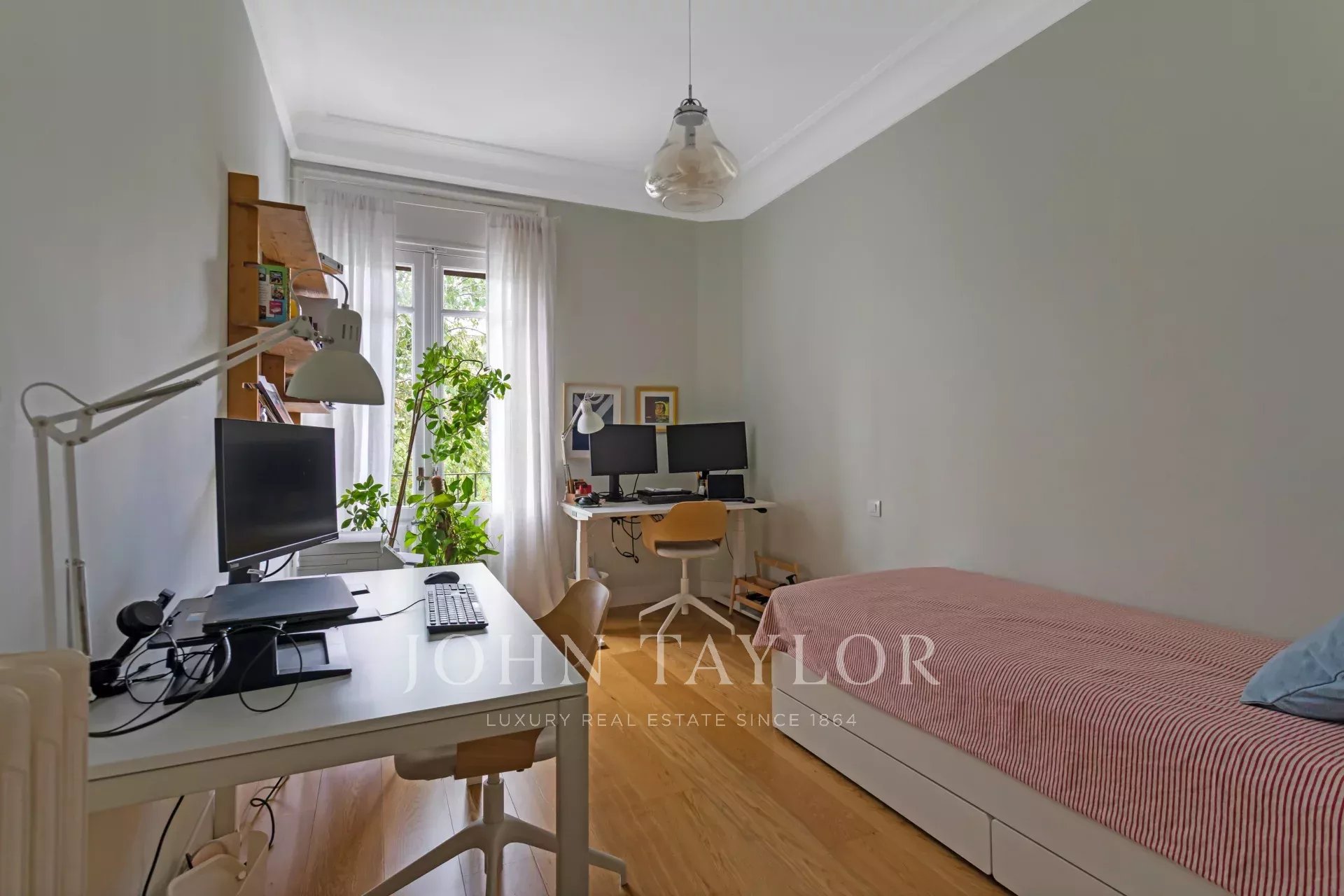 In the outside area is the living-dining room separated into two rooms; and two large bedrooms, one with bathroom in front and the other with dressing room and bathroom en suite. The three rooms have unobstructed views of a beautiful historic building with private garden.