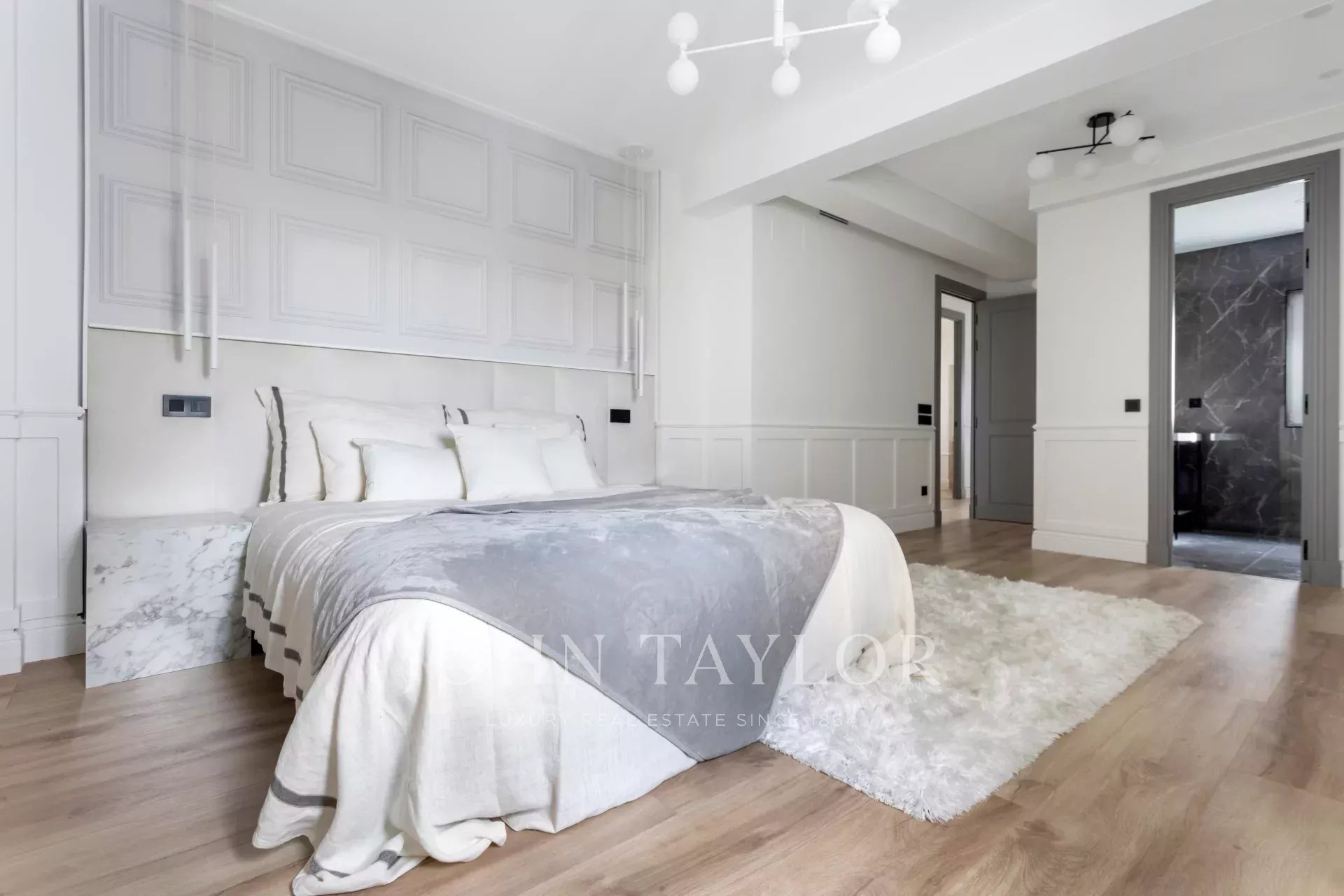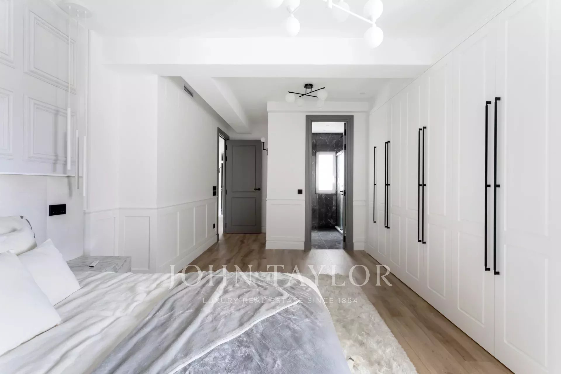 It has three large bedrooms. Two of them have en suite bathrooms and the third uses a bathroom located just in front that serves as a guest toilet.