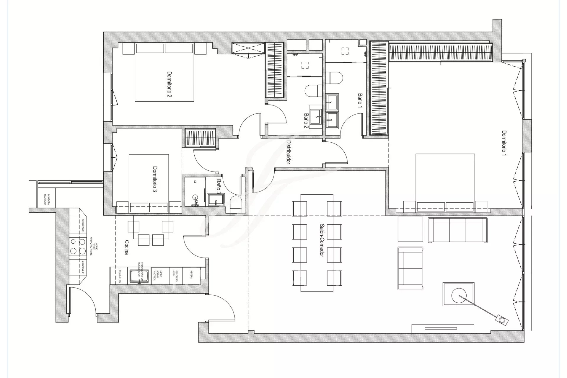 The property consists of a large social area of more than 50m², with bright and spacious living and dining areas. Next to it and through sliding doors we access the kitchen, fully equipped and with island, plus separate area for washing machine and dryer.