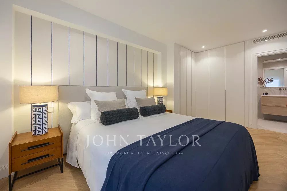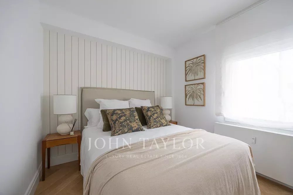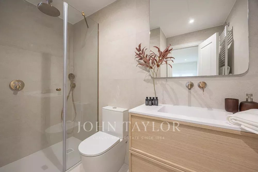 The sleeping area includes three bedrooms and three bathrooms, all en suite. The master bedroom stands out for its large size, well above average for the area, with two large windows overlooking the street and a full bathroom en suite.