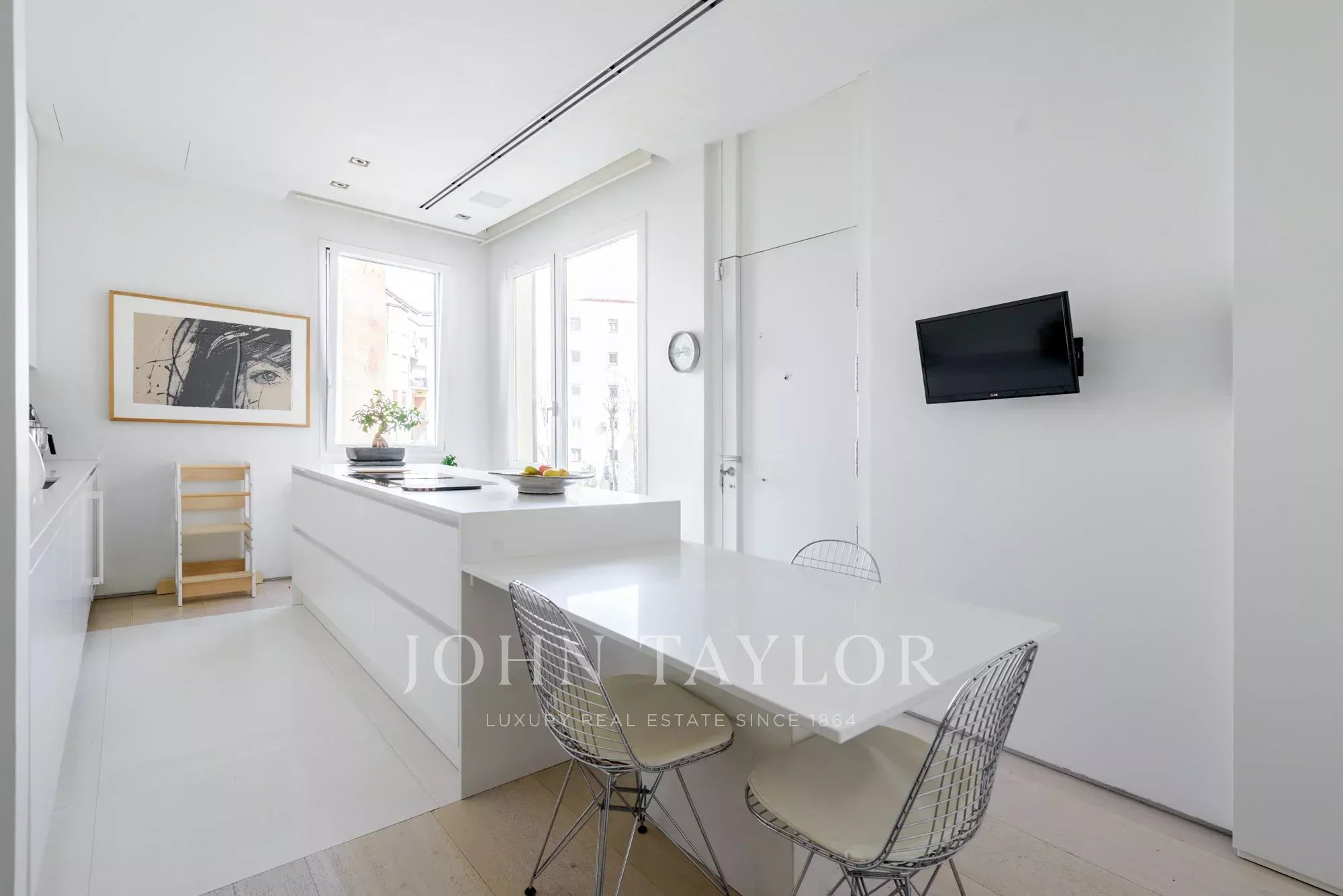 The kitchen is independent and bright, with dining area and large windows overlooking a quiet landscaped courtyard. The appliances are top of the range.