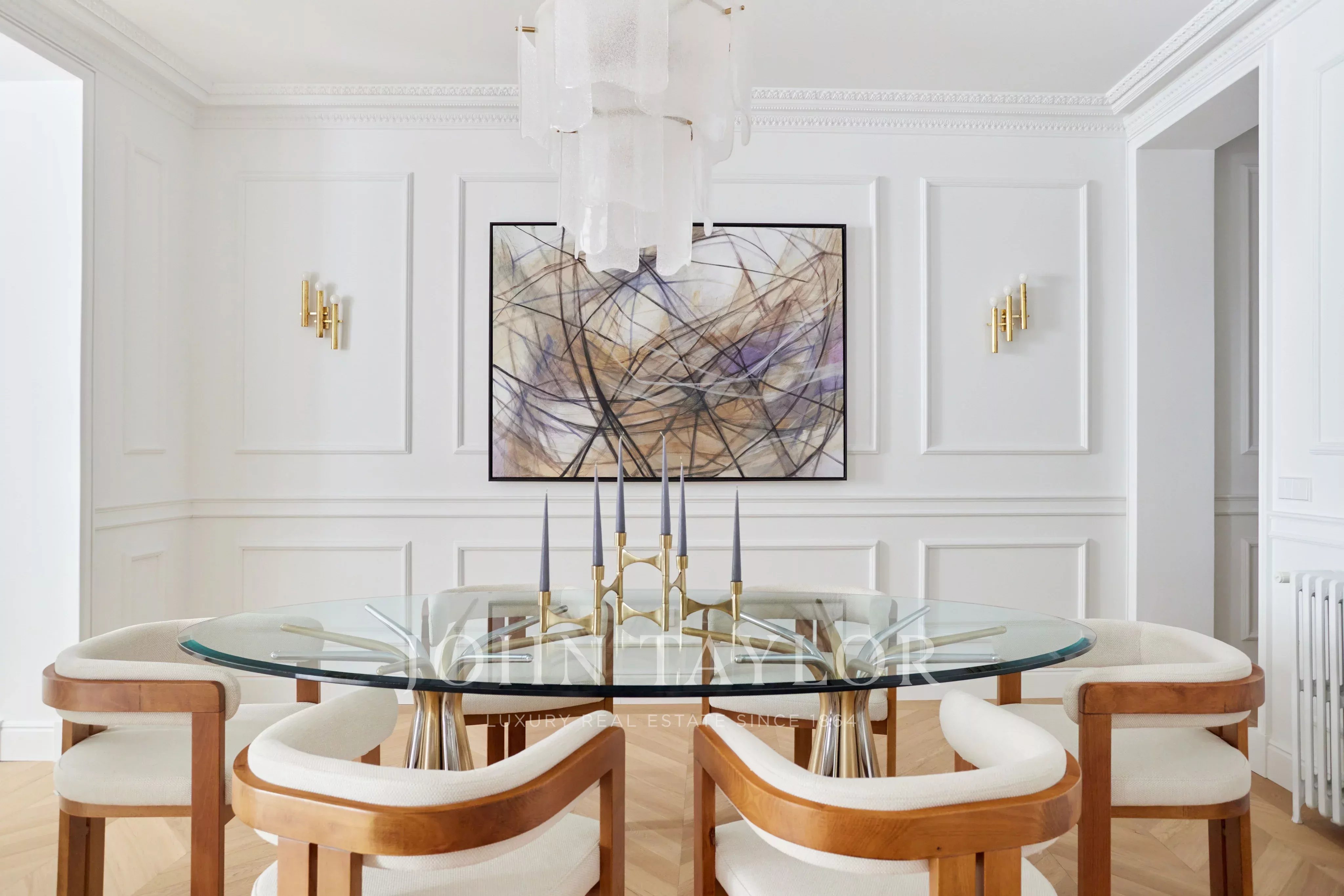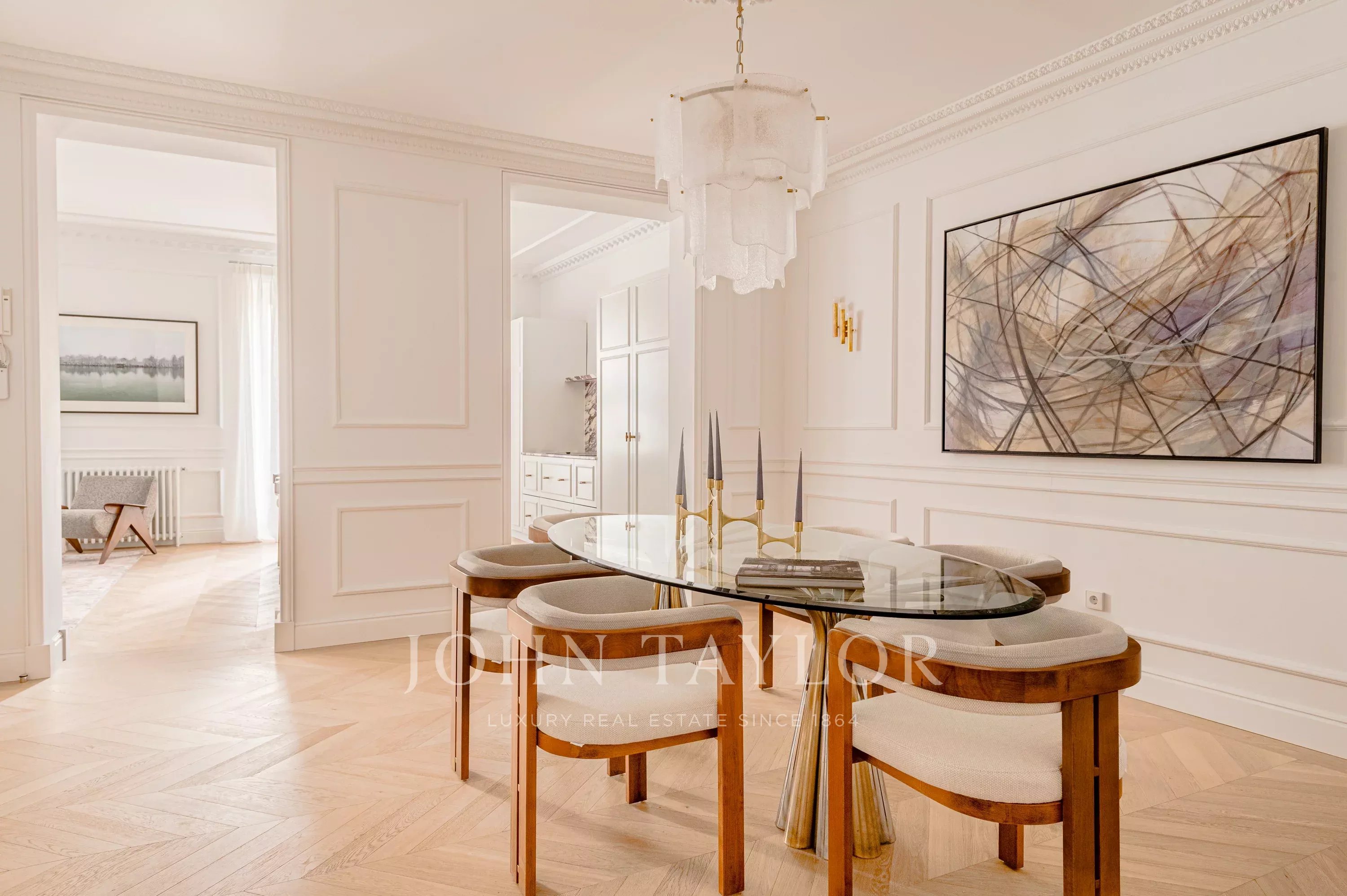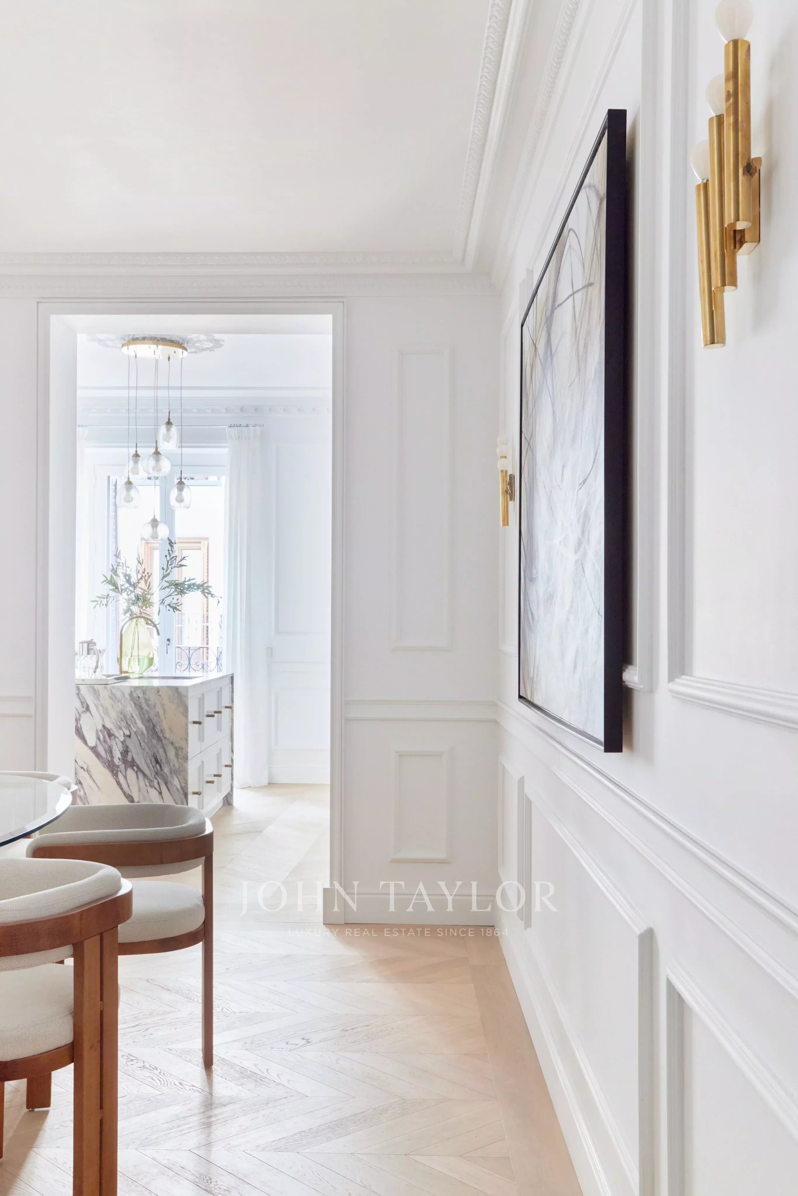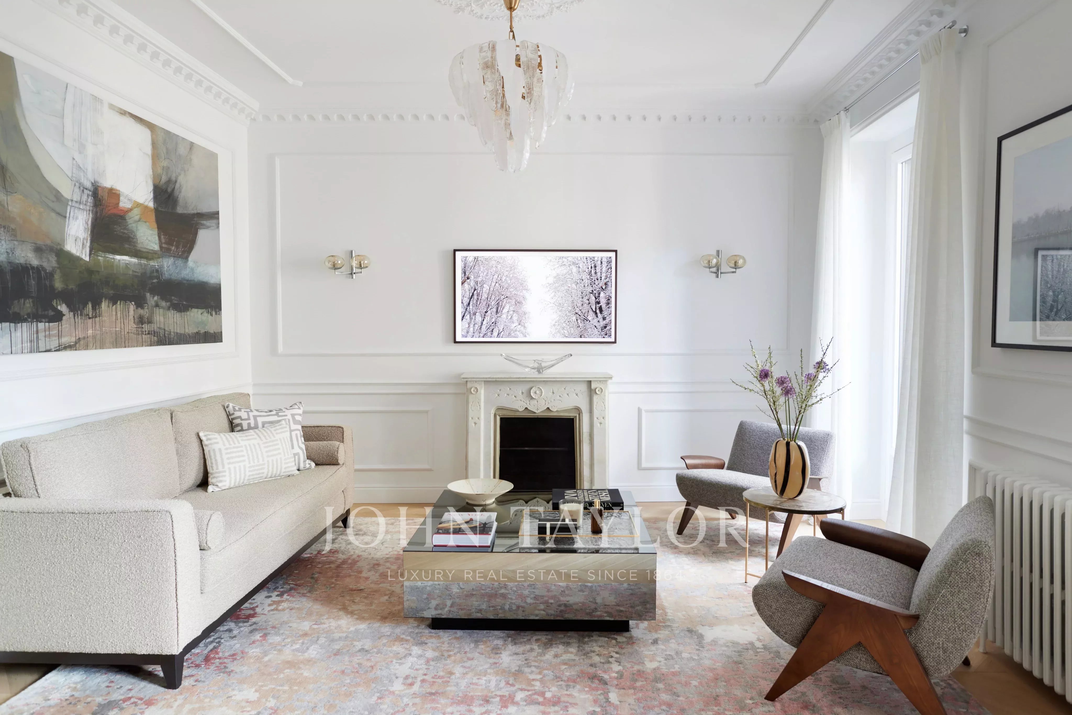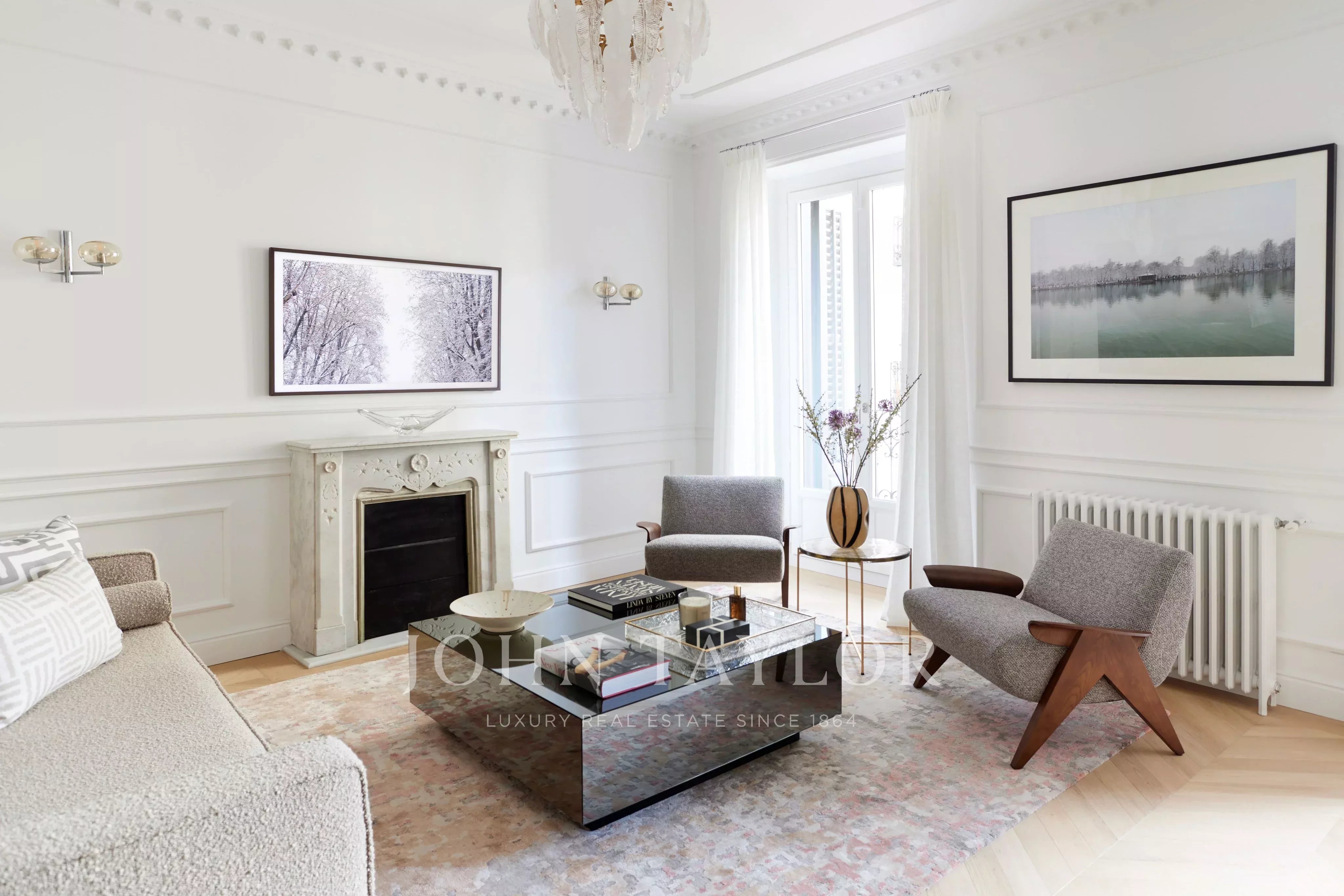Every corner of the property breathes distinction thanks to the use of noble materials such as the chevron oak flooring, recovered original carpentries, and invisible technical air conditioning. Fully furnished with pieces that blend classicism and avant-garde, this home is not only a residence of the highest level but also a strategic investment in one of the areas with the greatest projection and revaluation in the capital.