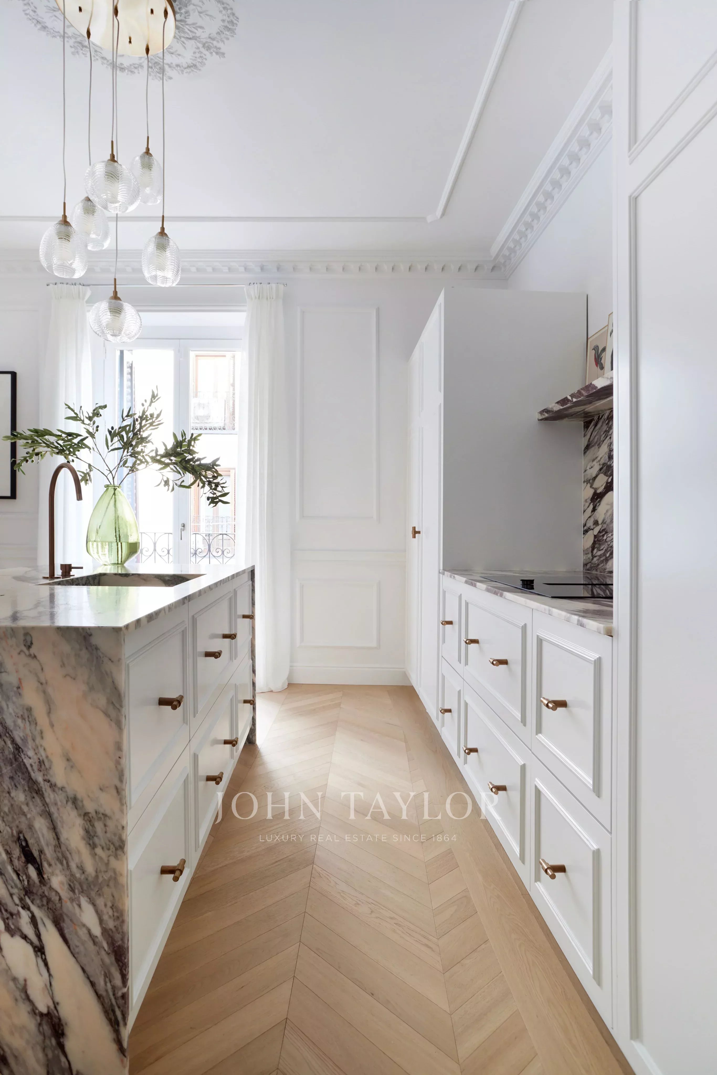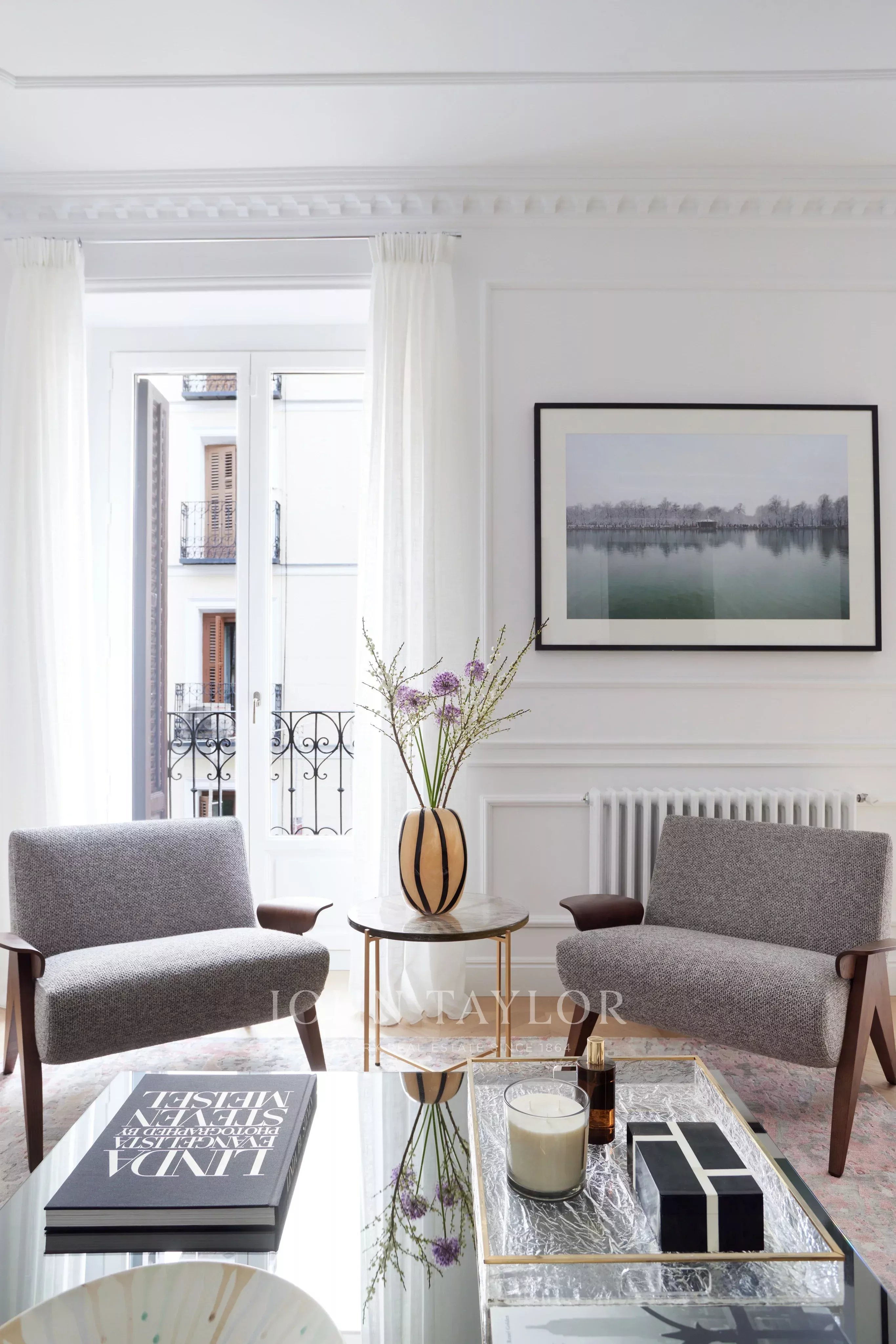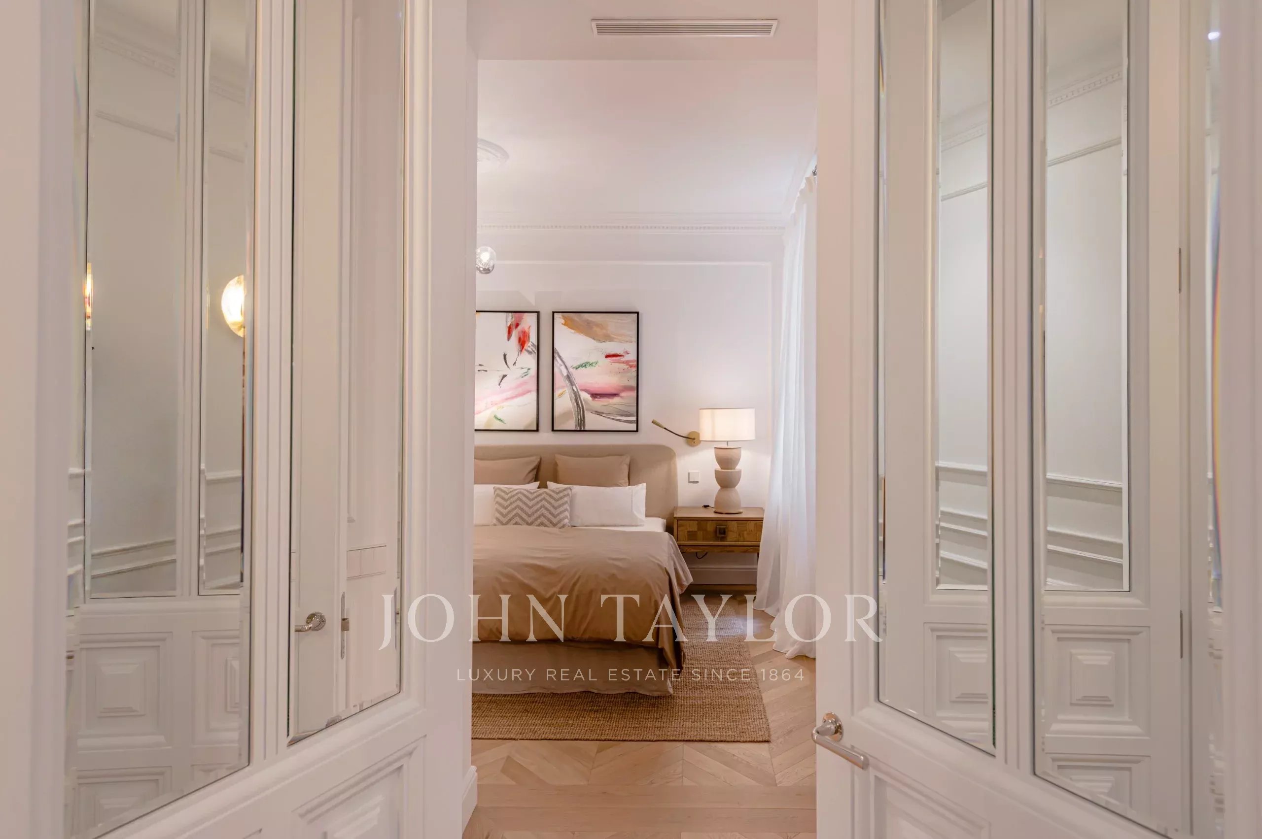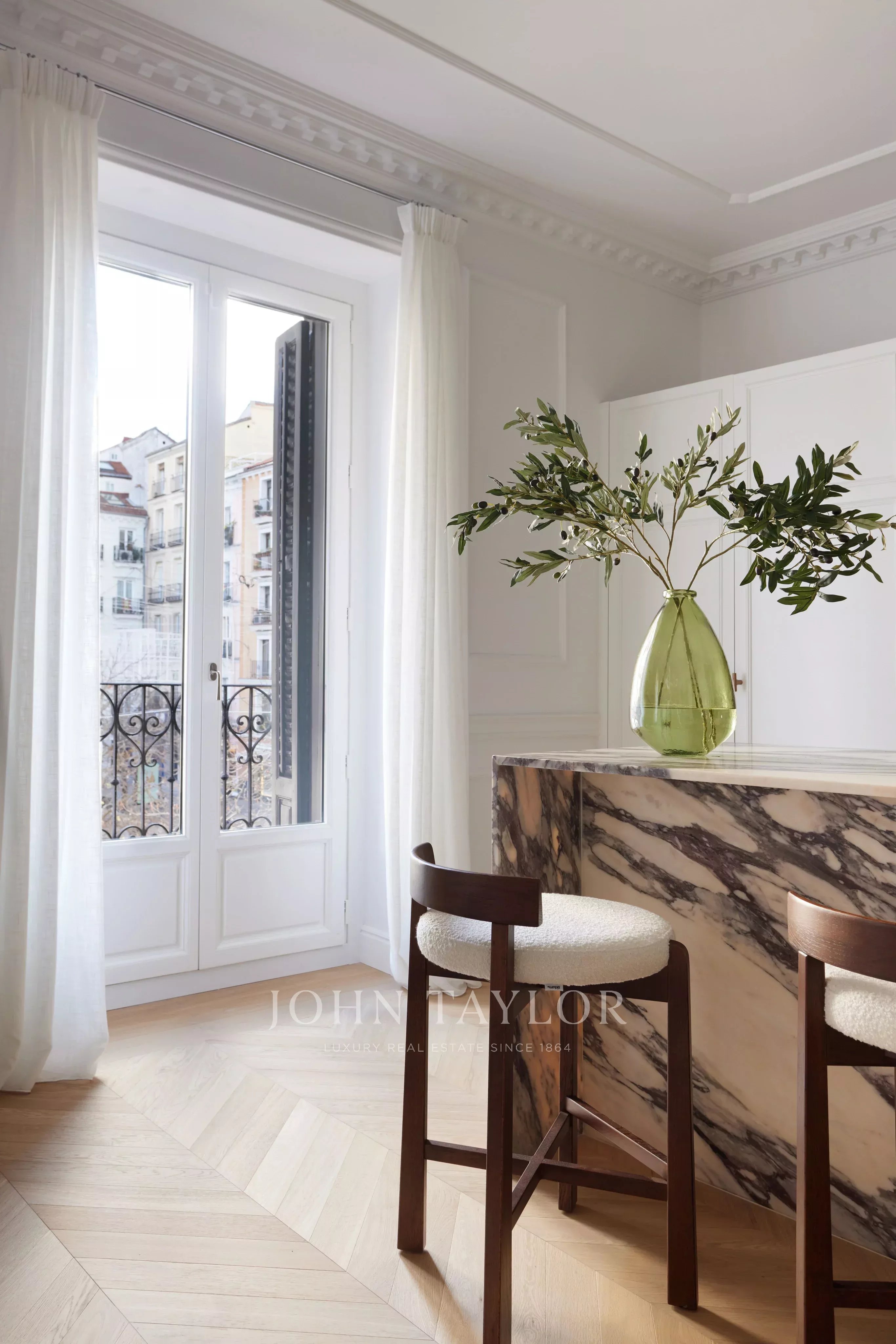 Located on the iconic Gravina street, this exclusive property represents a unique opportunity to reside in the vibrant heart of Justicia, surrounded by the most exquisite architecture and the most select cultural life of Madrid. Situated on the second floor of an elegant building from the early 20th century, fully renovated, the home has been the subject of a masterful designer renovation signed by a renowned interior designer. With ceilings exceeding 3.10 meters in height and a south orientation that floods each room with natural light through its French balconies, the project redefines contemporary luxury while scrupulously respecting the historic soul of the building.