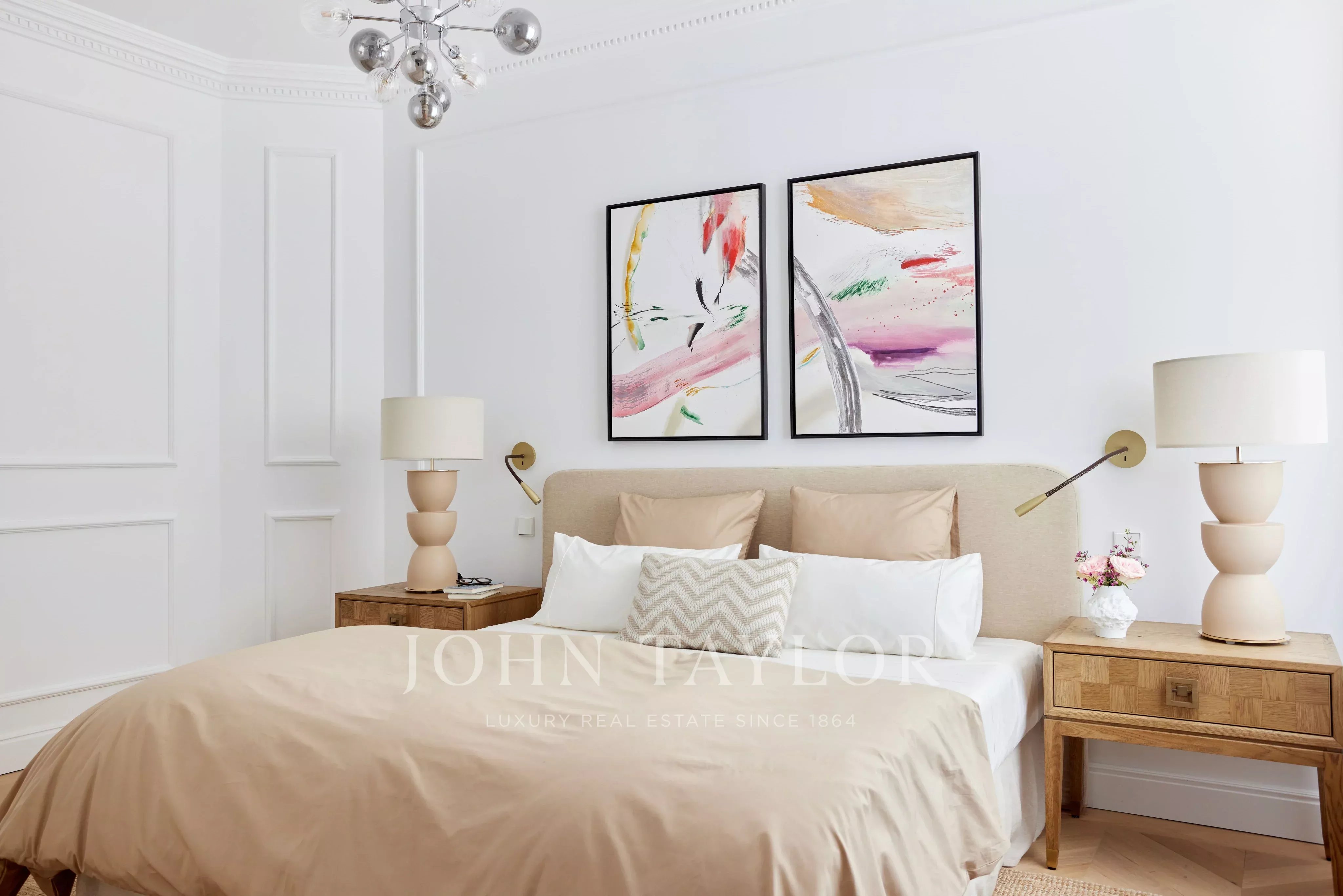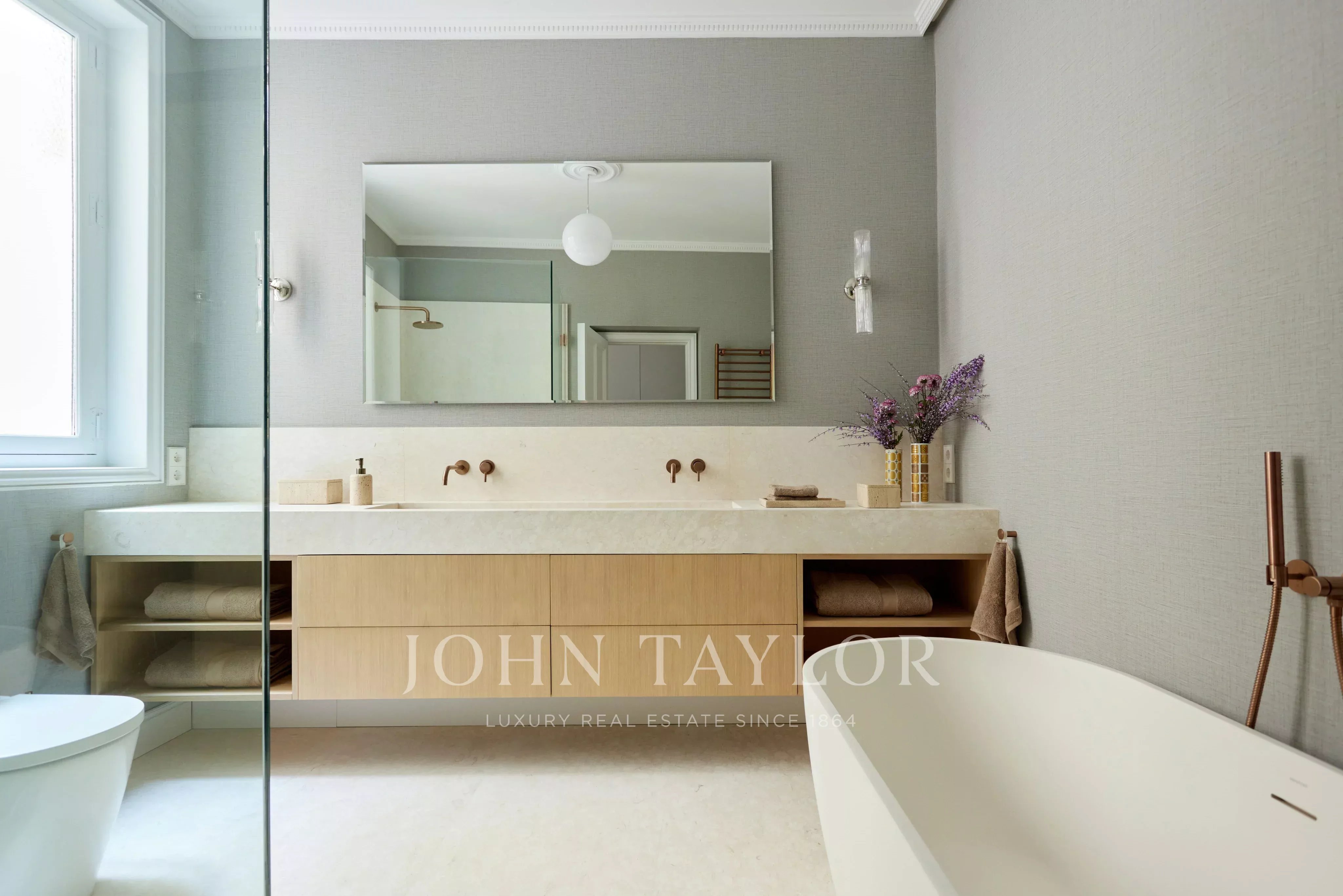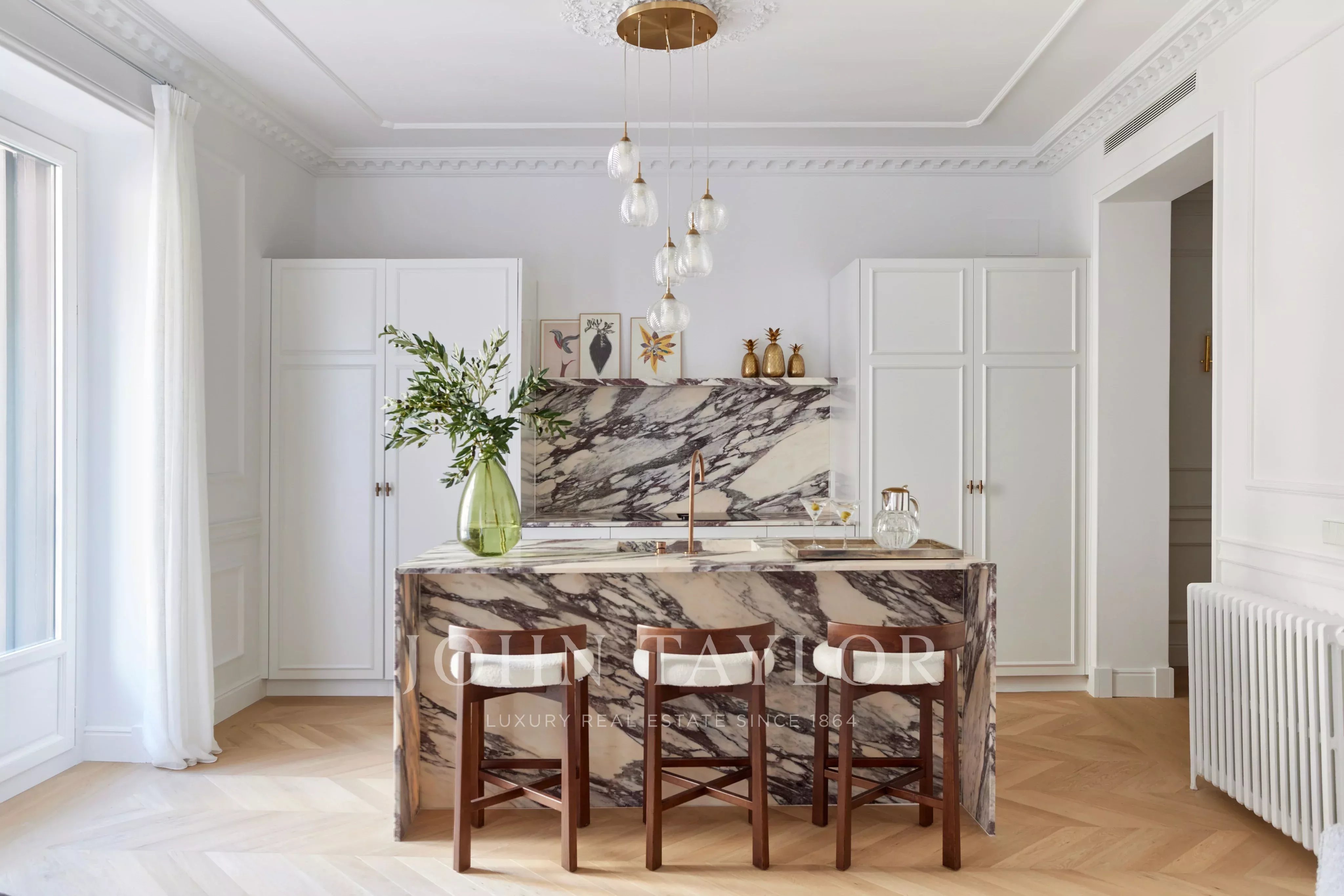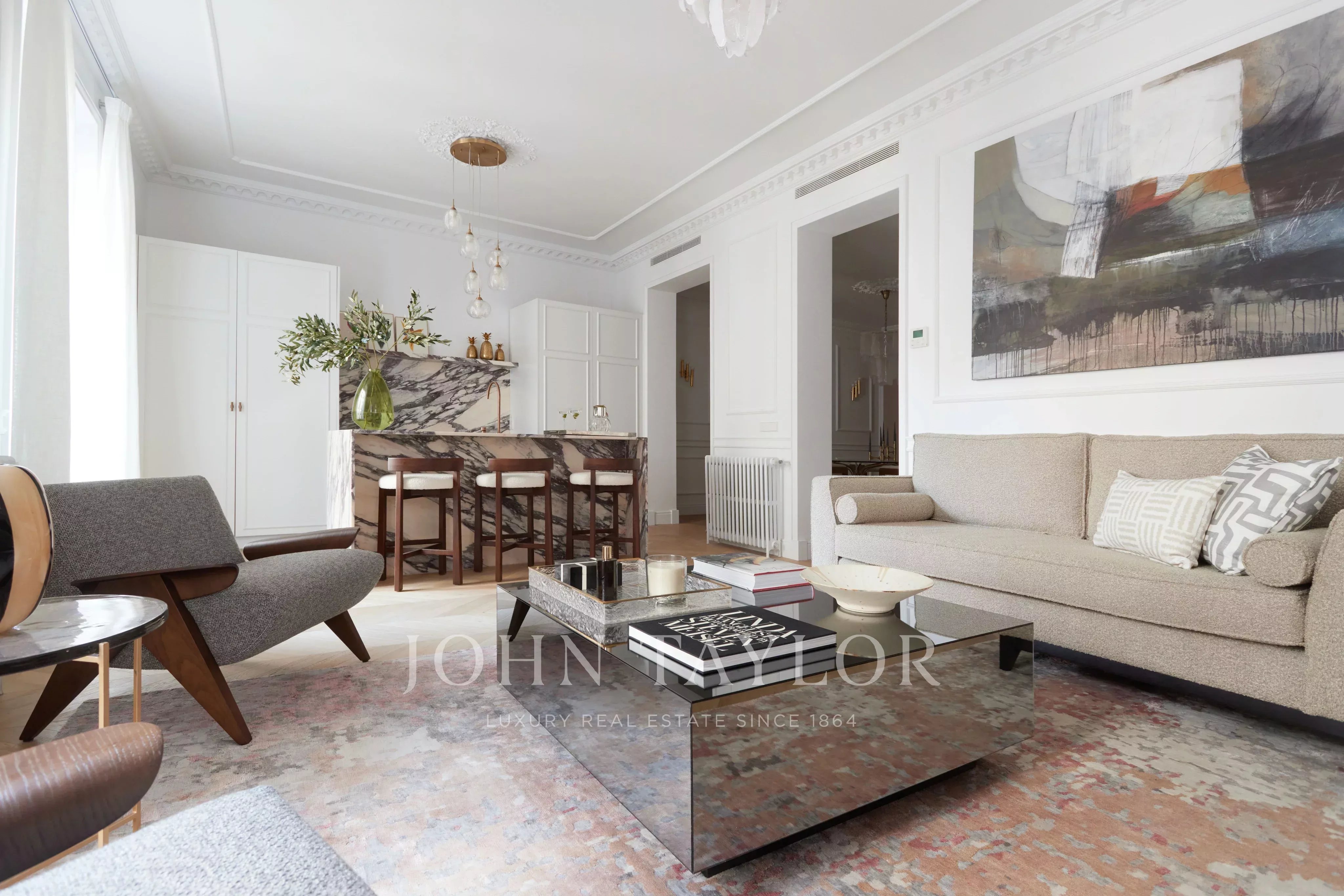 Located on the iconic Gravina street, this exclusive property represents a unique opportunity to reside in the vibrant heart of Justicia, surrounded by the most exquisite architecture and the most select cultural life of Madrid. Situated on the second floor of an elegant building from the early 20th century, fully renovated, the home has been the subject of a masterful designer renovation signed by a renowned interior designer. With ceilings exceeding 3.10 meters in height and a south orientation that floods each room with natural light through its French balconies, the project redefines contemporary luxury while scrupulously respecting the historic soul of the building.