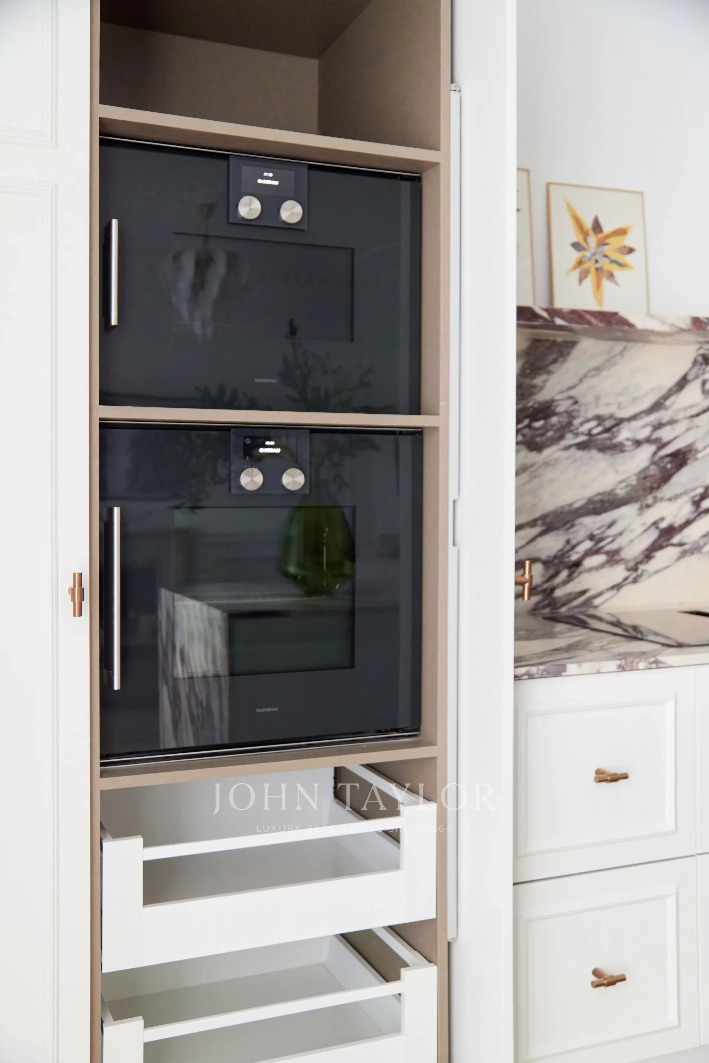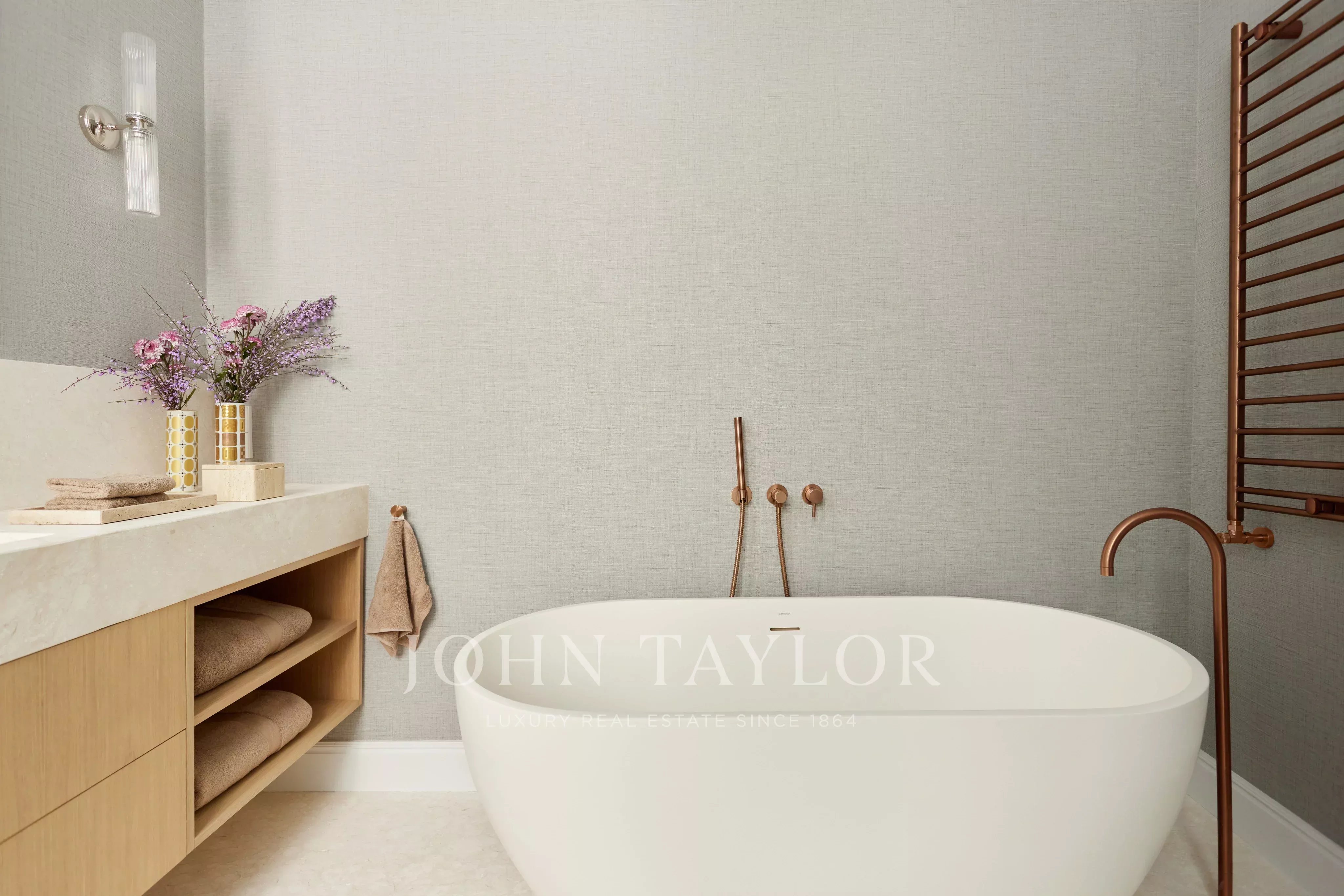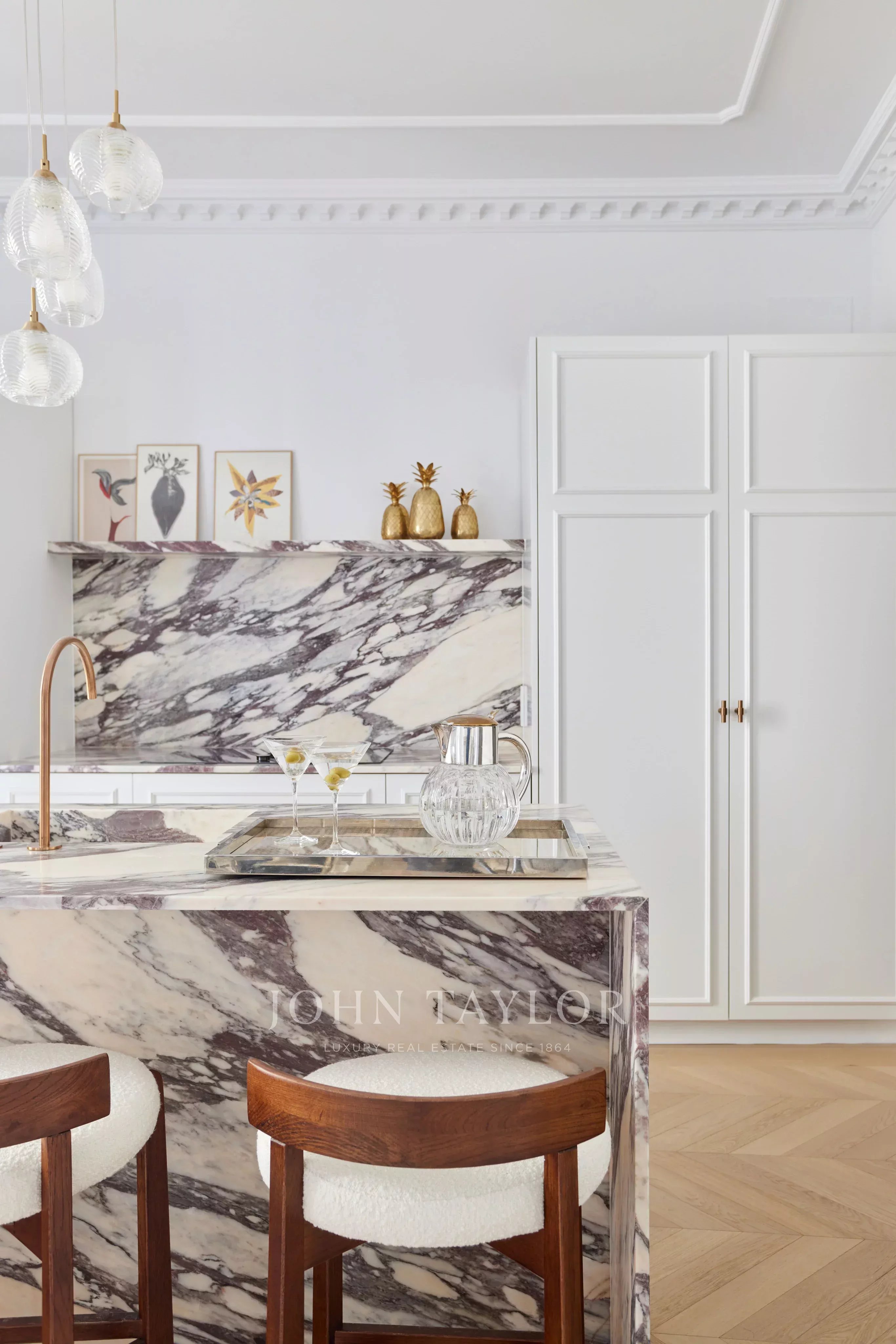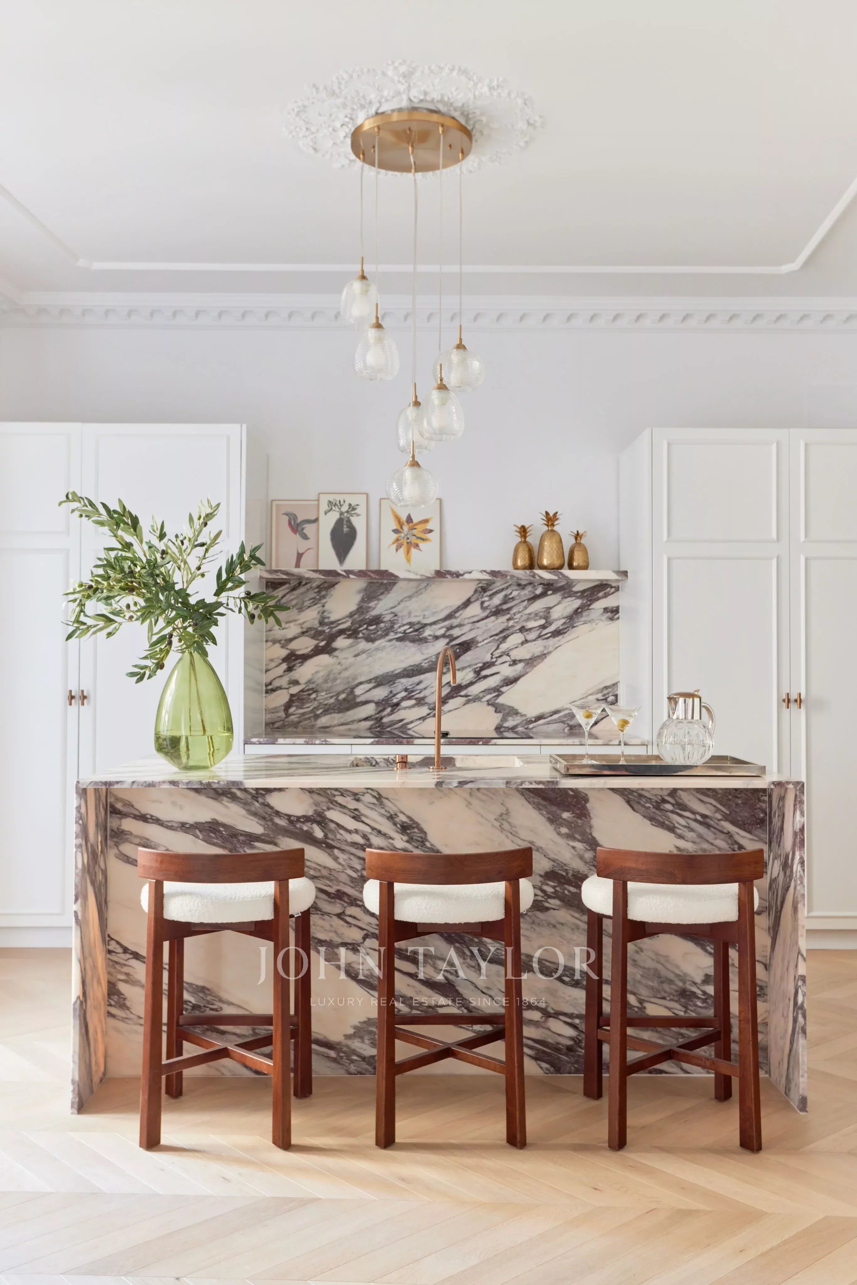 The social area unfolds in fluid and connected spaces, where a stately living room presided over by an antique fireplace harmoniously integrates with an open-concept kitchen. This designer piece, equipped with Gaggenau appliances and an imposing Calacatta Viola stone island, lives alongside an independent dining room that perfectly balances visual openness with necessary privacy. The private area houses three en-suite bedrooms conceived as serene refuges, highlighting the master suite with its elegant walk-in closet and a limestone-clad bathroom with natural light.
