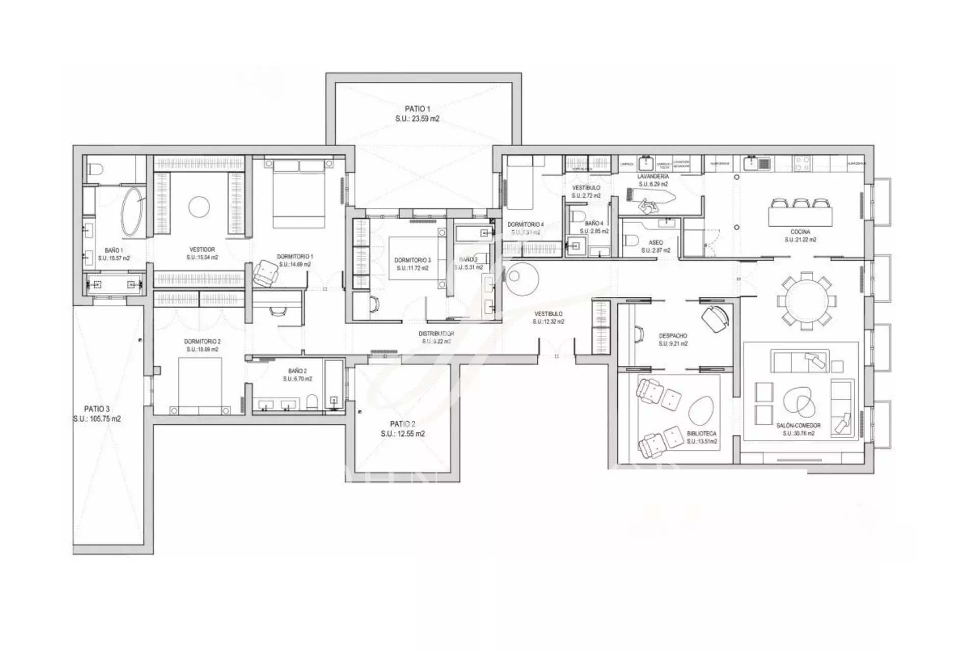Located on the third floor of a classic 1900's building, in the sought-after neighborhood of Justicia, this 251m2 family apartment consists of 4 bedrooms with en-suite bathrooms, plus an office area, a separate library and a full laundry area. The living room and kitchen are located on the light-flooded exterior, with its 4 balconies facing the street and its high ceilings with moldings.
