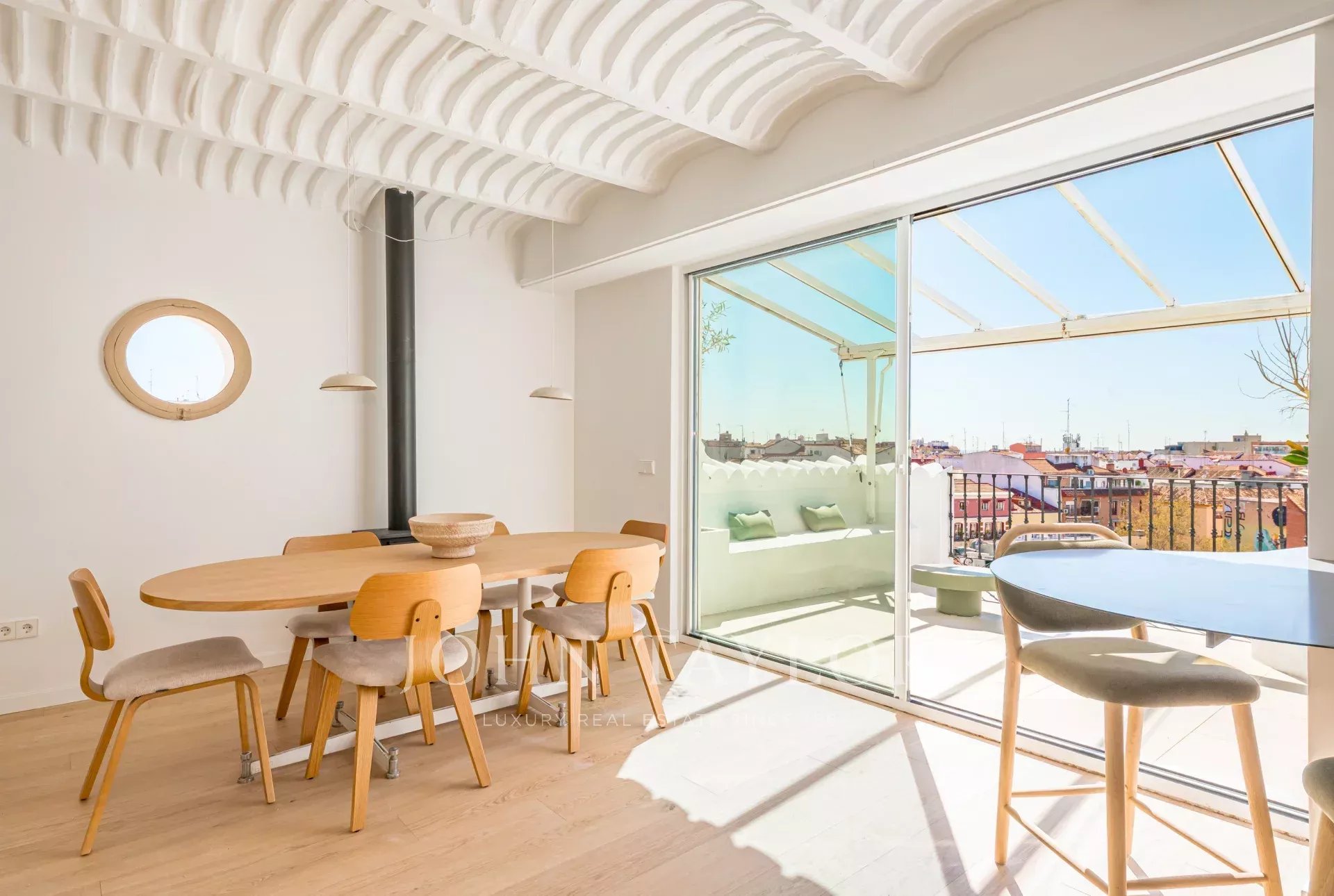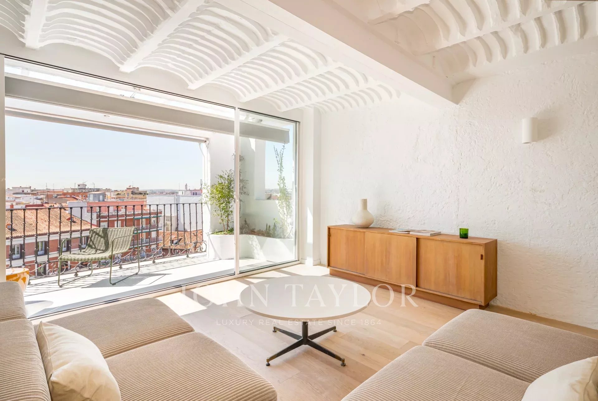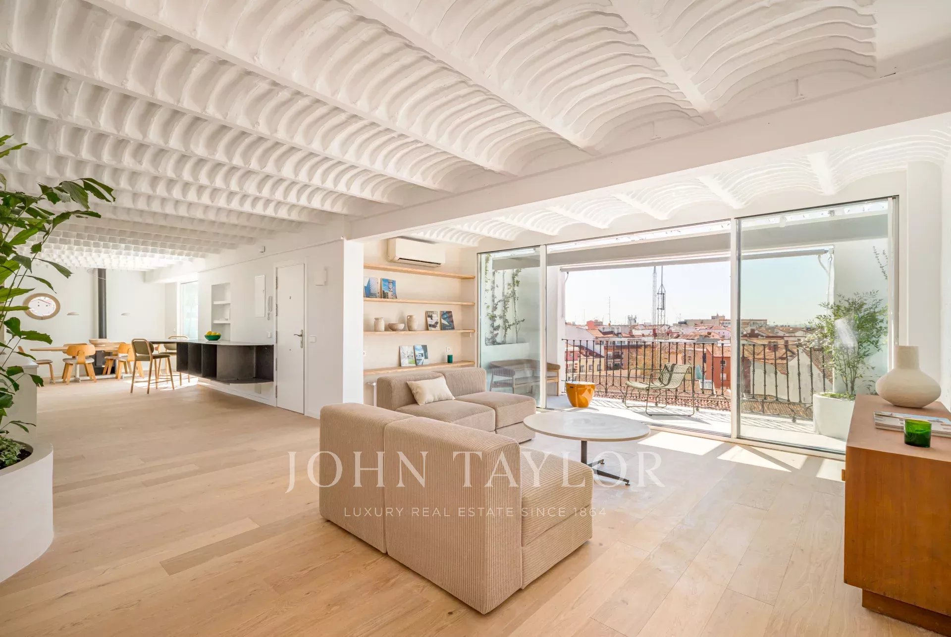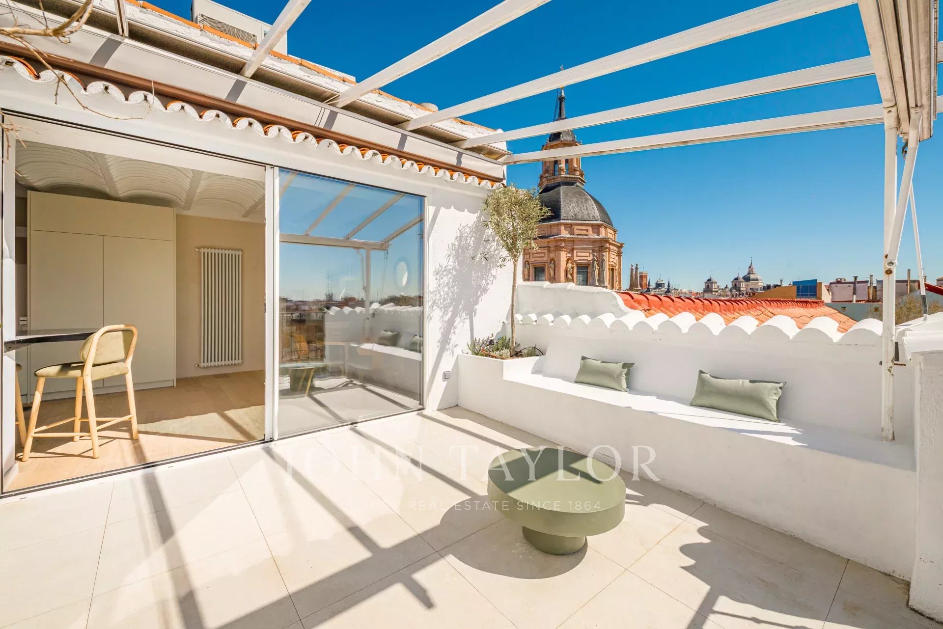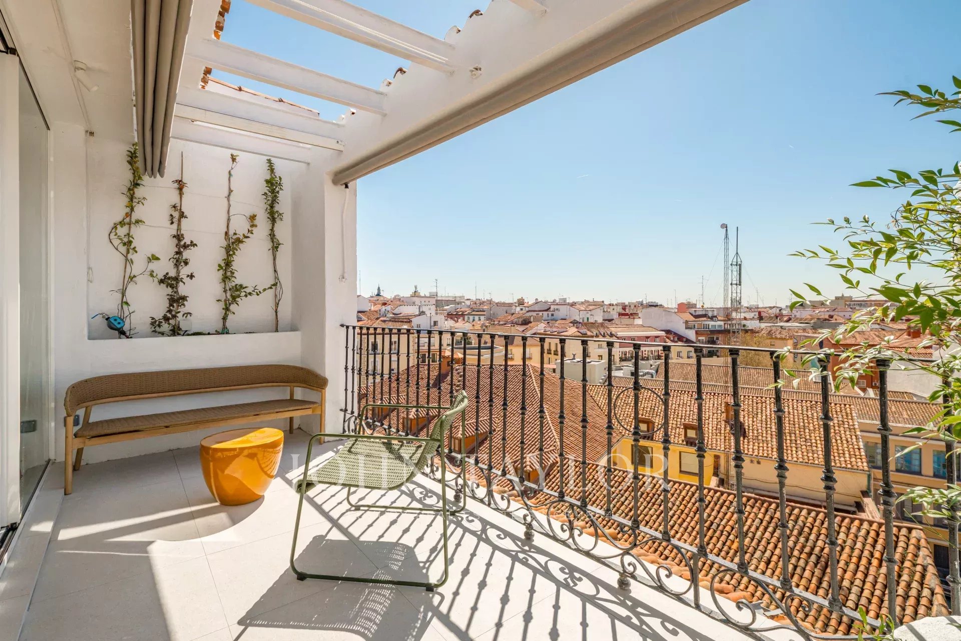 In the heart of the vibrant La Latina neighborhood, in a beautiful building dating back to 1870, we find this fabulous penthouse with two terraces. It stands out for its spectacular design, unmatched views, and south-facing orientation, which floods the property with light.