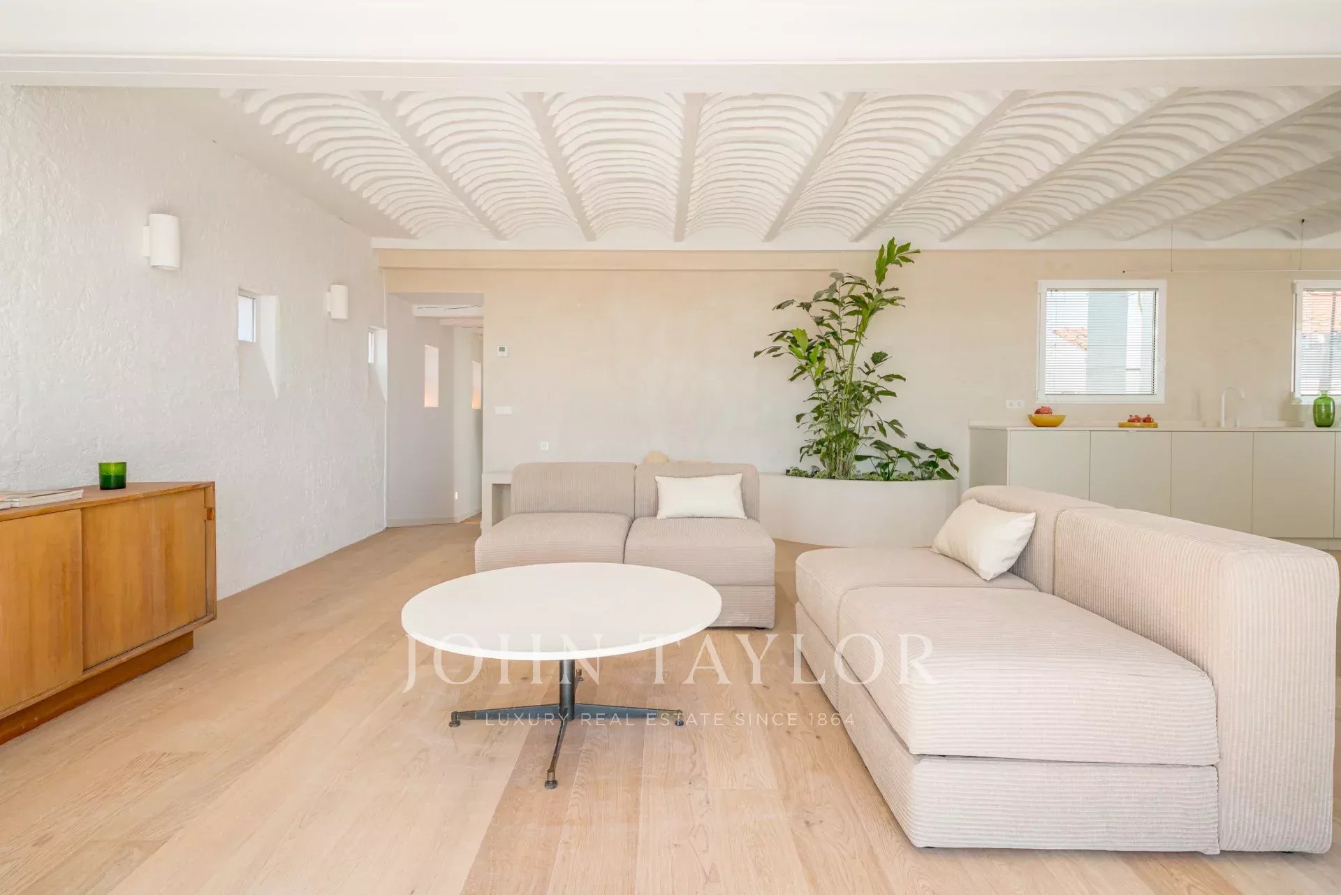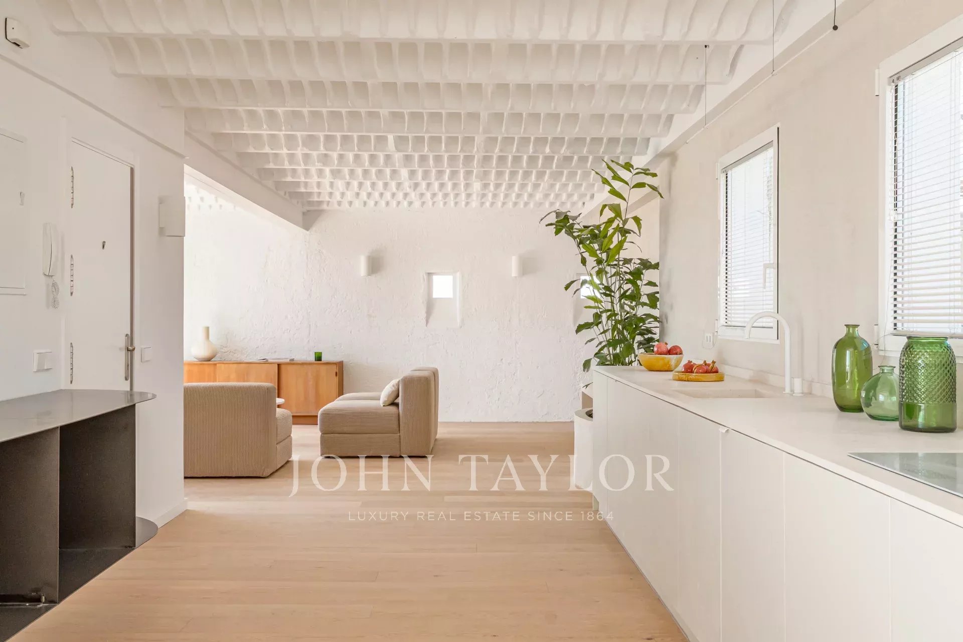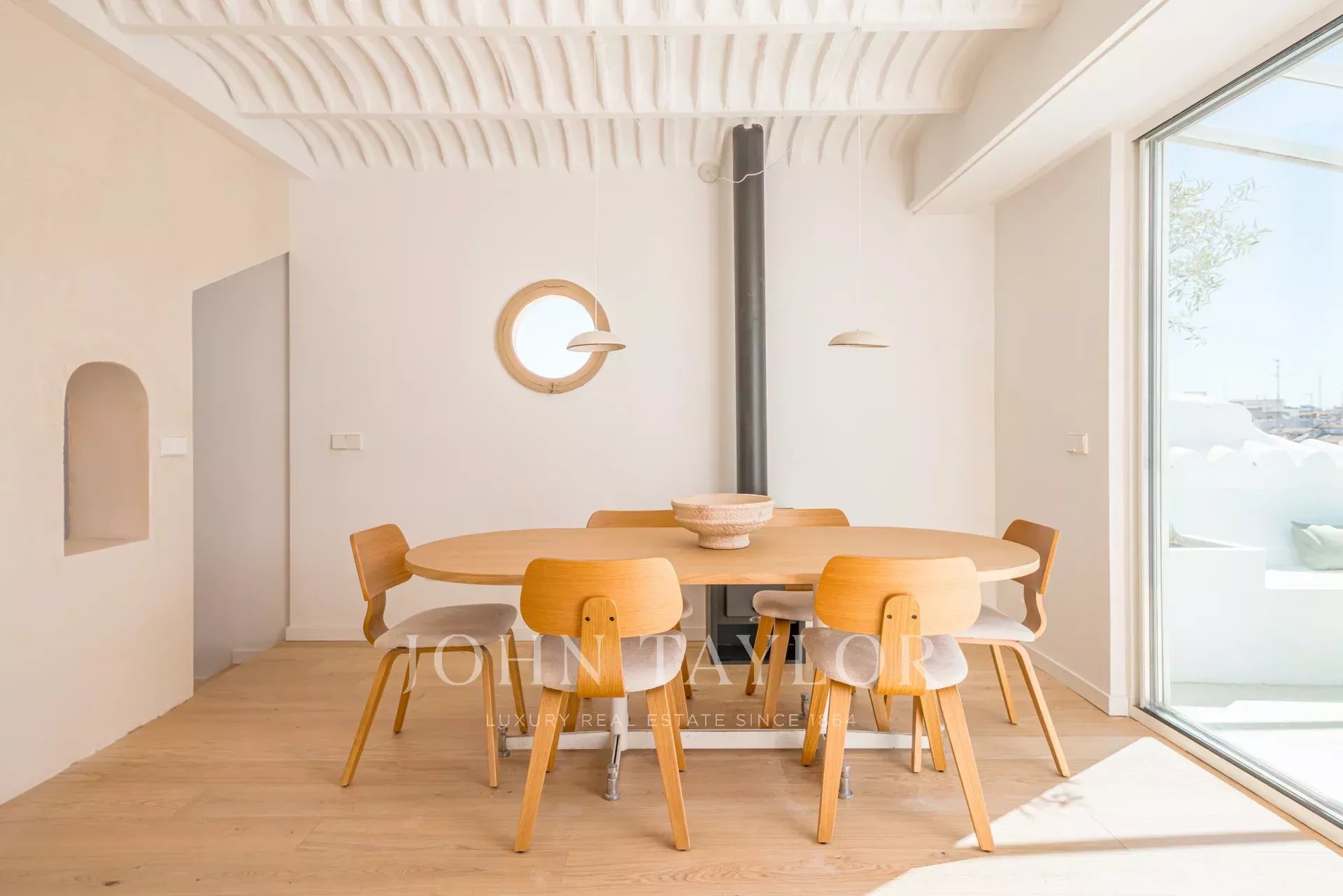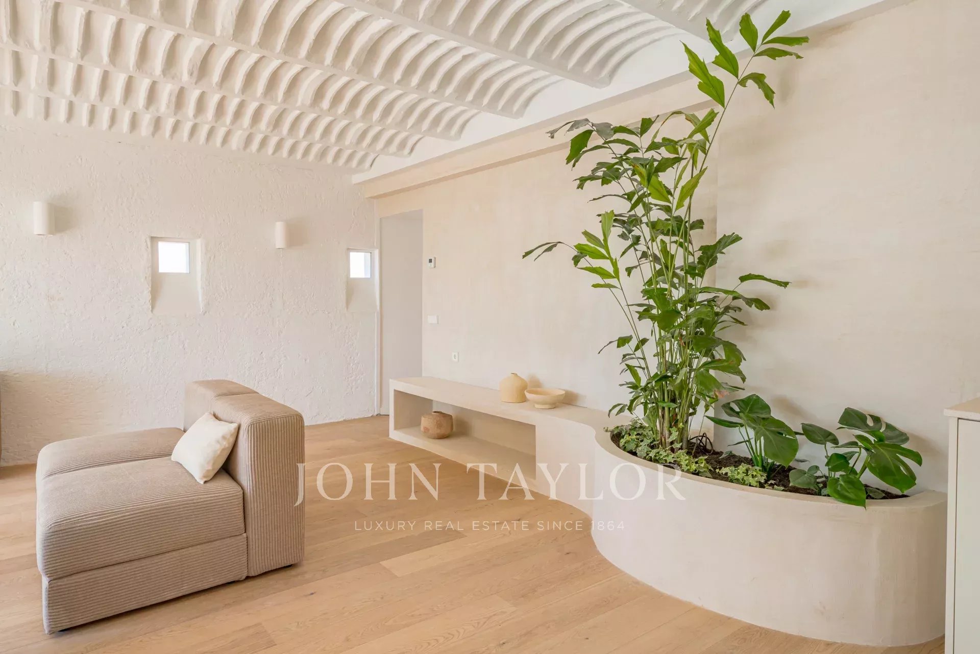 Meticulously renovated down to the last detail, it features a beautiful open-plan social area with a living room, dining area, and kitchen, showcasing spectacular Catalan vaulted ceilings and access to two stunning terraces—14 m² and 11 m² respectively—both facing south. There is also a convenient guest toilet.