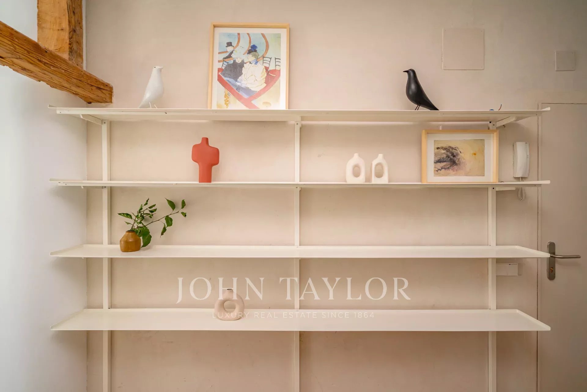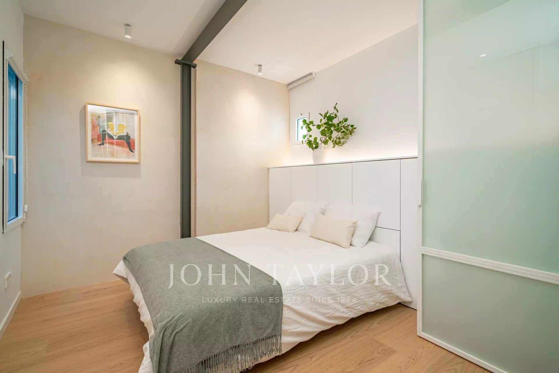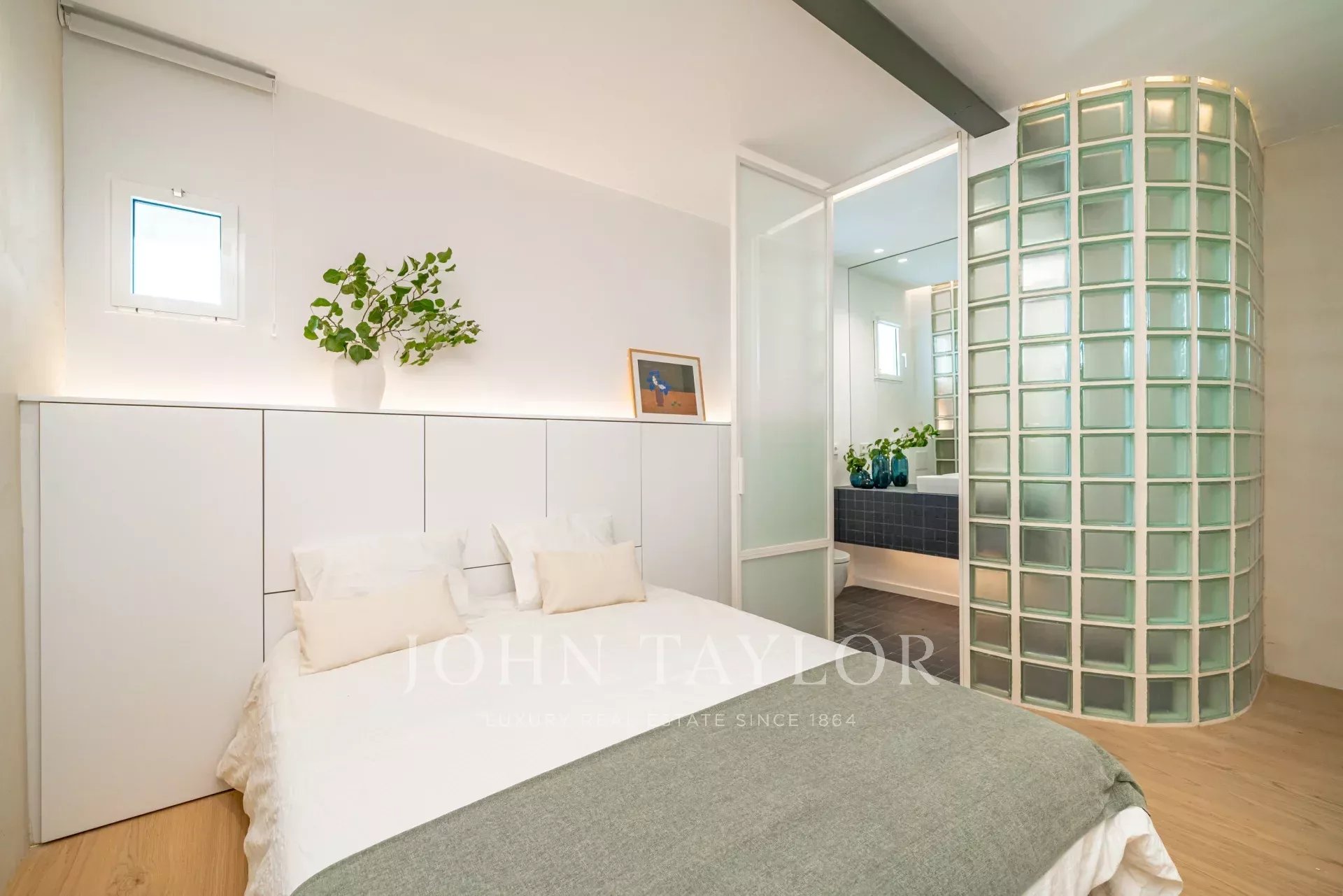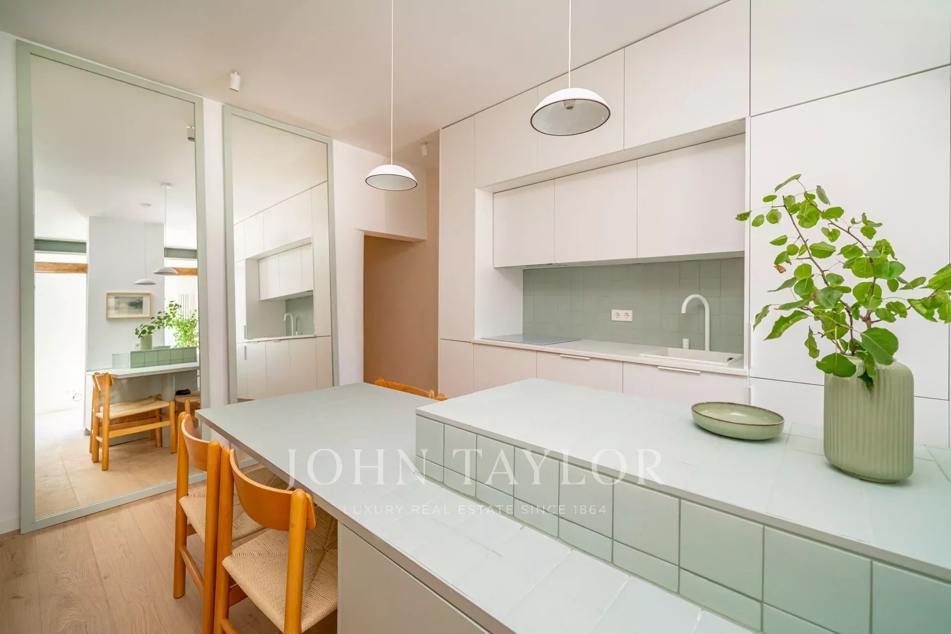 The apartment features a charming living room with a balcony overlooking the street, next to which there is a modular glass-enclosed room with a hidden bed that can serve as a guest bedroom or office. The fully equipped kitchen includes an island and dining area. There are also two additional bedrooms and two bathrooms, the main one en suite.
