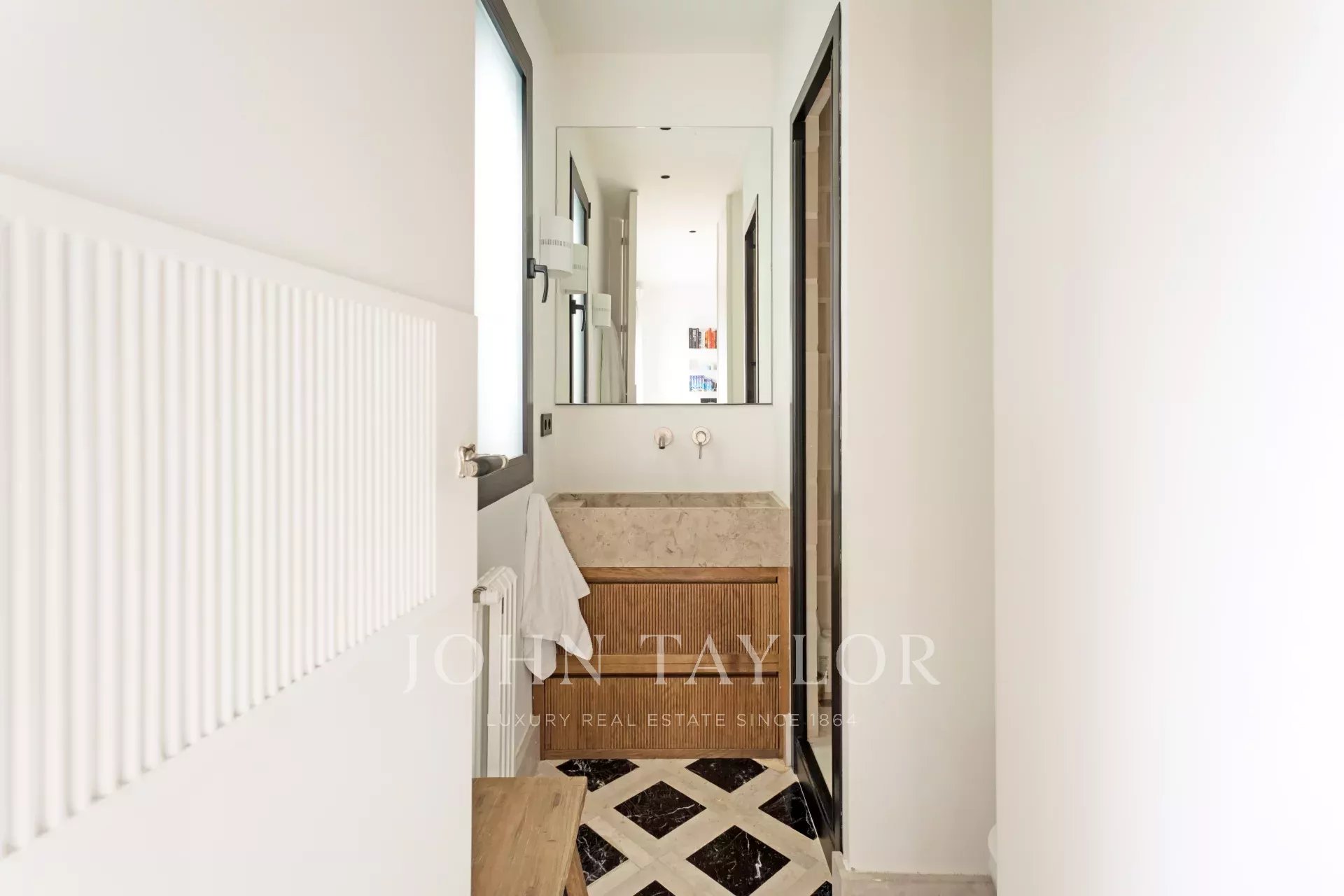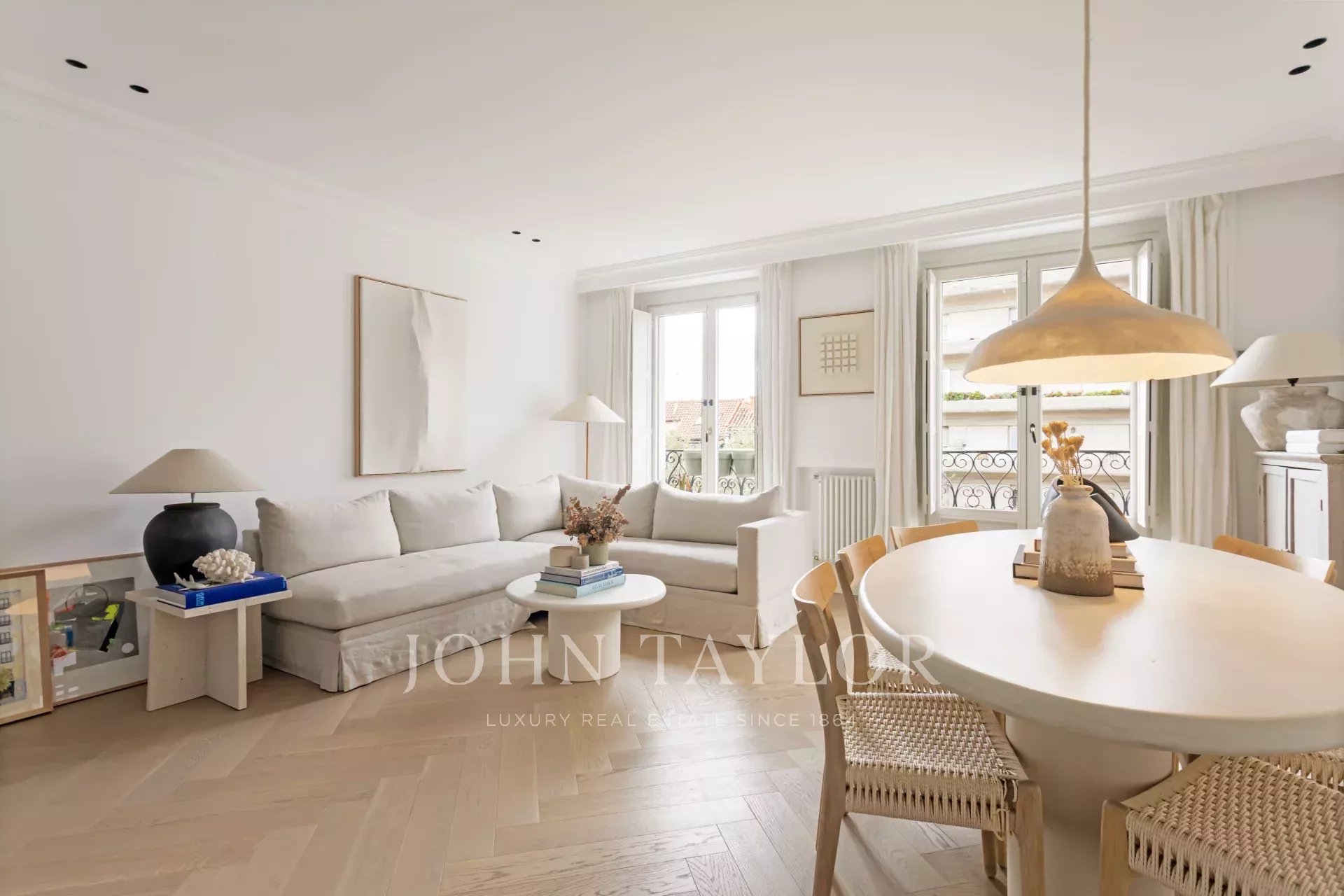 The living room, flooded with natural light thanks to its double-glazed windows and wooden shutters, offers unobstructed views of a landmark of modern urbanism, conveying a feeling of spaciousness and serenity. The south-west orientation guarantees constant luminosity throughout the day.