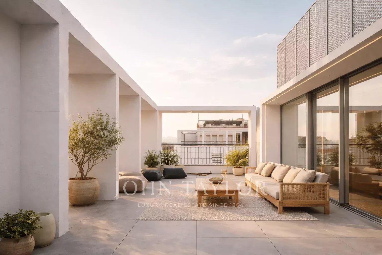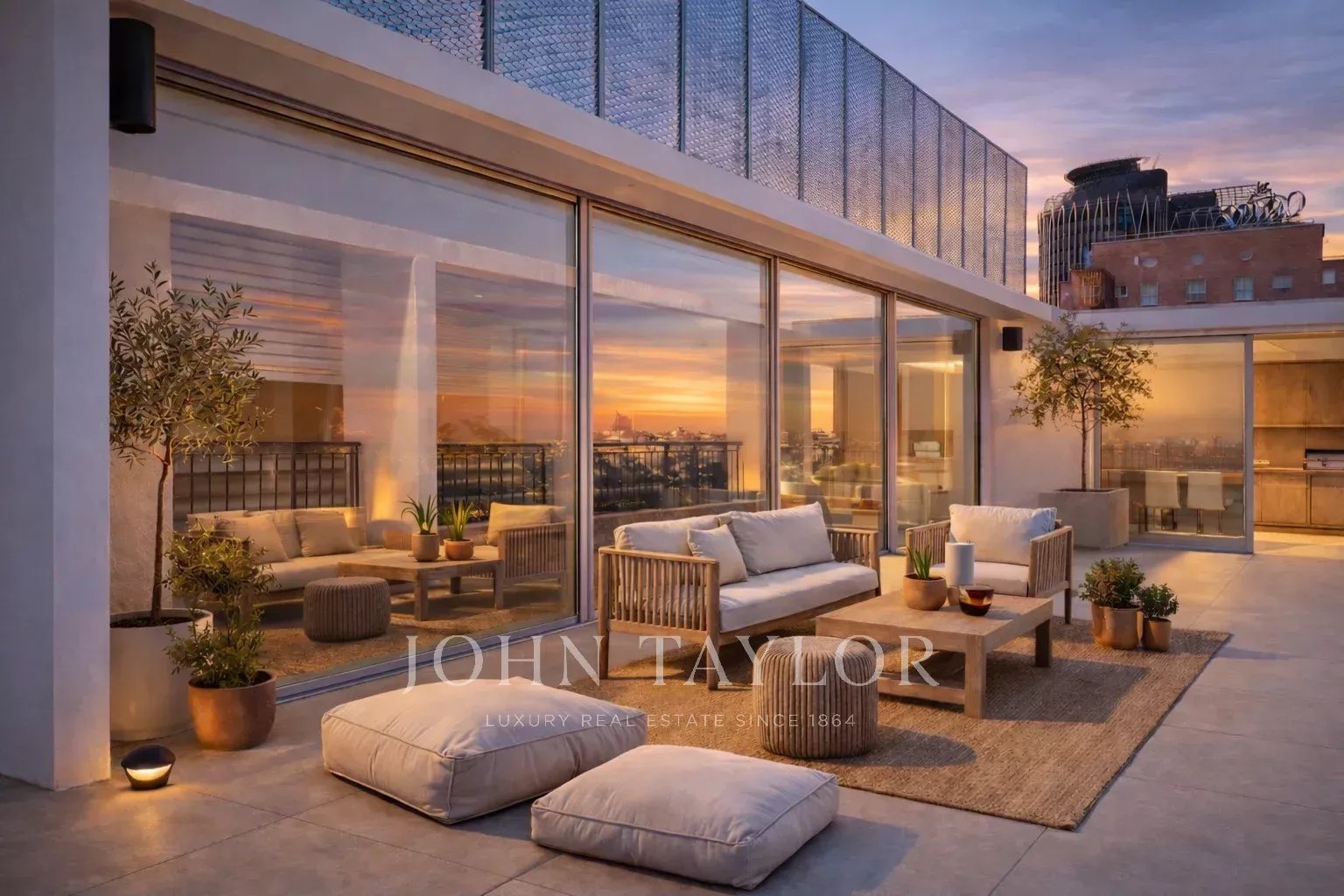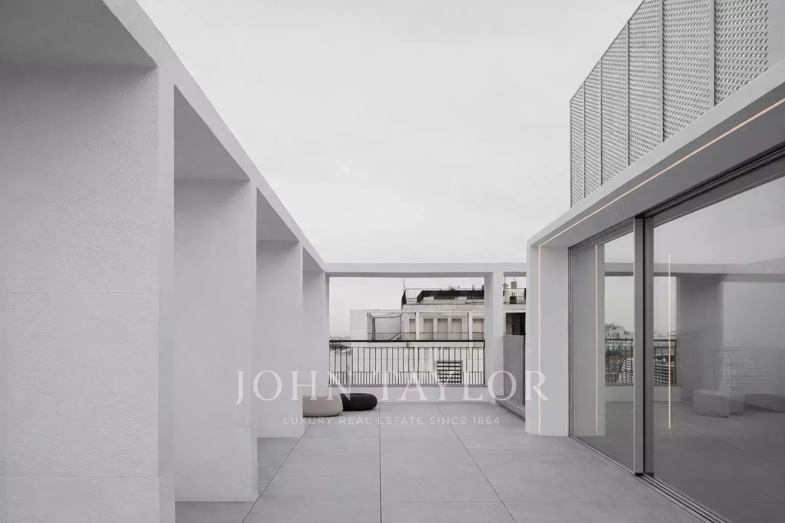 John Taylor presents this extraordinary duplex penthouse of contemporary design, with private pool, located in one of the most valued residential areas of Madrid.