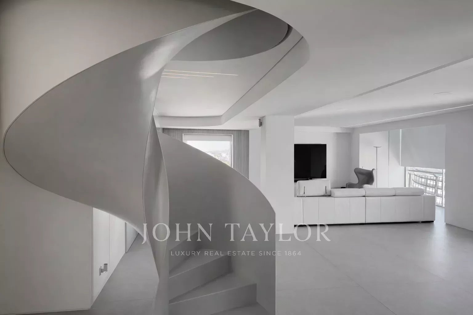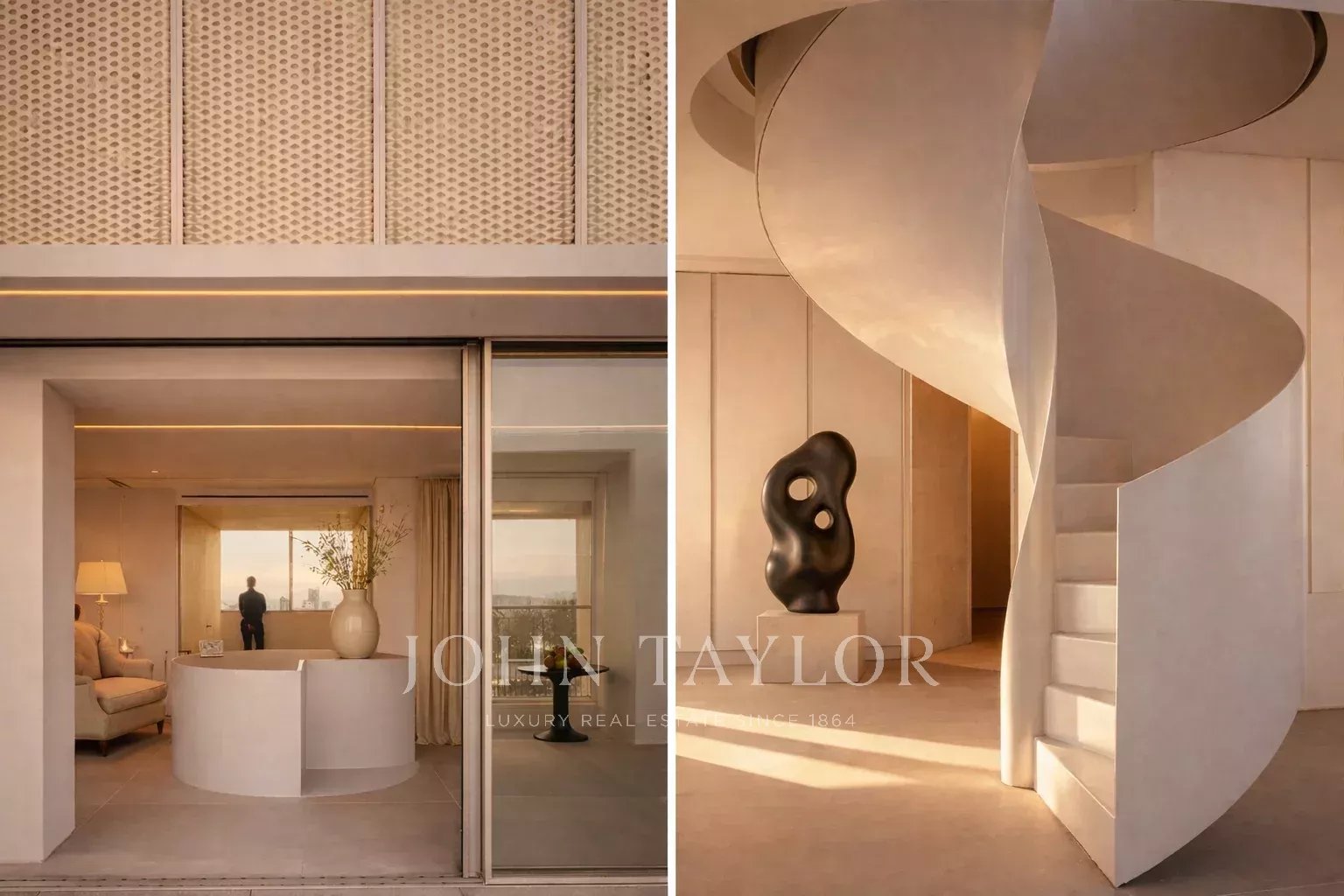 With a surface area of 462 m², the penthouse has been conceived under the highest quality standards, incorporating state-of-the-art home automation, underfloor heating, piped music, central heating, air conditioning and heated swimming pool. The high-end finishes, such as the large-format porcelain flooring and the interior staircase with a sculptural design, reinforce the sophisticated character of the complex.