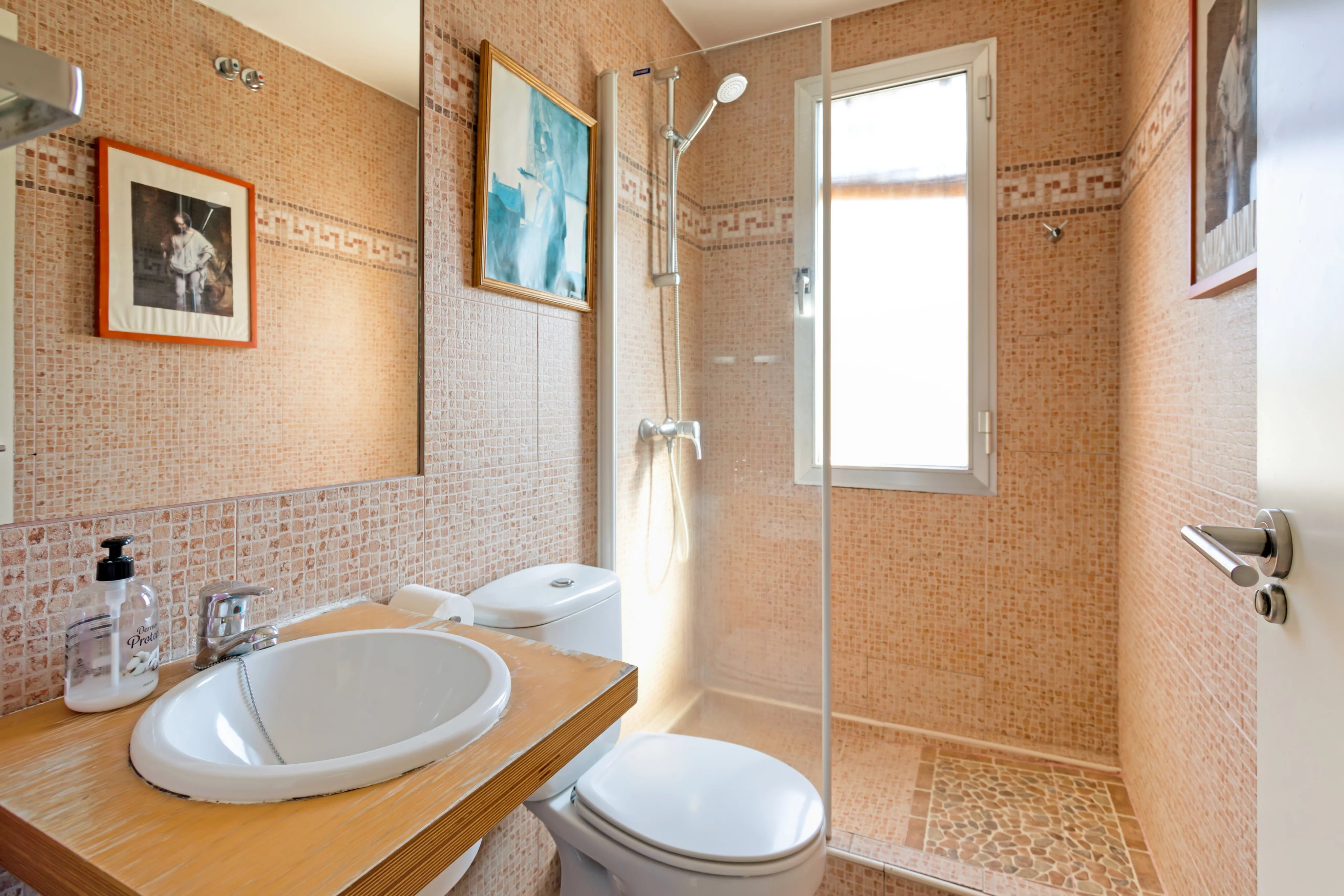 The sleeping area offers three bedrooms, two of them with an en-suite bathroom, creating an intimate and comfortable space. A third bathroom completes the home, intended for guests or as support for the additional bedroom.