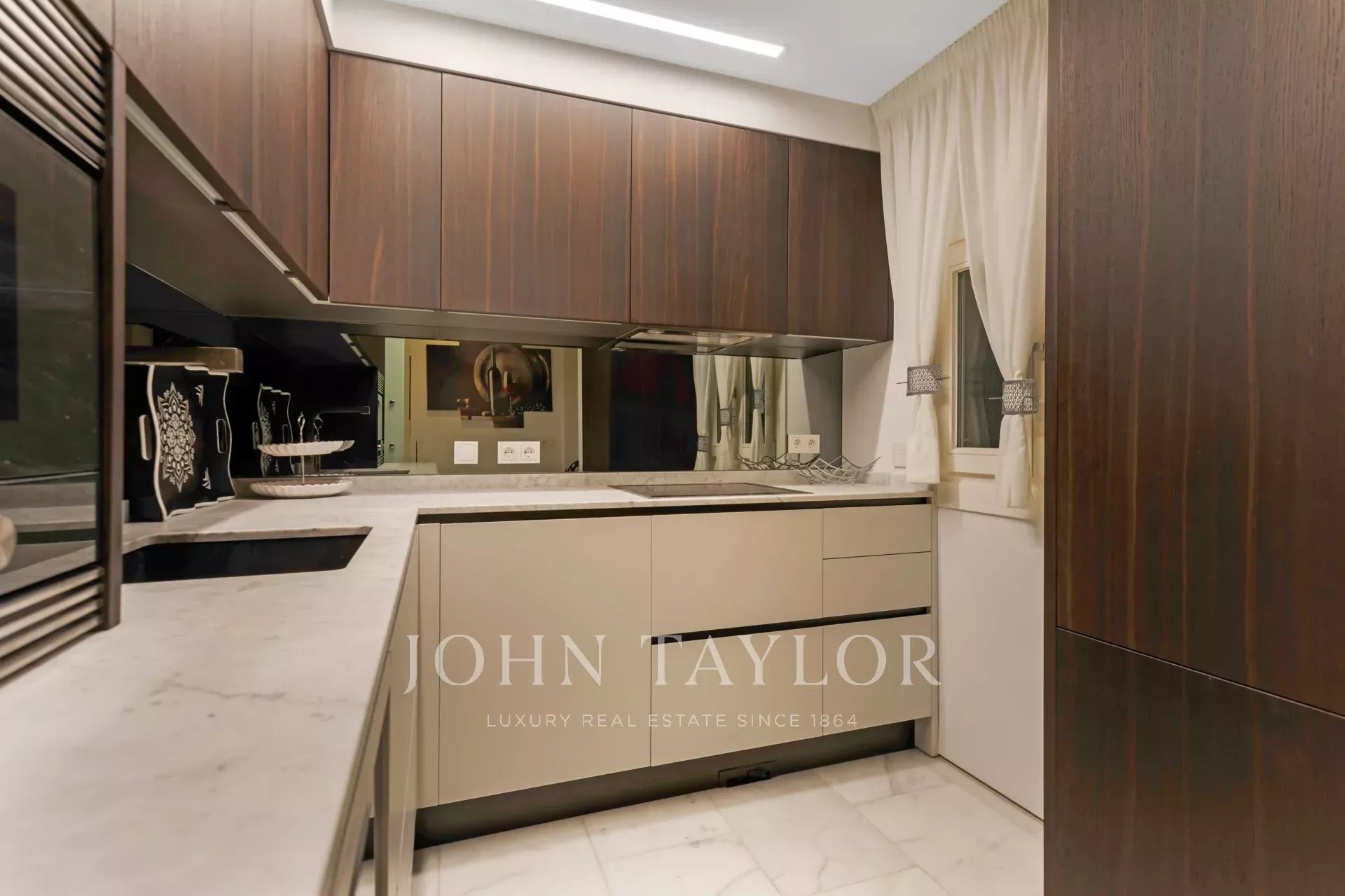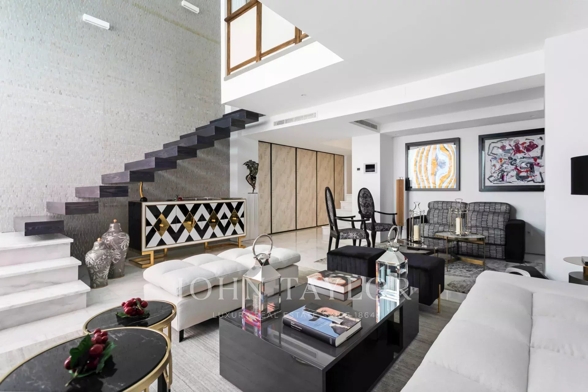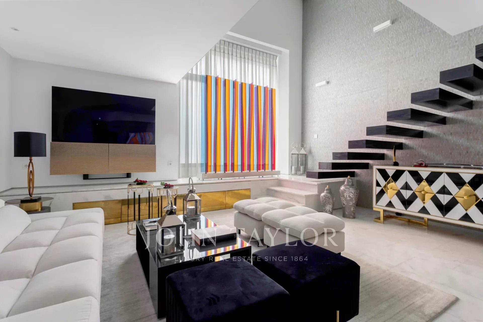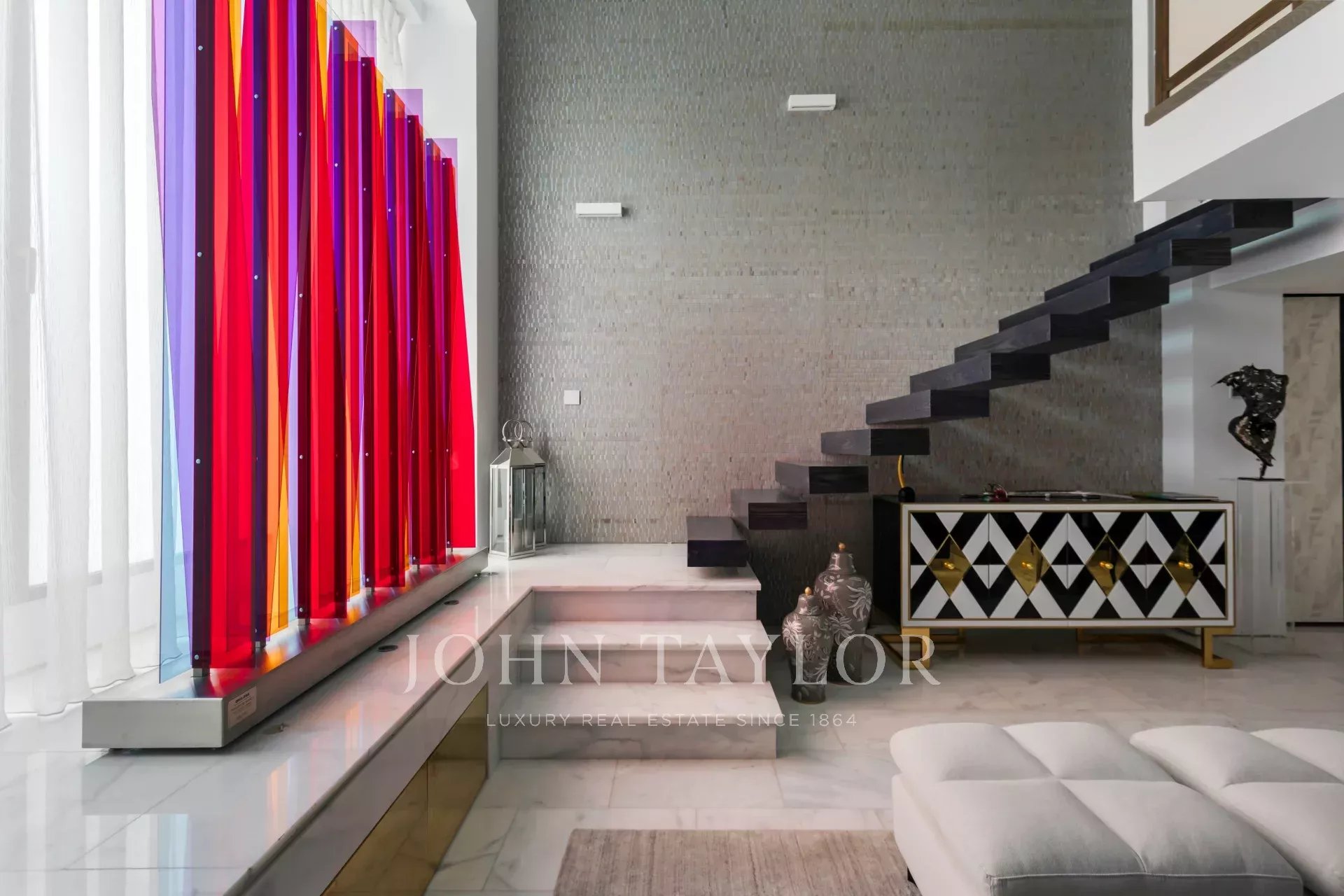 On the access floor a large hall, leads to a double height living room consisting of two rooms and with a wonderful and bright south facing window. Decorated with a fabulous piece of art by Carlos Eduardo Cruz-Díez not included in the price of the house. Sound ambience is Bang & Olufsen. On this same floor dining room, kitchen equipped with high-end appliances and guest toilet.