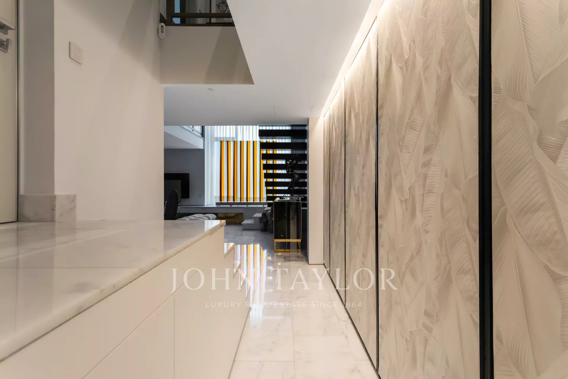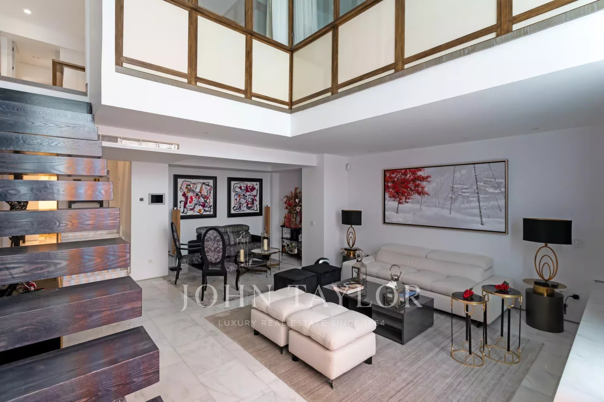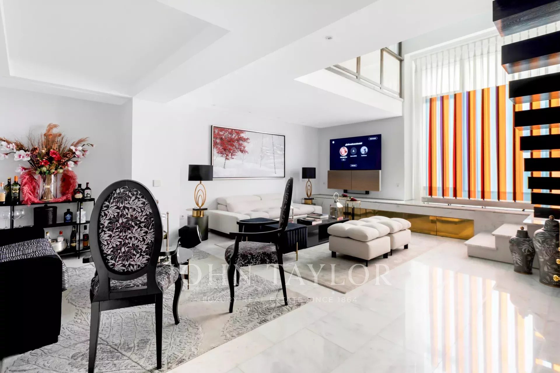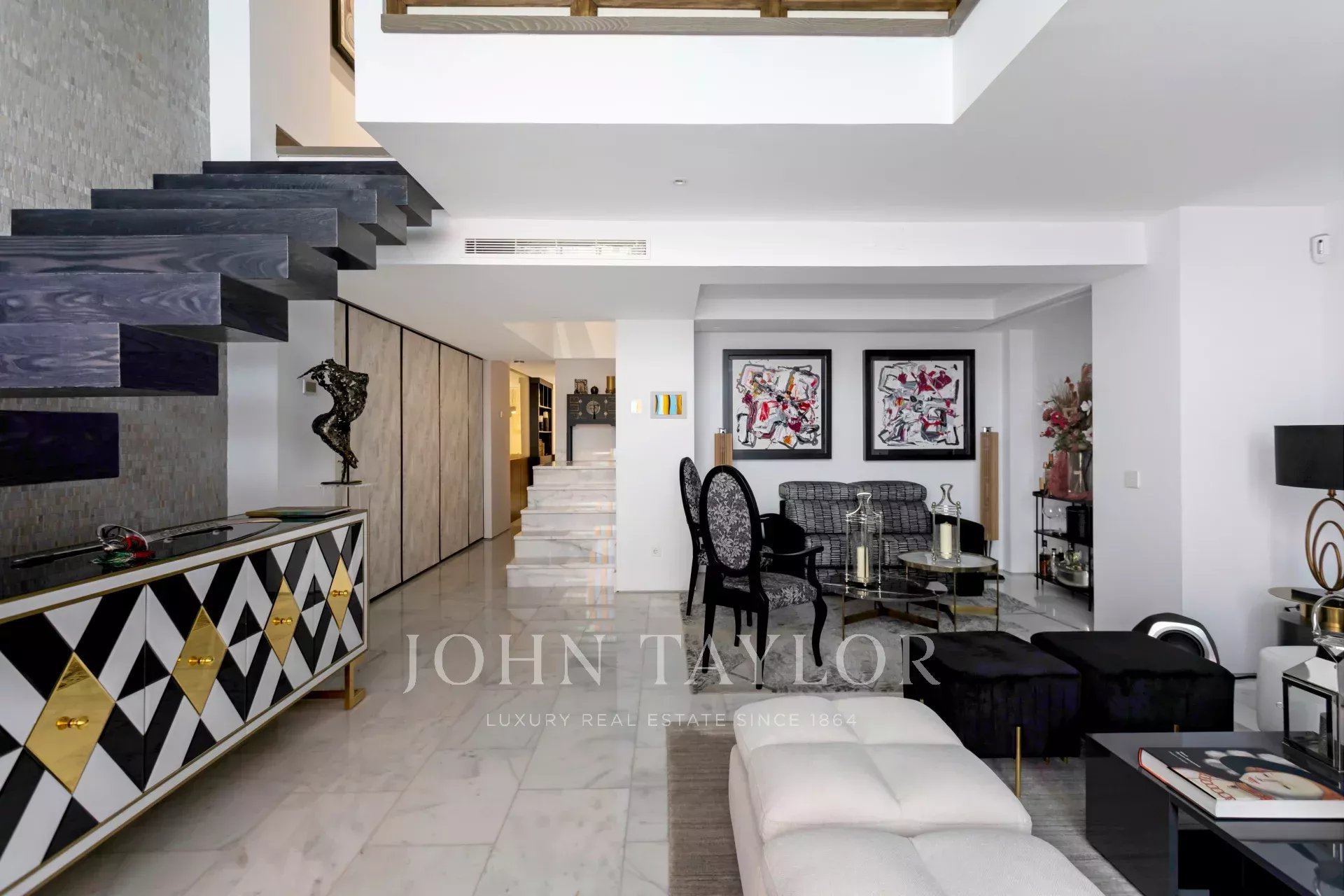 On the access floor a large hall, leads to a double height living room consisting of two rooms and with a wonderful and bright south facing window. Decorated with a fabulous piece of art by Carlos Eduardo Cruz-Díez not included in the price of the house. Sound ambience is Bang & Olufsen. On this same floor dining room, kitchen equipped with high-end appliances and guest toilet.