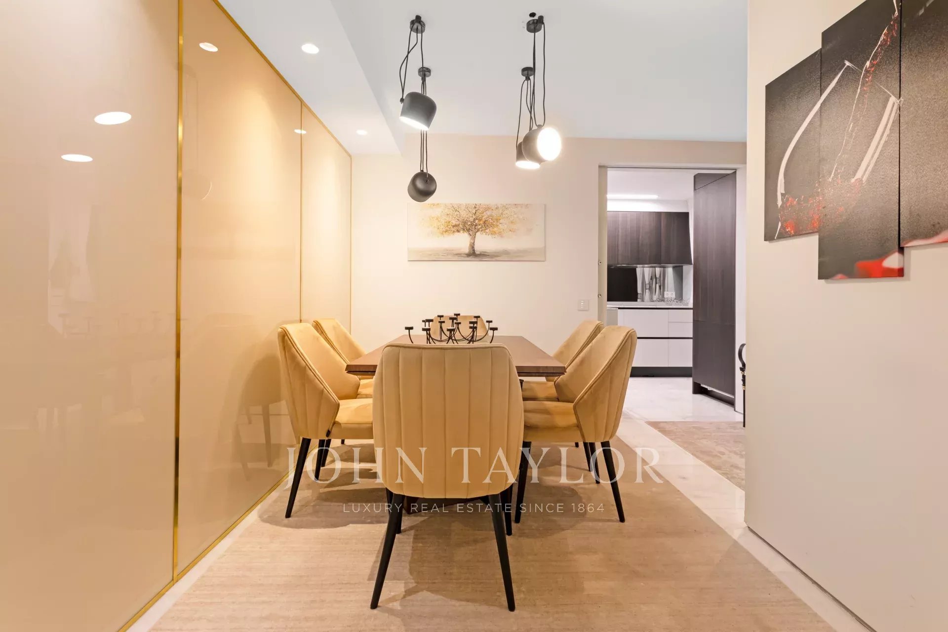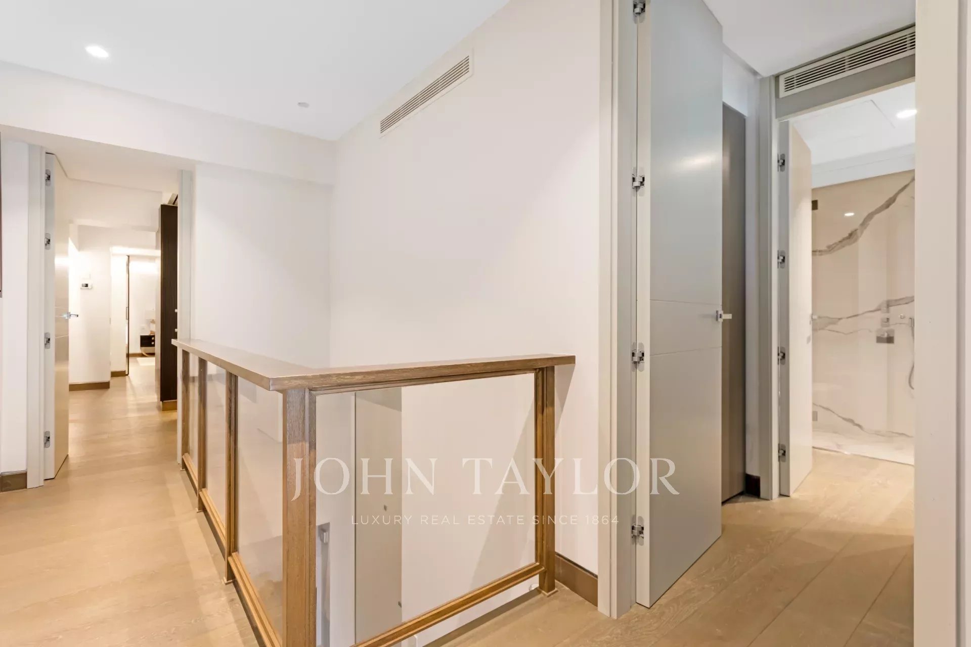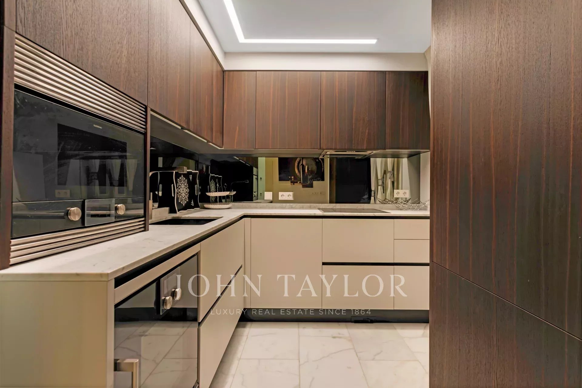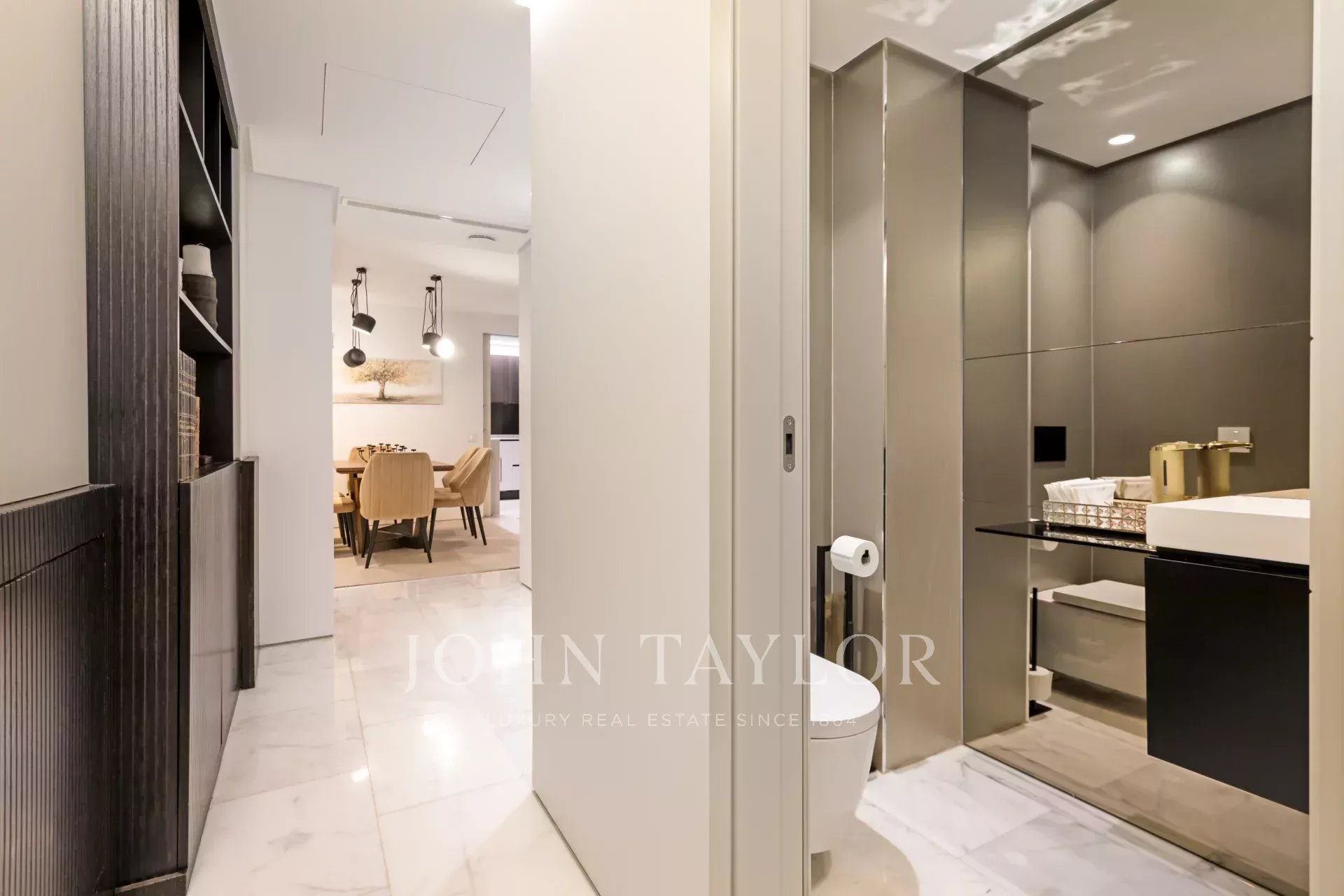 On the access floor a large hall, leads to a double height living room consisting of two rooms and with a wonderful and bright south facing window. Decorated with a fabulous piece of art by Carlos Eduardo Cruz-Díez not included in the price of the house. Sound ambience is Bang & Olufsen. On this same floor dining room, kitchen equipped with high-end appliances and guest toilet.