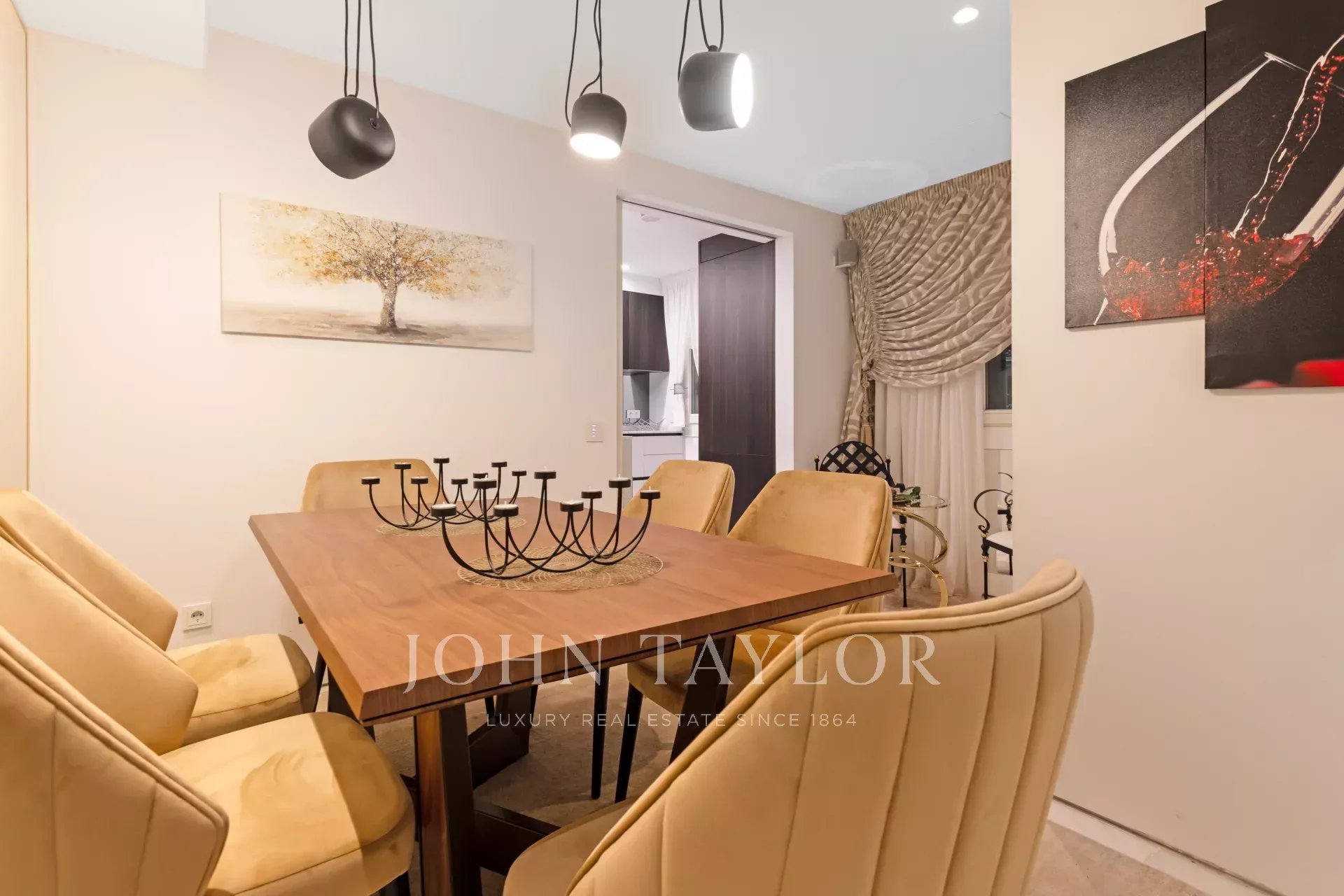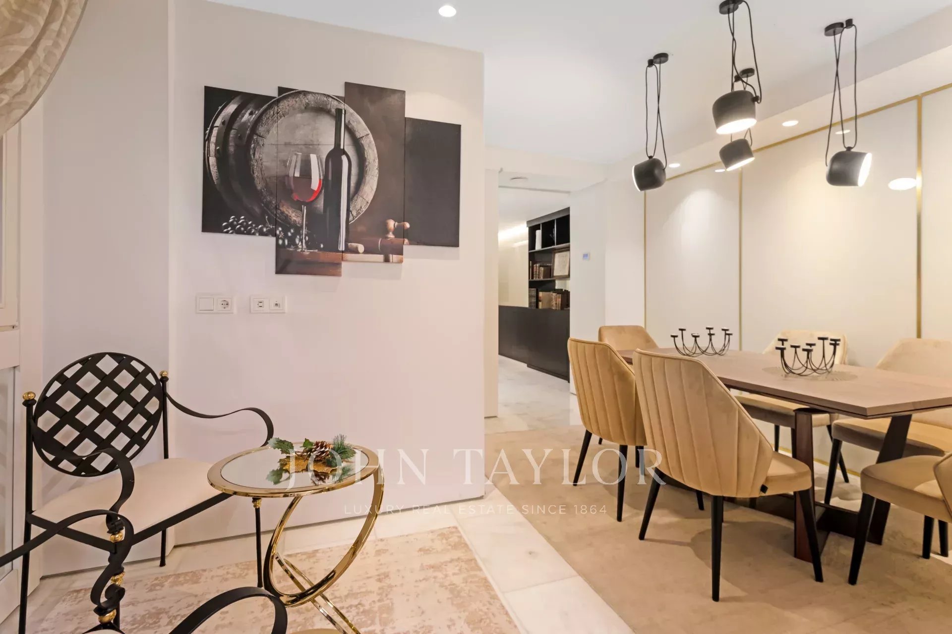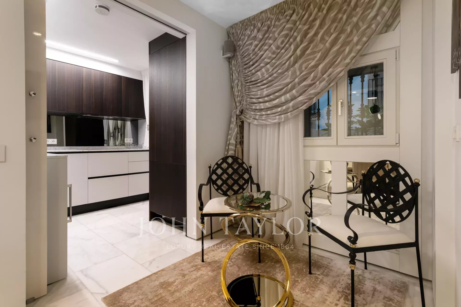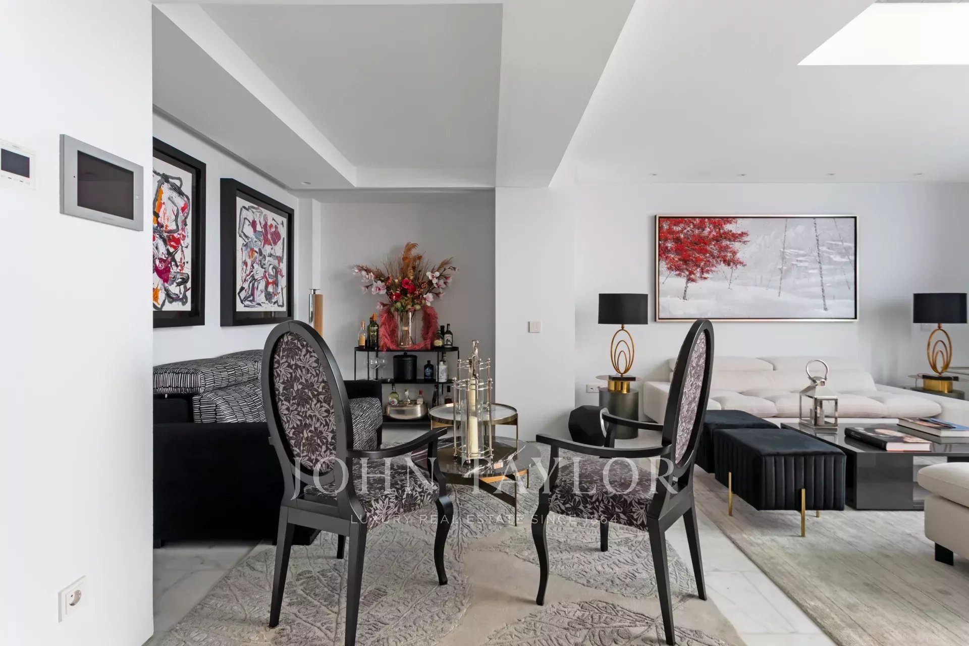 Spectacular renovated and furnished duplex in the center of the neighborhood of Los Jerónimos. One of the best buildings that was completely rehabilitated in 2020 and in which the classic facade, the central patío and the entrance of great historical value have been maintained. Located next to the entrance of the Retiro Park. The property has an area of 240m2 spread over two floors. Top quality finishes.