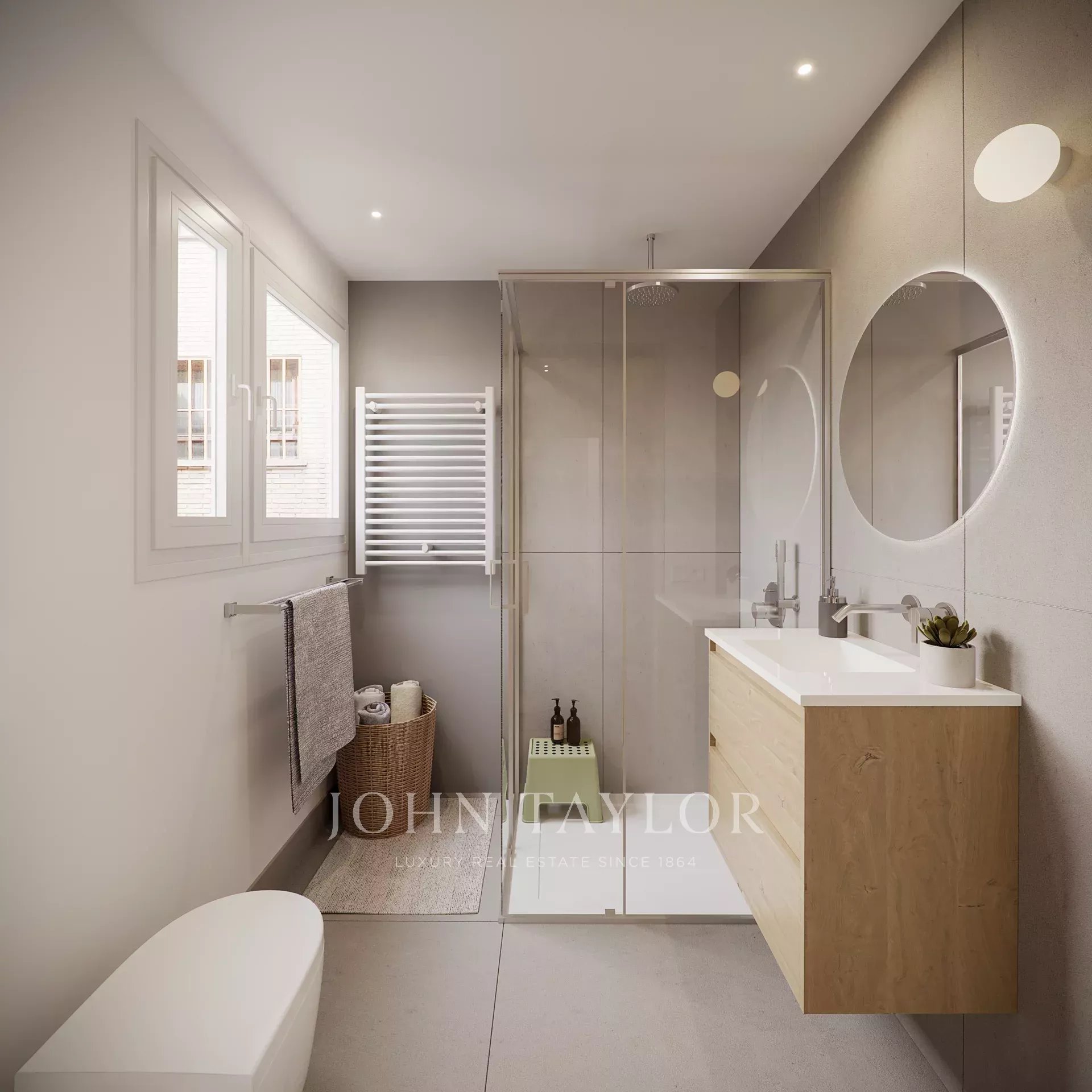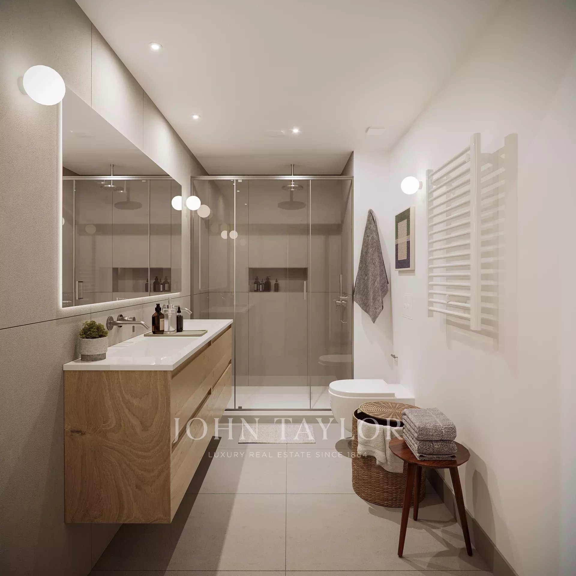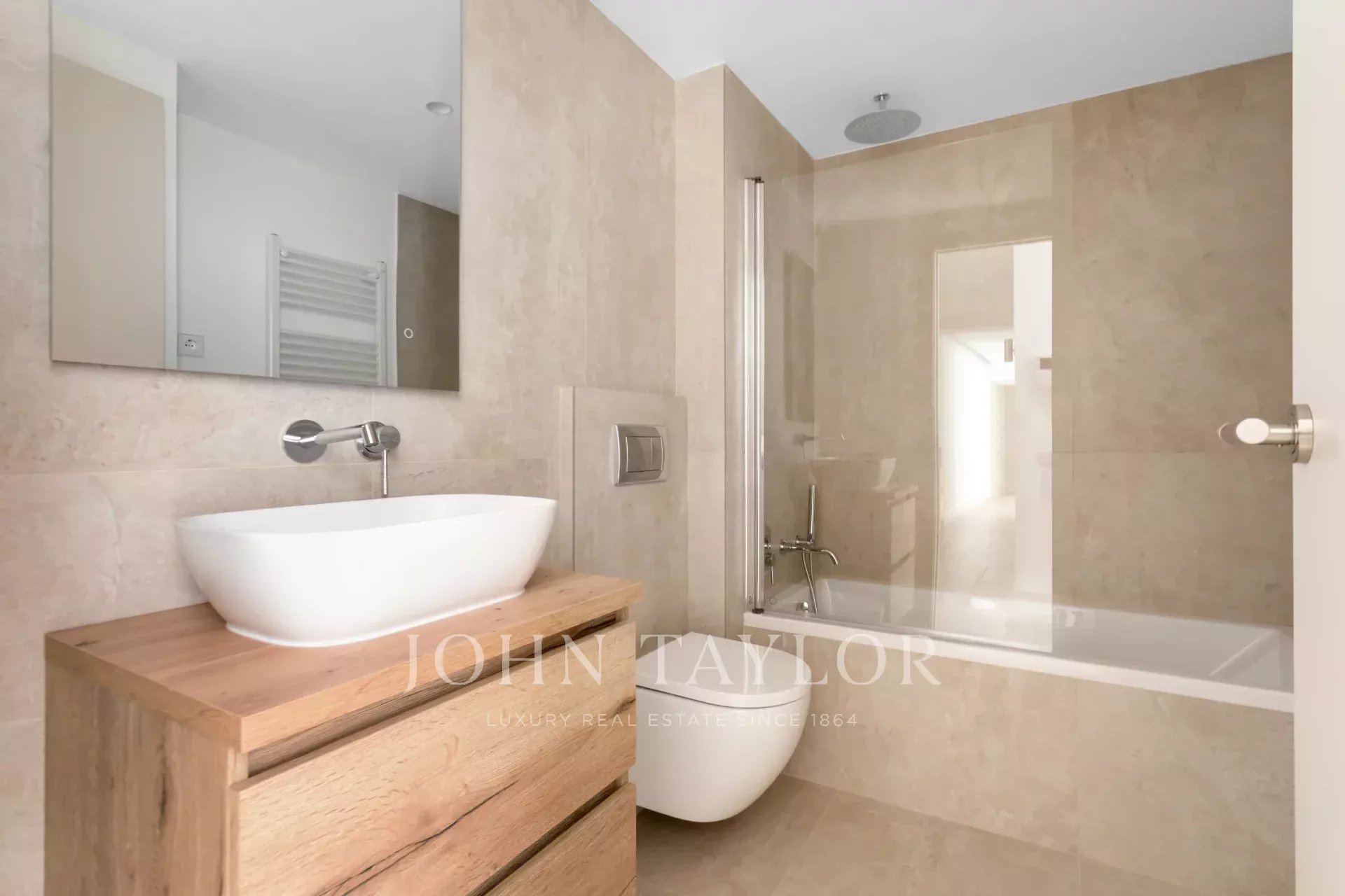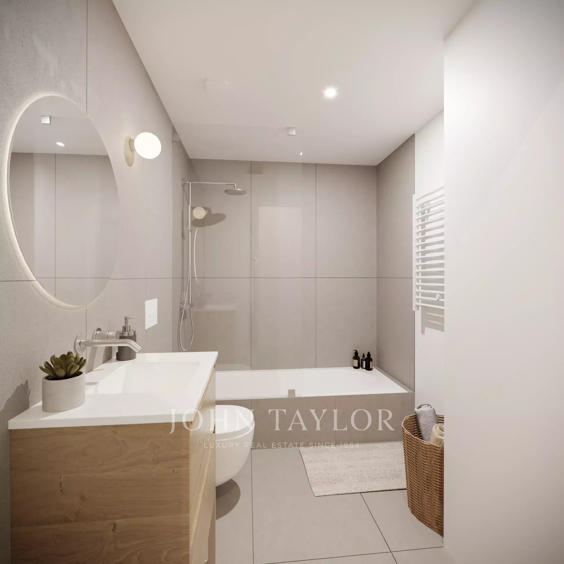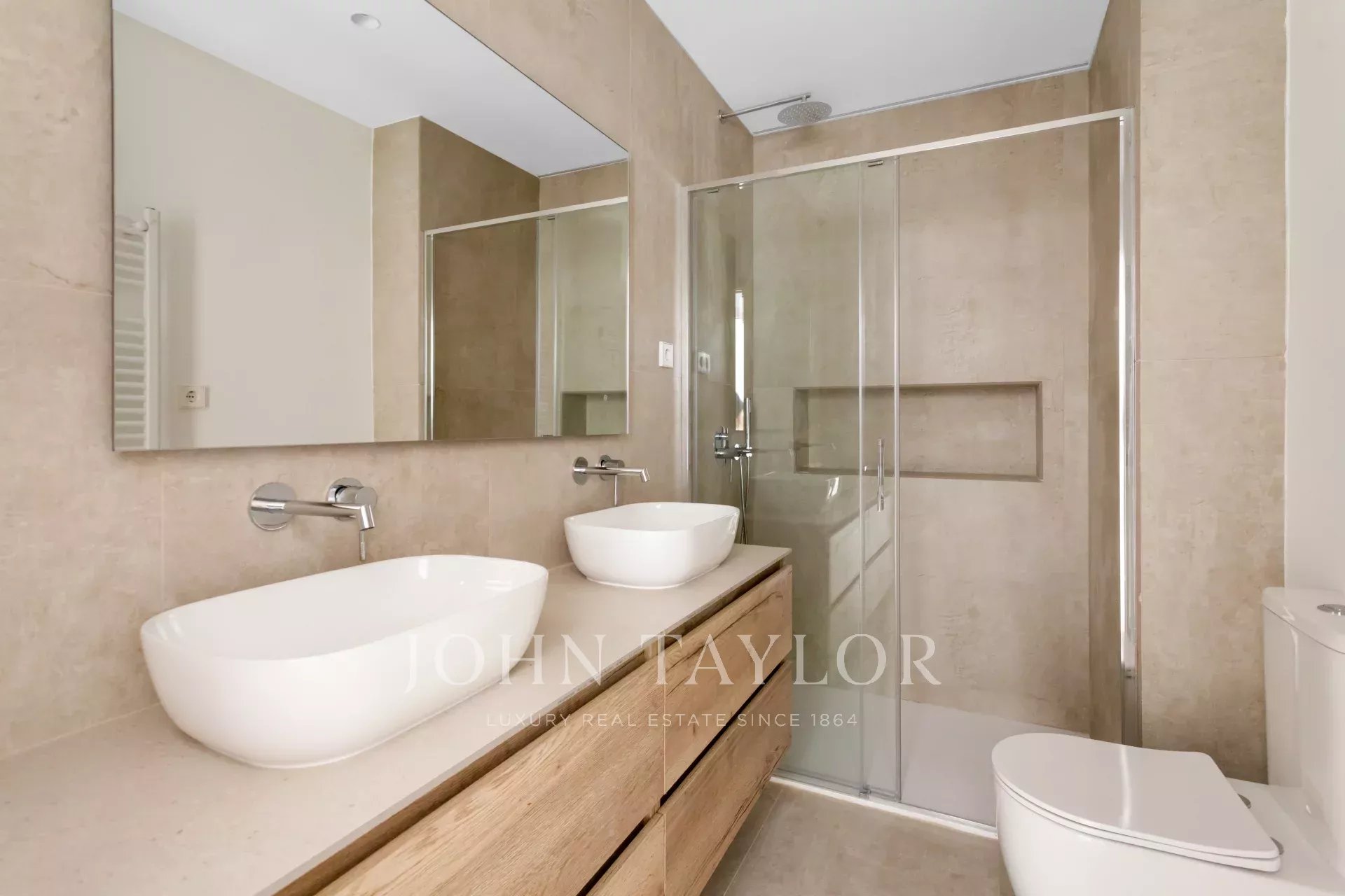 The sleeping area consists of two en-suite bedrooms, both with private bathrooms and fitted closets, offering independence and comfort. There is also the possibility of enabling a third room, ideal as an office or additional bedroom. A third full bathroom complements the day area, providing a practical solution for guests.