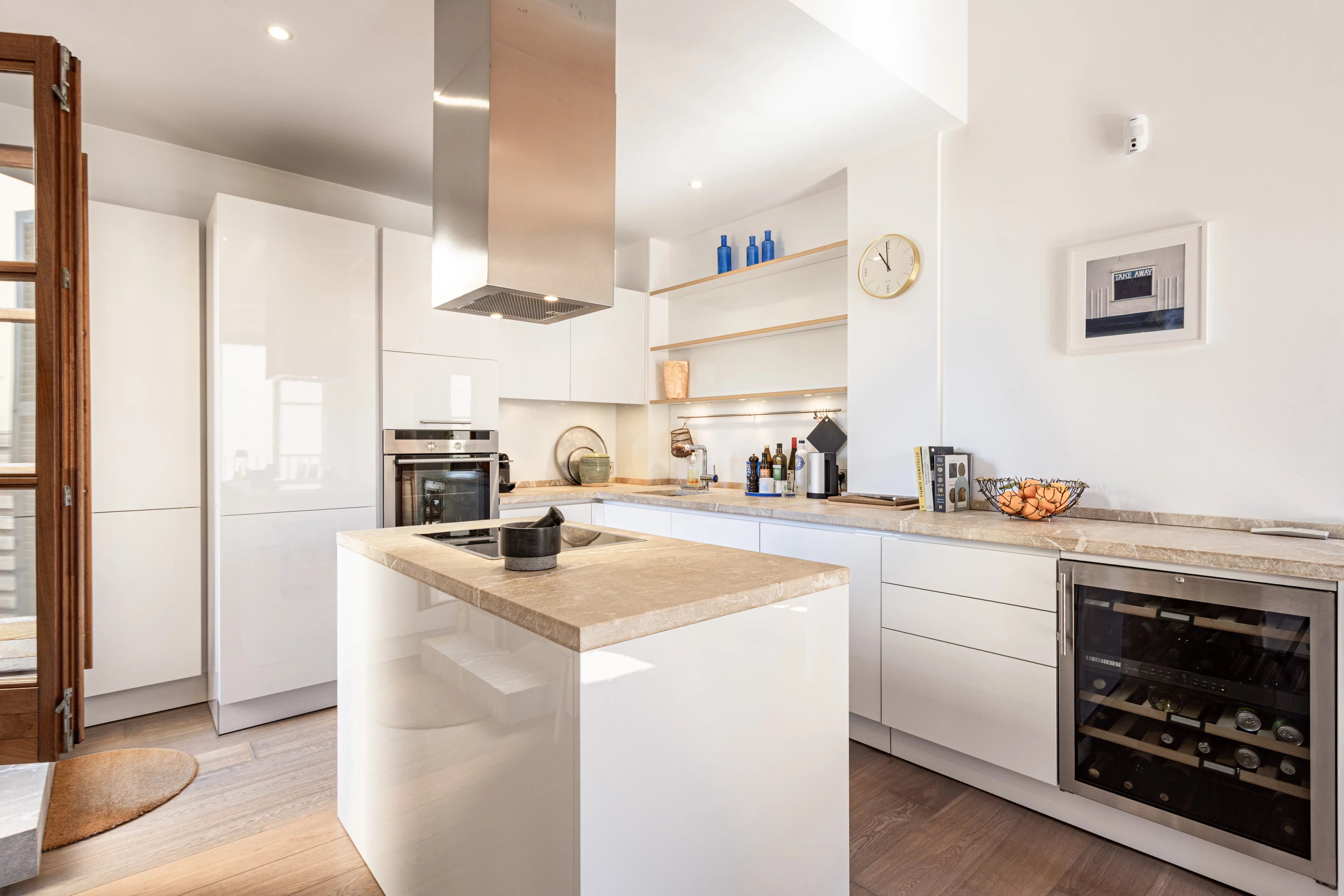 Today it functions as a single home with three bedrooms and two bathrooms. The main living area is arranged as an open-plan space where the living room, dining area and kitchen flow together while still feeling clearly defined. Being on a corner, the light moves through the home throughout the day: morning sun fills the living room, midday light gathers on the south-facing terrace, and in the afternoon the interior regains a warm glow from the reflection of the square.