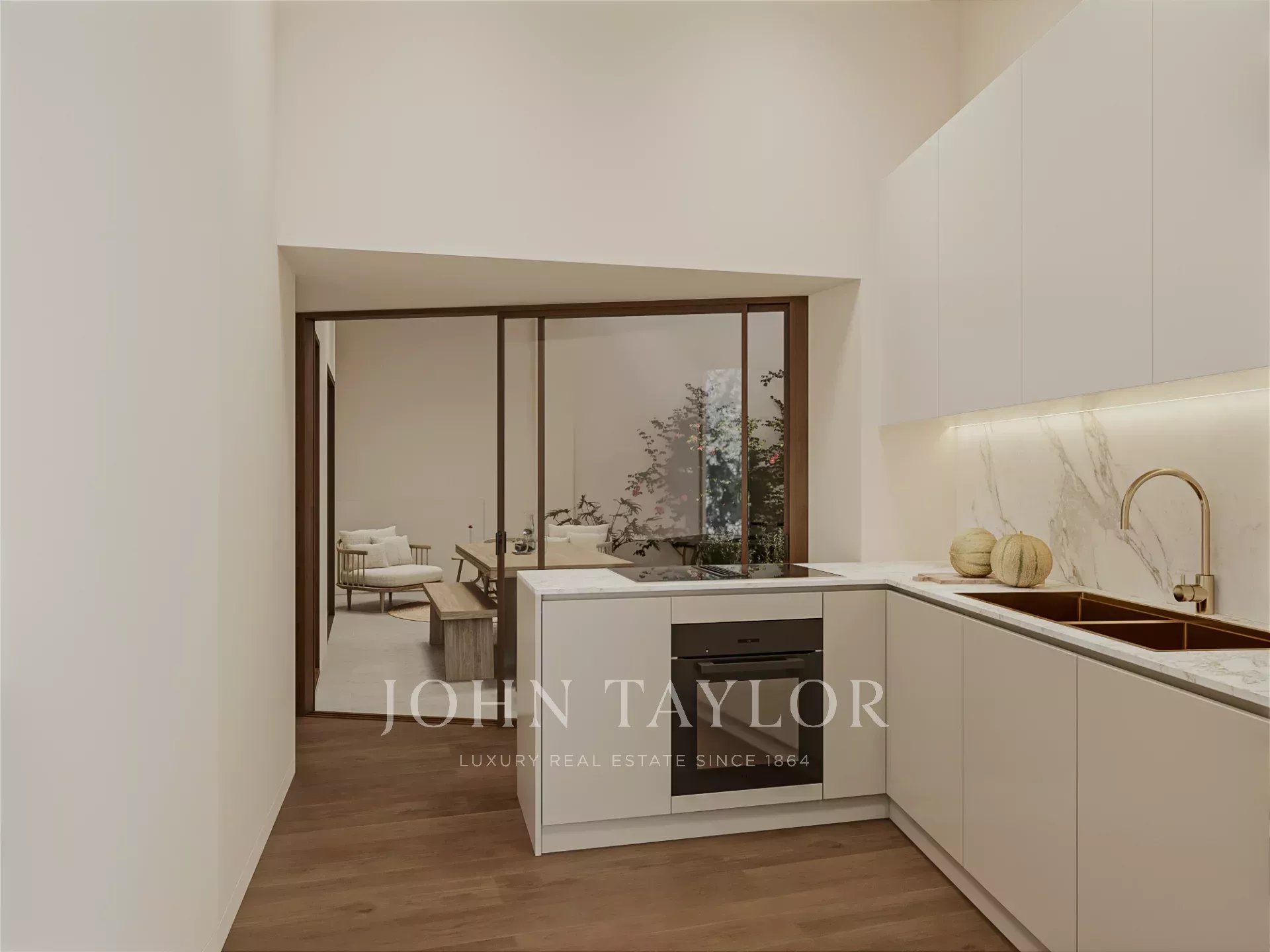 The building is undergoing a comprehensive renovation, with completion planned for September 2026. The project focuses on preserving its history while adapting to modern comfort, style, and high-end living. This ground-floor duplex apartment offers 323 m2 with four bedrooms, each with an ensuite bathroom, a guest lavatory, a living/dining room with direct access to the exterior area, a separate custom-made kitchen with Miele appliances, also with access to the exterior covered porch, landscaped garden, and private pool totalling 112 sqm. The apartment includes underfloor heating, central air conditioning, double glazing, oak flooring, and a separate storage room.