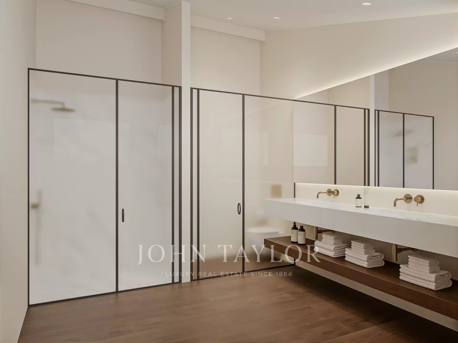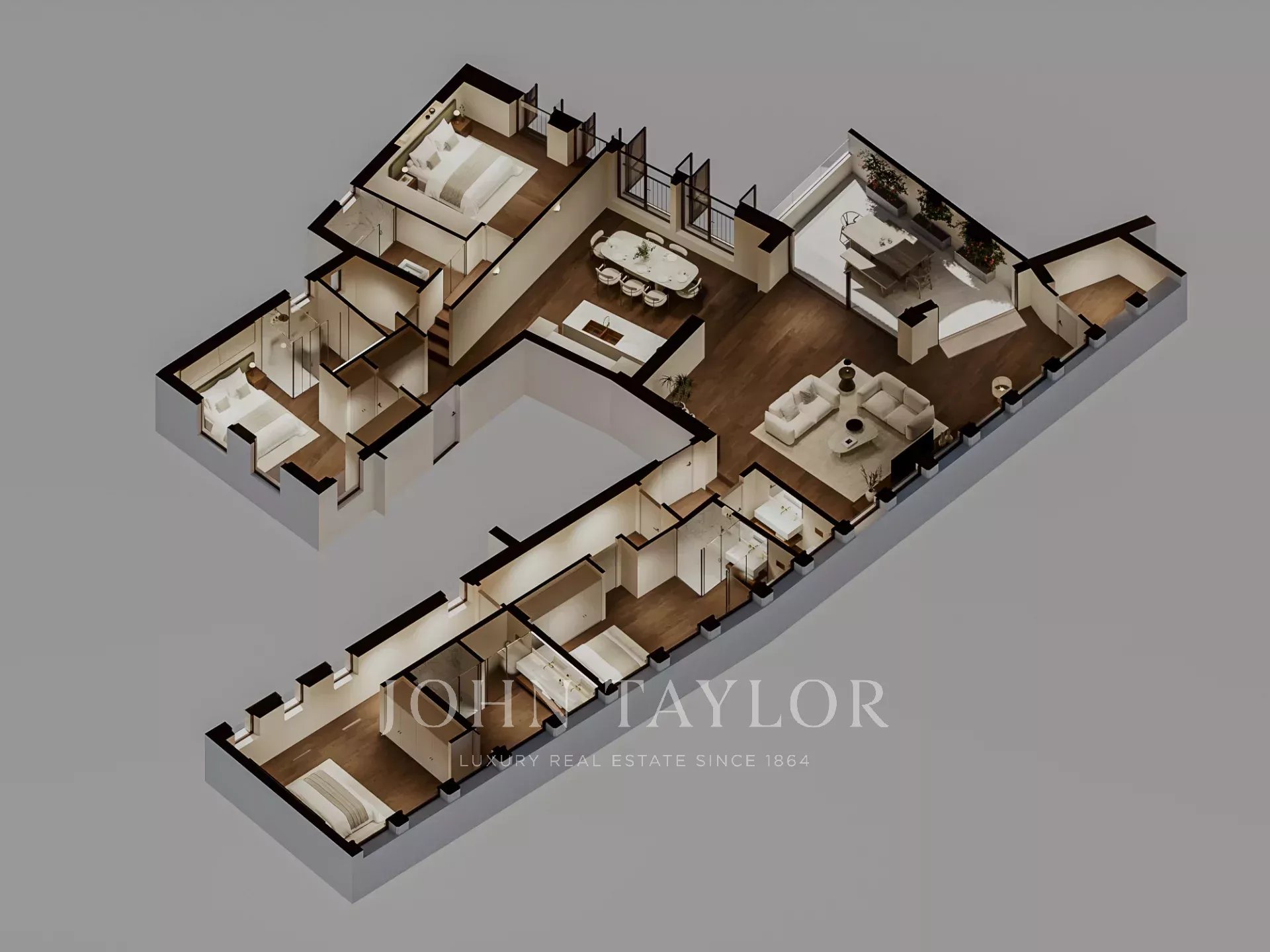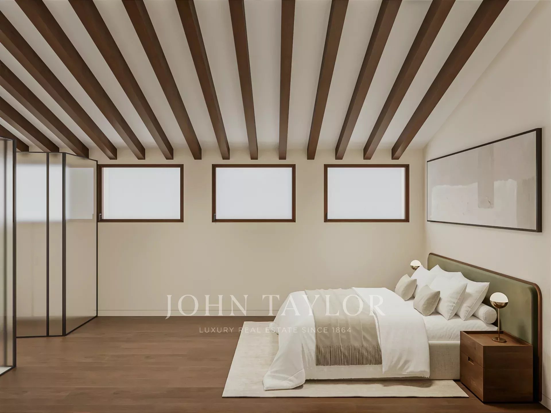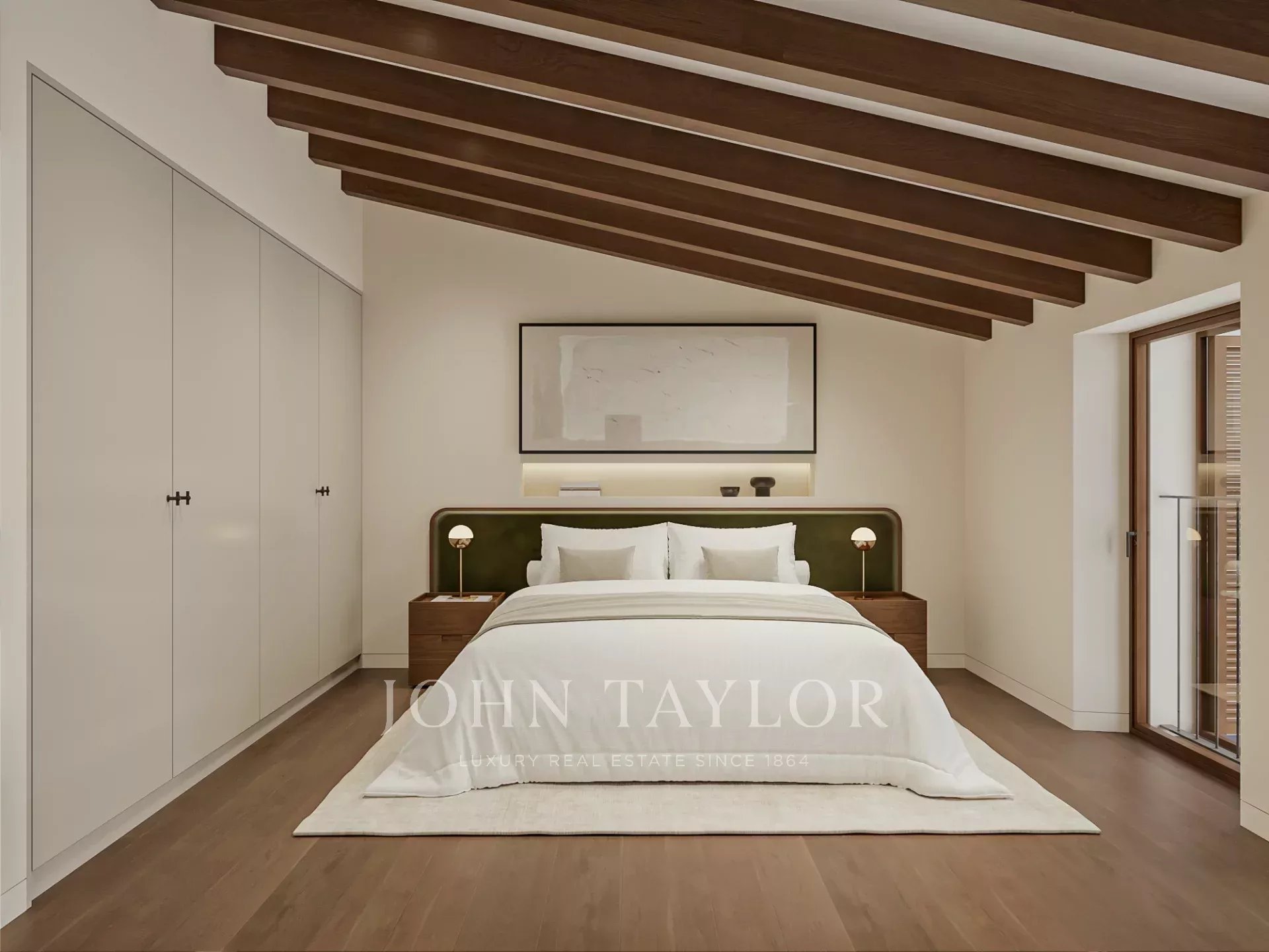 The building is undergoing a comprehensive renovation, with completion planned for September 2026. The project focuses on preserving its history while adapting to modern comfort, style, and high-end living. This second-floor penthouse apartment offers 243 m² with an open-plan, custom-made designer kitchen featuring Miele appliances, a dining area, and a living room that flows out to the exterior, as well as a cozy 17 m² terrace offering spectacular direct Cathedral views. It has four bedrooms, each with an ensuite bathroom and a guest lavatory, a laundry room, and a pantry. The apartment includes underfloor heating, central air conditioning, double glazing, oak flooring, and a separate storage room.