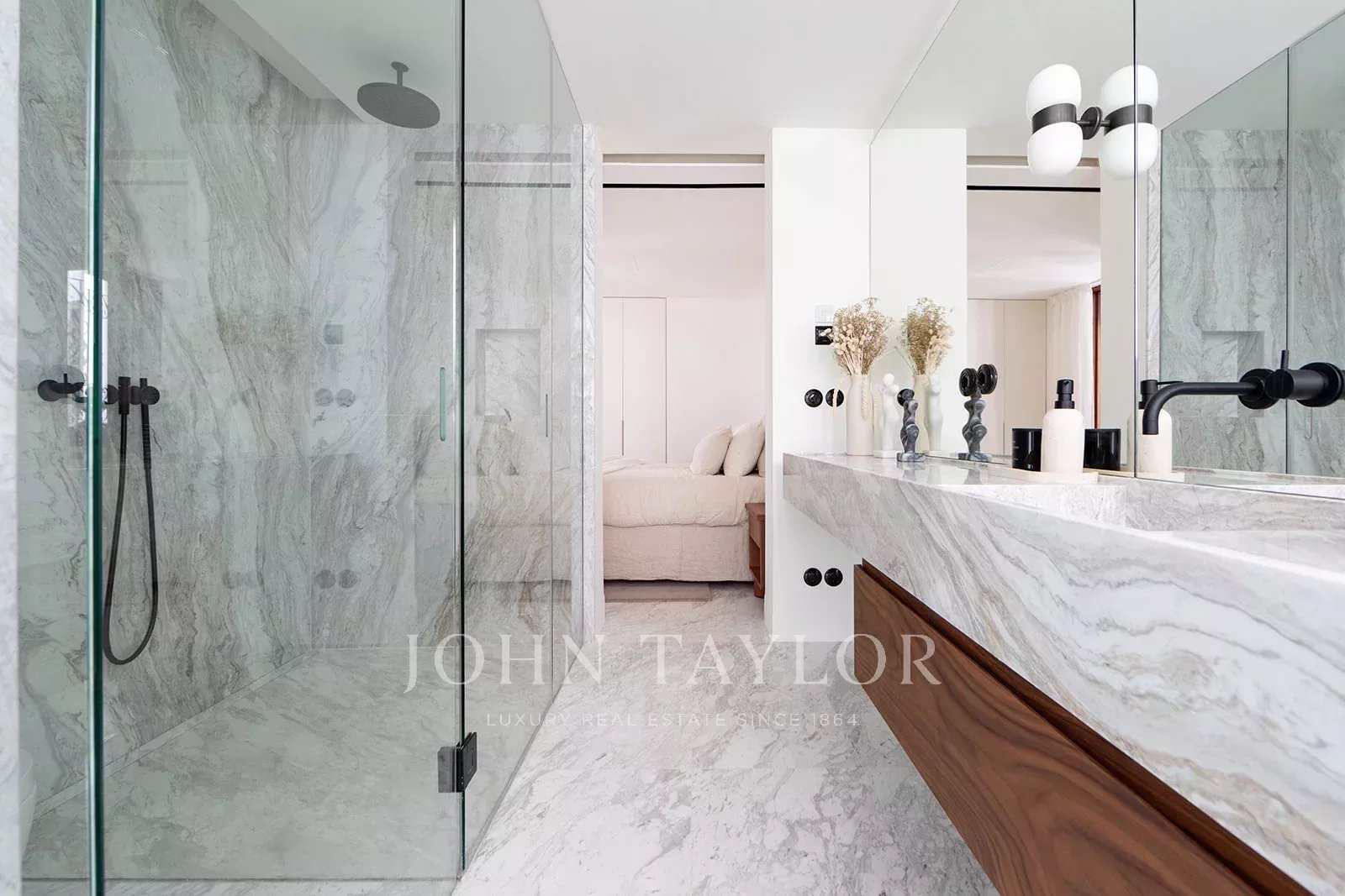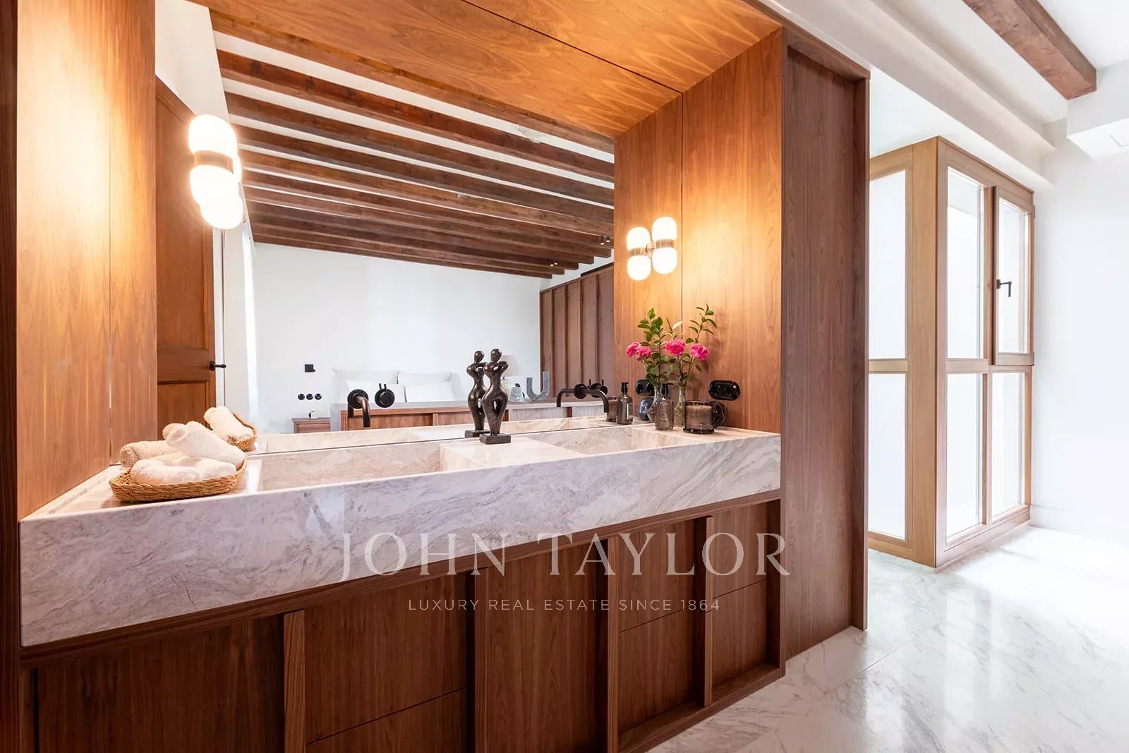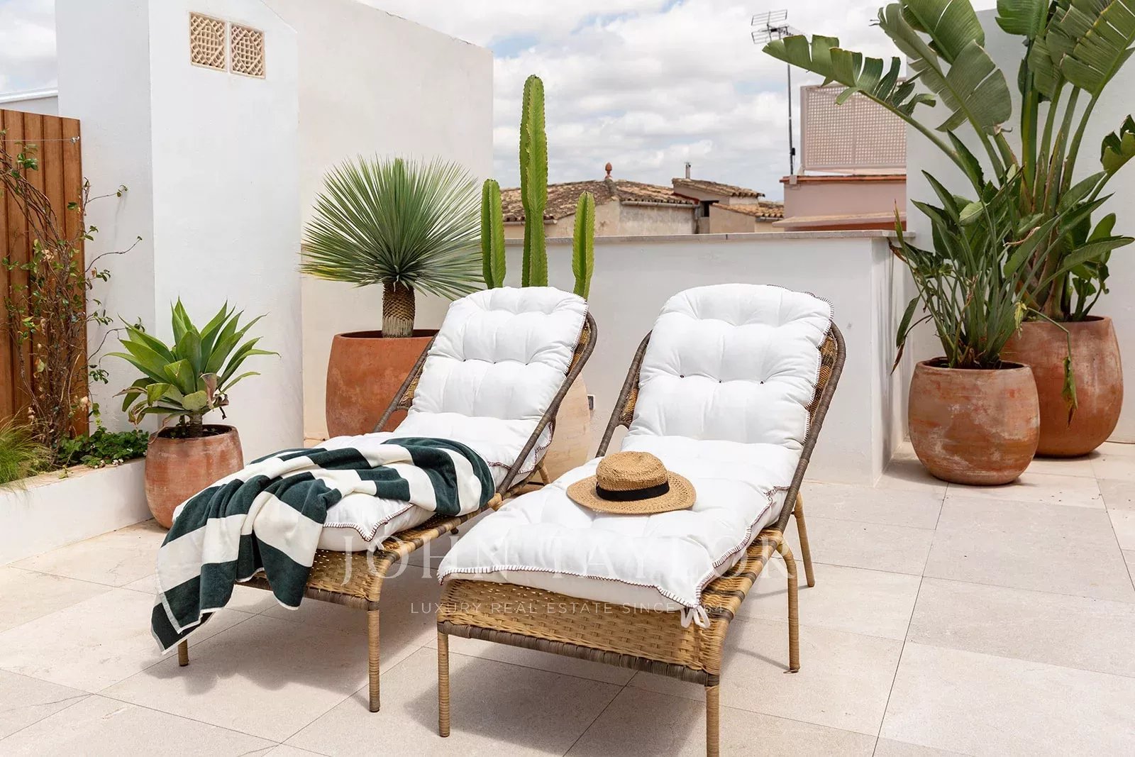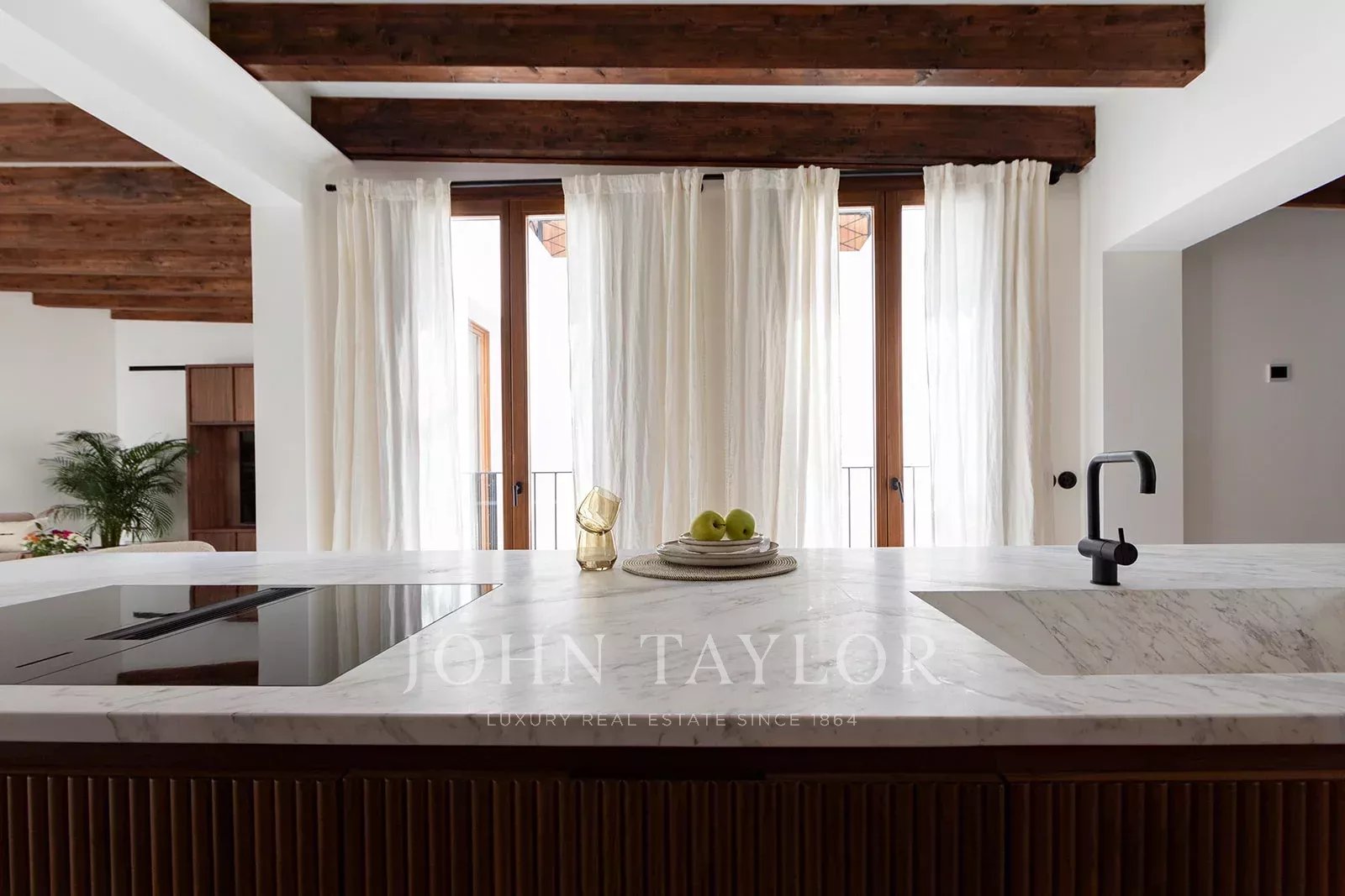 This outstanding three-bedroom, three-bathroom duplex is distributed over the top two floors of the building and includes a sensational roof terrace with far-reaching views over the city’s rooftops. On the lower level a large, light-filled living room with antique floor tiles and exposed wooden beams is located at the front of the building, with two balconies overlooking the street. To the rear are two spacious bedrooms with ensuite bathrooms. The master bedroom features windows into the central patio, built-in wardrobes and Mallorquin tiles on the floors, while the second bedroom has glass-panelled doors to allow light in from the patio. Both bathrooms are luxuriously finished in Volakas marble and walnut wood and feature walk-in showers and double vanities with integrated marble sinks. On the upper level, an open concept kitchen, dining and living room wrap around two sides of the central patio. Full height windows facing the courtyard and a light well at the rear bathe this space in natural light. The sleek kitchen, finished in walnut wood with a marble-topped island and integrated sink, is equipped with top-quality Gaggenau appliances, including a wine fridge. Also on this level is a large third bedroom with a sloping ceiling, an ensuite shower room, and a storage room. Volakas marble floors with a wood trim and exposed wooden beams extend throughout this level, lending it timeless, elegant appeal. From here, stairs lead up to a sunny, 76 m2 terrace with sweeping views of Santa Eulalia church, the Cathedral and the Bellver Castle. Spread over varying levels, this is a privileged place to soak up the sun on winter days and enjoy warm summer nights high above the bustle of the city. The property is equipped with underfloor heating and central air conditioning.