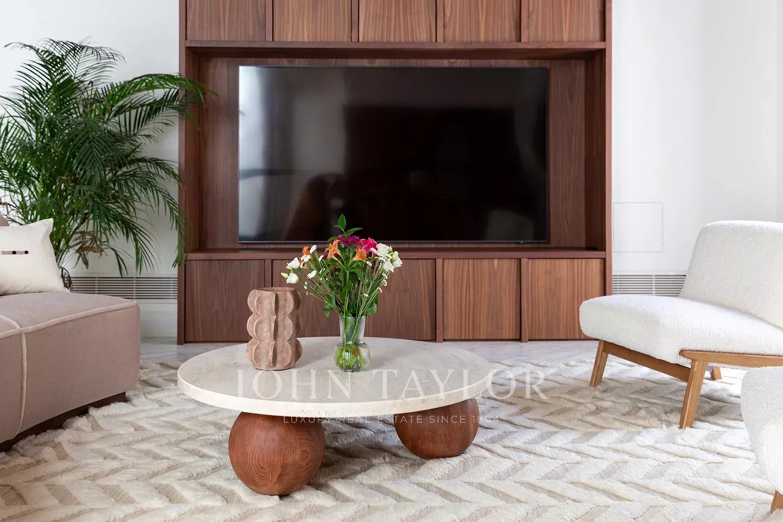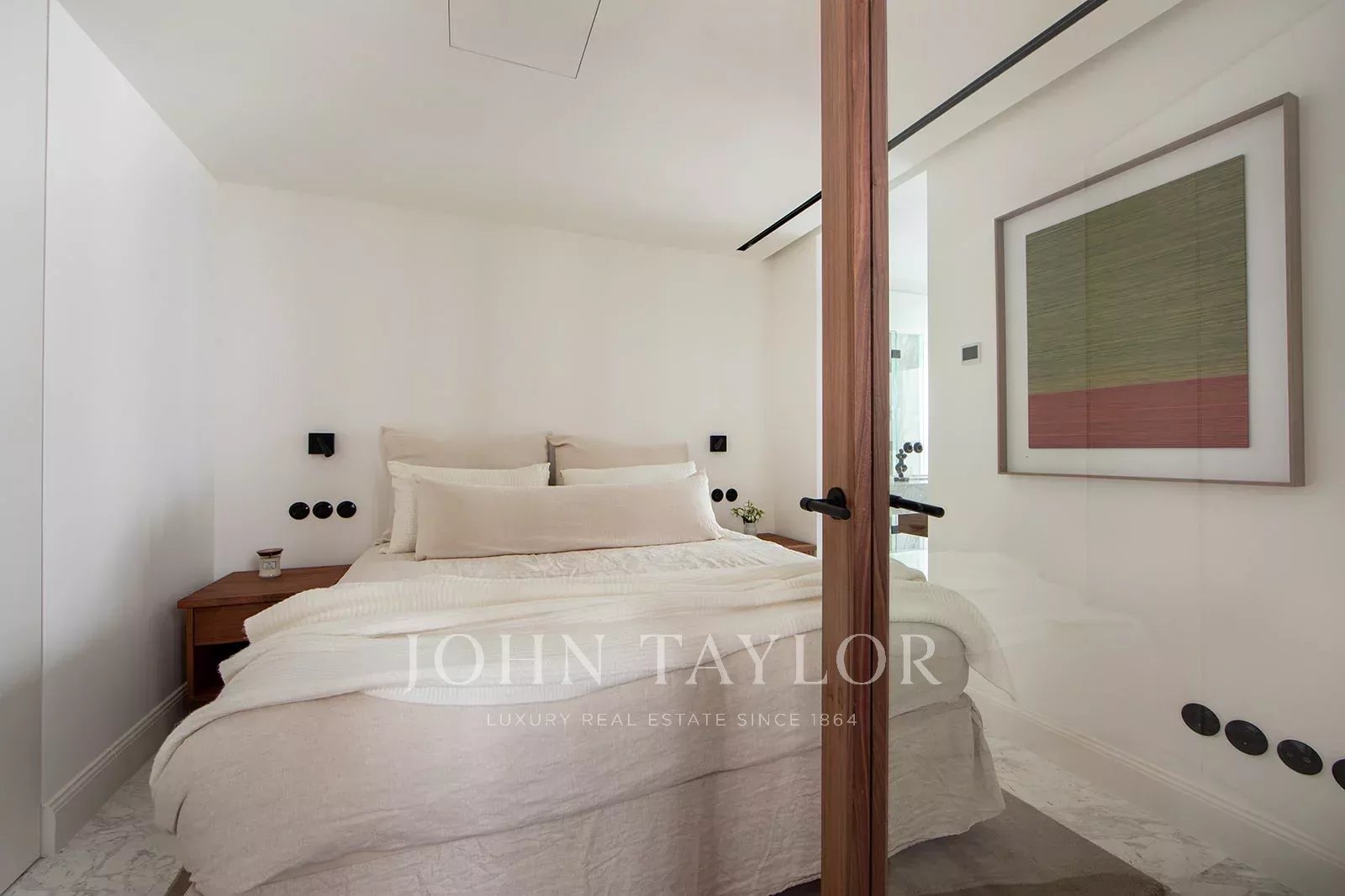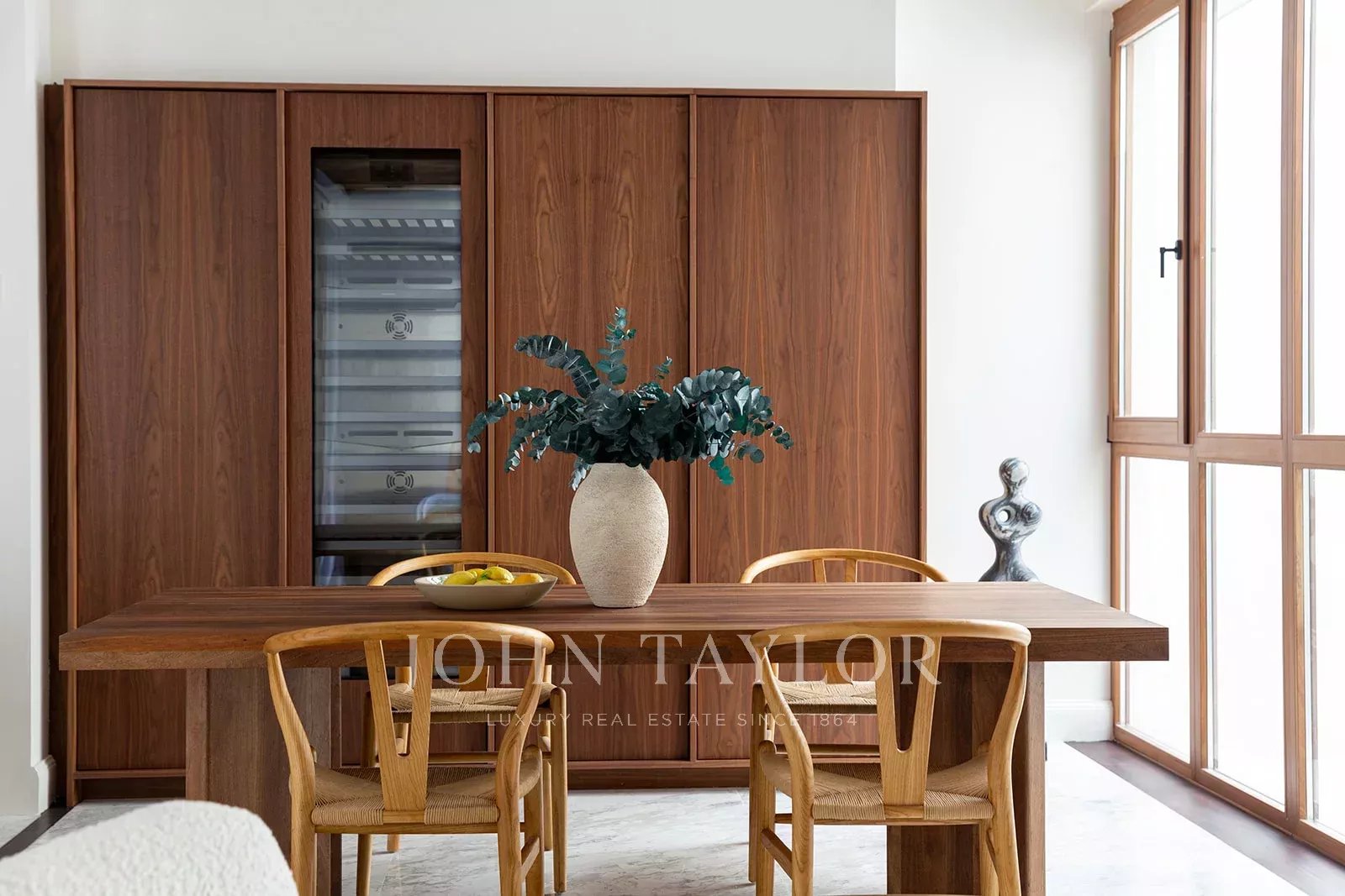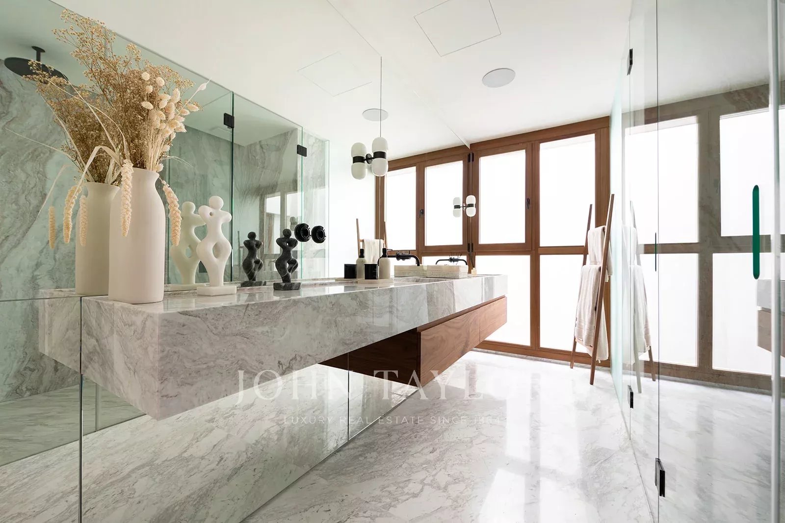 This outstanding three-bedroom, three-bathroom duplex is distributed over the top two floors of the building and includes a sensational roof terrace with far-reaching views over the city’s rooftops. On the lower level a large, light-filled living room with antique floor tiles and exposed wooden beams is located at the front of the building, with two balconies overlooking the street. To the rear are two spacious bedrooms with ensuite bathrooms. The master bedroom features windows into the central patio, built-in wardrobes and Mallorquin tiles on the floors, while the second bedroom has glass-panelled doors to allow light in from the patio. Both bathrooms are luxuriously finished in Volakas marble and walnut wood and feature walk-in showers and double vanities with integrated marble sinks. On the upper level, an open concept kitchen, dining and living room wrap around two sides of the central patio. Full height windows facing the courtyard and a light well at the rear bathe this space in natural light. The sleek kitchen, finished in walnut wood with a marble-topped island and integrated sink, is equipped with top-quality Gaggenau appliances, including a wine fridge. Also on this level is a large third bedroom with a sloping ceiling, an ensuite shower room, and a storage room. Volakas marble floors with a wood trim and exposed wooden beams extend throughout this level, lending it timeless, elegant appeal. From here, stairs lead up to a sunny, 76 m2 terrace with sweeping views of Santa Eulalia church, the Cathedral and the Bellver Castle. Spread over varying levels, this is a privileged place to soak up the sun on winter days and enjoy warm summer nights high above the bustle of the city. The property is equipped with underfloor heating and central air conditioning.