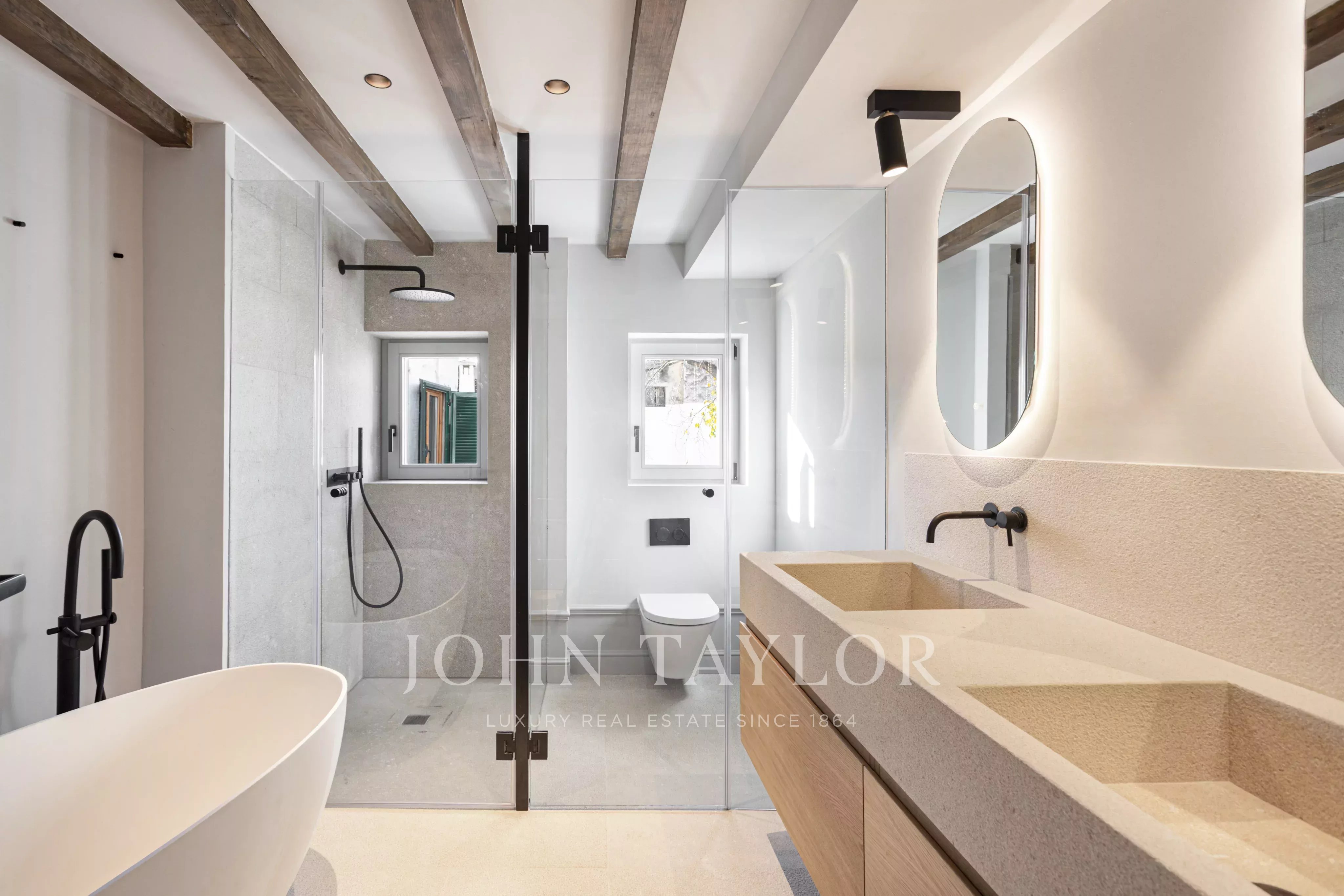 The upper level offers a versatile additional space, perfectly suited as a guest suite, home office, study, or private library, complete with its own en suite bathroom. From here, you access a superb 13 m² private rooftop terrace, an exceptional feature in Palma Old Town, ideal for enjoying the Mediterranean climate, al fresco dining, or relaxing in total privacy above the city rooftops.