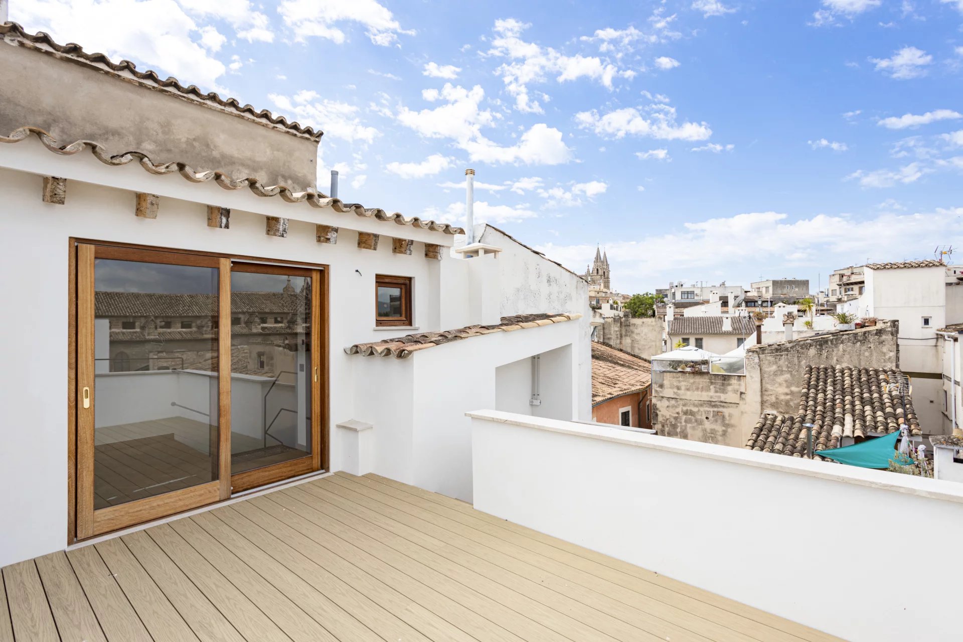 For sale exclusive refurbished duplex penthouse with a terrace in the old town of Palma de Mallorca, located in the prestigious Calle Brossa, next to the emblematic church of Sant Nicolás. This unique property combines historical charm with contemporary design and noble materials, offering a sophisticated living experience in one of the most sought-after areas in the centre of Palma. With a constructed area of 134 m² and a spectacular private terrace of 28 m², this luxury penthouse is distributed over two floors and has been completely renovated with high-quality finishes. The living-dining room, spacious and bright, is perfectly integrated with a modern and functional kitchen. It has two double bedrooms with built-in wardrobes and two complete bathrooms, as well as a third multi-purpose room ideal as an office, library or third bedroom, which has its toilet and direct access to the terrace which is a true urban oasis, with pre-installation for an outdoor kitchen, perfect for enjoying the Mediterranean climate all year round. All the interior and exterior carpentry has been made of teak wood, providing elegance, durability, and character, while the solid wood floors in all the rooms provide a warm and welcoming aesthetic. The integral refurbishment has included double glazing, air conditioning, hot/cold, and an optimised layout to make the most of natural light. This exclusive property is ideal both as a permanent residence and as a high-end investment property in Palma de Mallorca, thanks to its privileged location in the heart of the old town, surrounded by history, culture, shops, and restaurants. An authentic architectural jewel with Mallorcan soul and contemporary design, perfect for those looking to buy a penthouse in Palma centre with a terrace and high quality.