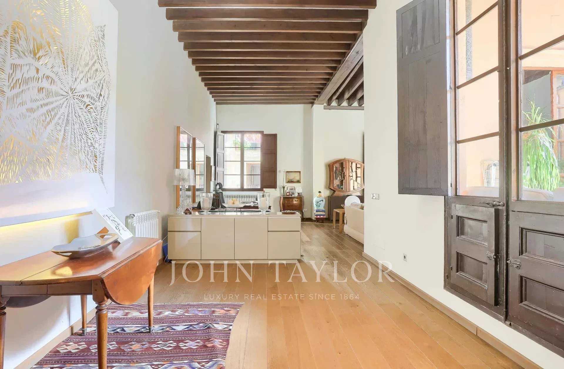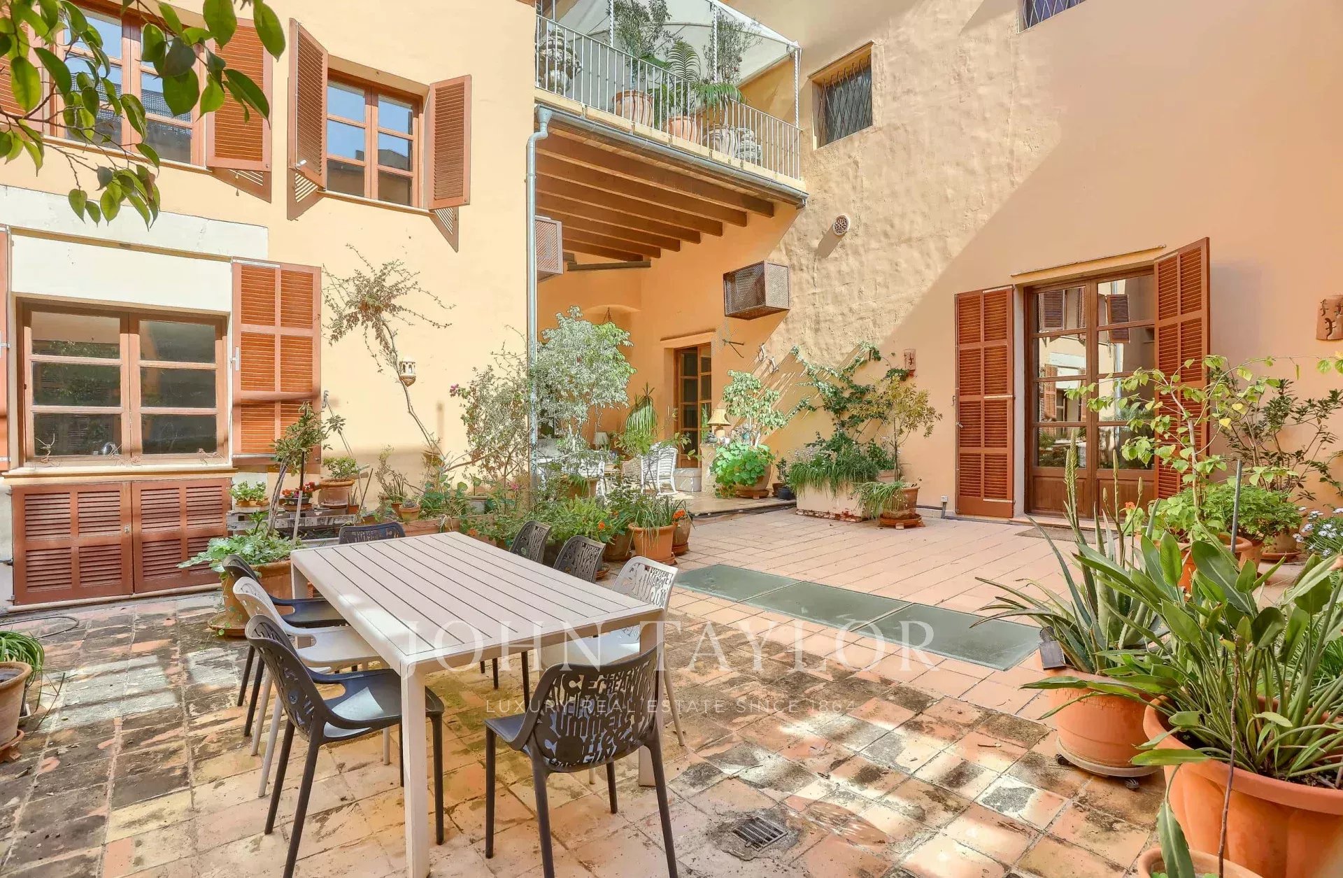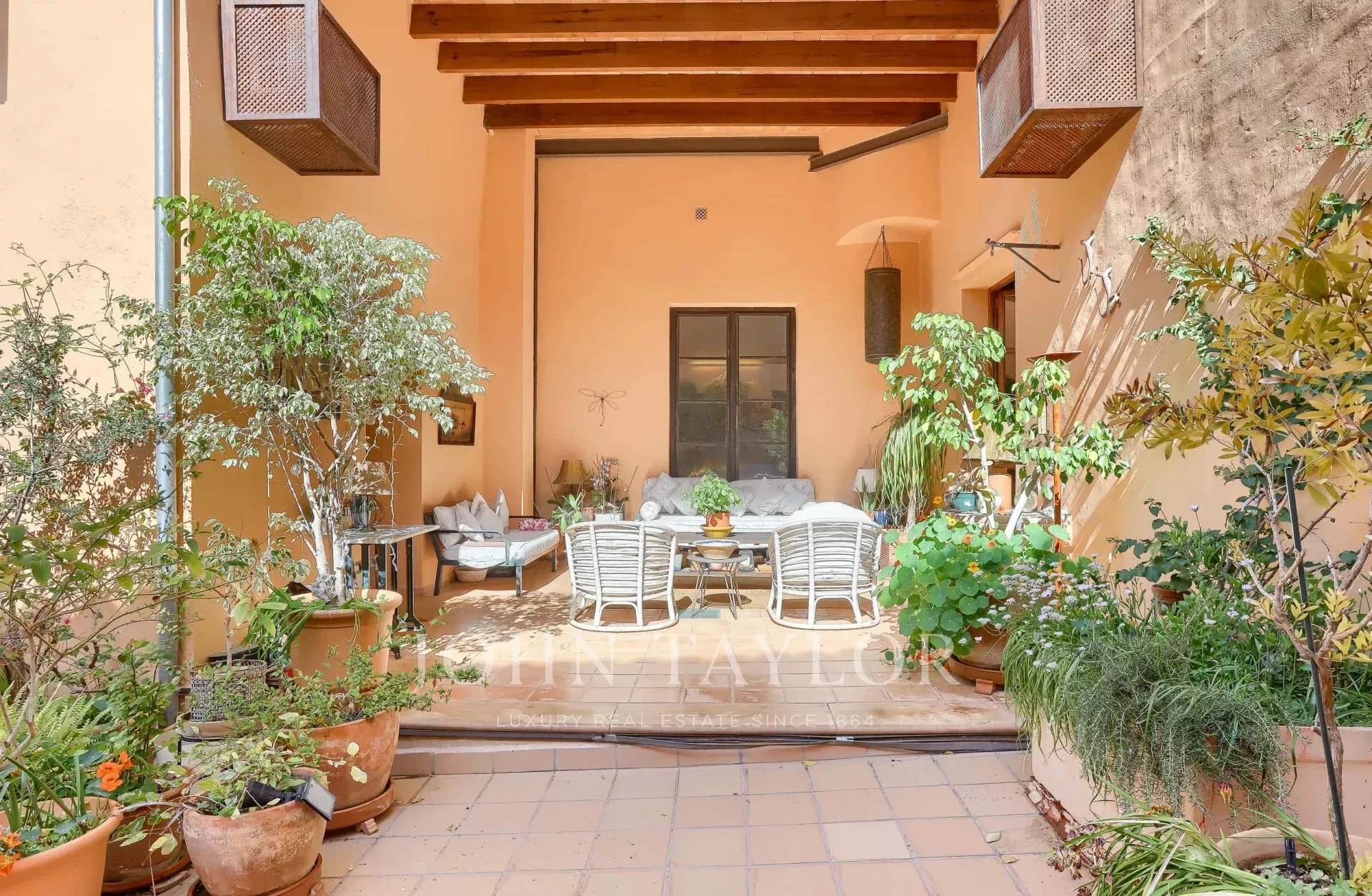 Discover this exclusive two-storey apartment for sale in the heart of Palma's historic centre, located within a historic palace just steps away from the iconic Plaza de Cort. This luxury property perfectly combines history, contemporary design, and a privileged location, surrounded by culture, gastronomy, shops, cafés, and all amenities, all within walking distance. This flat has been completely renovated, respecting the original architectural details, offering a home that is sophisticated, bright, and full of character. The property features high ceilings, exposed wooden beams, high-quality natural wood floors, and a modern open plan layout that maximises space and light. There are two bedrooms and three bathrooms, including an elegant master suite with a dressing room and private bathroom, designed as a tranquil retreat with luxurious finishes and large windows with wooden shutters that flood the room with natural light. From a charming traditional communal courtyard, the flat is accessed via stairs. The large L-shaped living-dining room has an impressive ceiling height. It connects directly to a spacious 110 m² private terrace, a true urban oasis with covered and open areas, ideal for enjoying the Mediterranean climate all year round. The terrace, surrounded by greenery and decorated with hanging planters, features wooden beamed ceilings and walls in warm tones, creating a cosy atmosphere for al fresco dining or moments of relaxation. The spacious and functional designer kitchen is equipped with a central island and space for a breakfast table, and also has direct access to the terrace. In addition, the property includes a large vaulted private wine cellar, perfect for wine collectors or wine lovers. Modern amenities in this luxury flat include central heating, double-glazed windows, city gas, a separate laundry area, ample storage space, a lift, and a garage space in the building, a highly sought-after feature in this city area. This unique property for sale in Palma stands out for its privileged location in the old town, its careful renovation with noble materials, and its magnificent private terrace. An exceptional opportunity to acquire a luxury property in one of the most desirable areas of Mallorca. Don't miss this unique opportunity to live in a palace in the centre of Palma!
