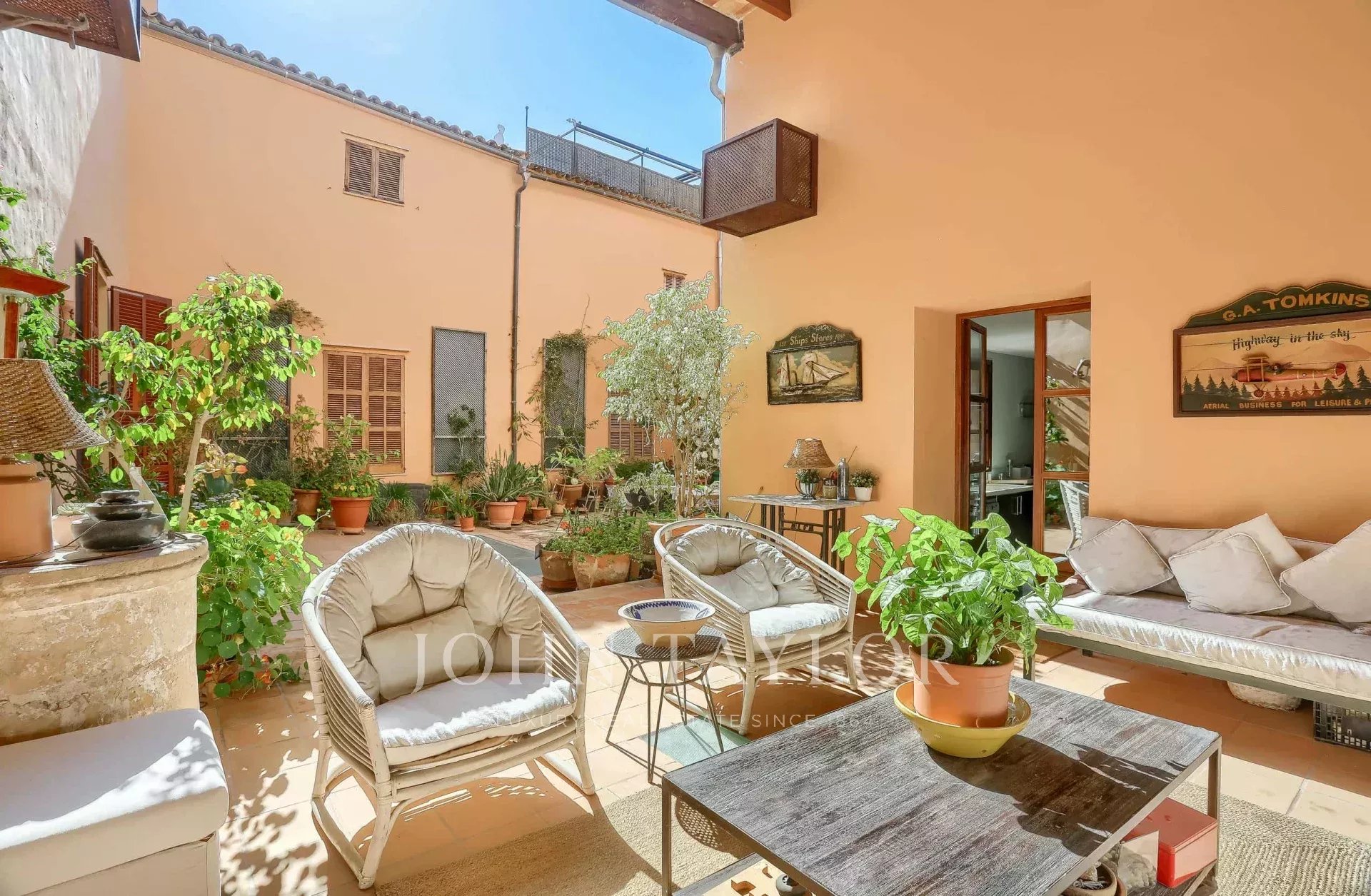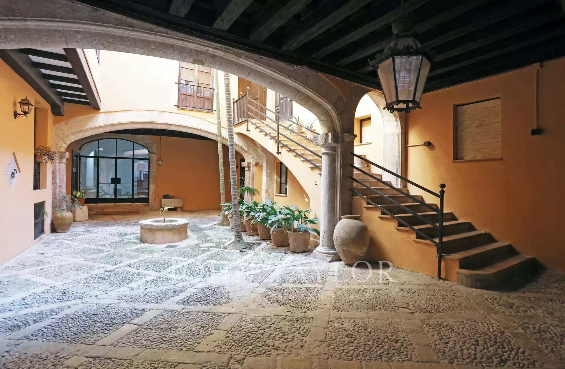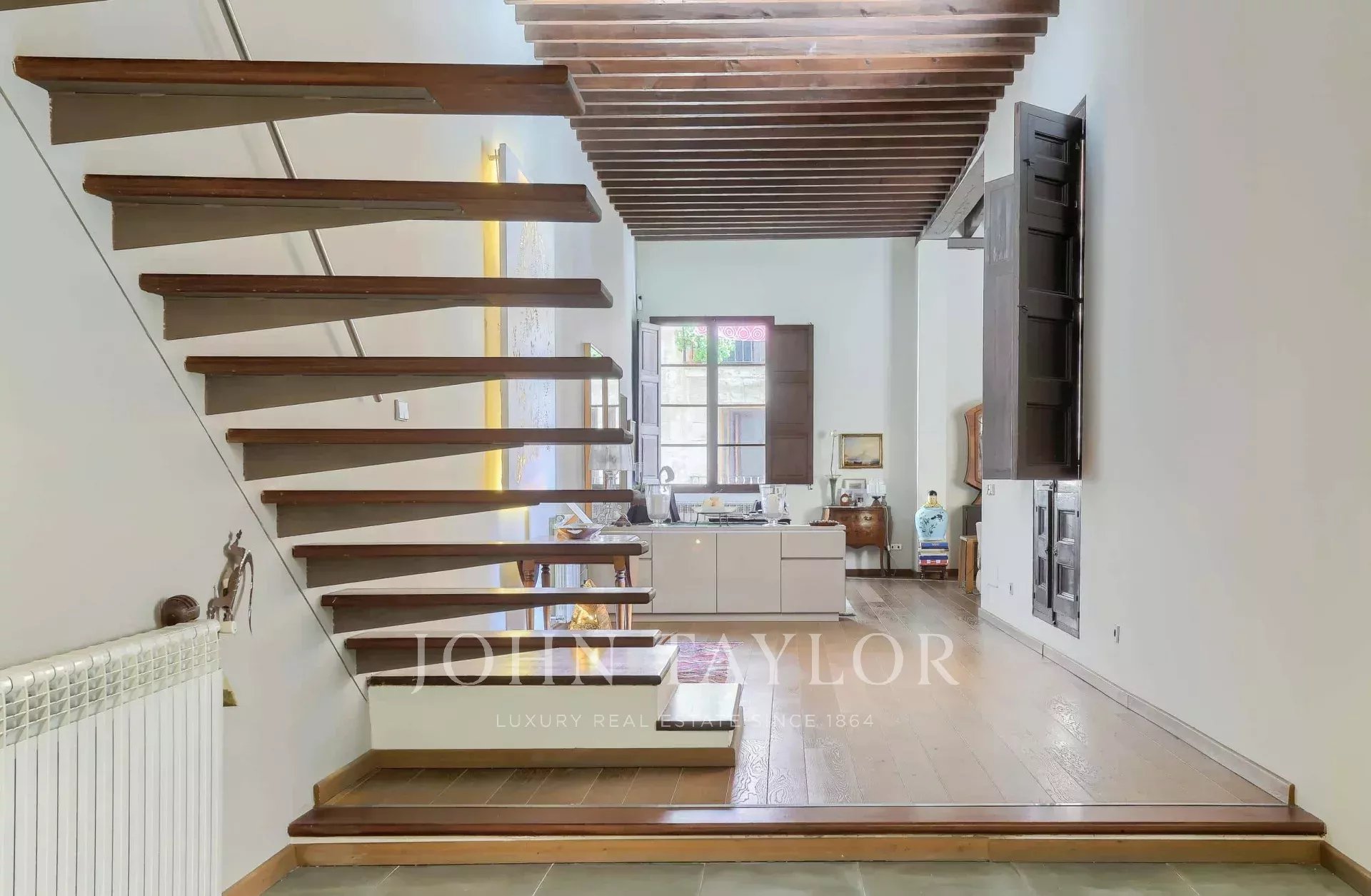 Discover this exclusive two-storey apartment for sale in the heart of Palma's historic centre, located within a historic palace just steps away from the iconic Plaza de Cort. This luxury property perfectly combines history, contemporary design, and a privileged location, surrounded by culture, gastronomy, shops, cafés, and all amenities, all within walking distance. This flat has been completely renovated, respecting the original architectural details, offering a home that is sophisticated, bright, and full of character. The property features high ceilings, exposed wooden beams, high-quality natural wood floors, and a modern open plan layout that maximises space and light. There are two bedrooms and three bathrooms, including an elegant master suite with a dressing room and private bathroom, designed as a tranquil retreat with luxurious finishes and large windows with wooden shutters that flood the room with natural light. From a charming traditional communal courtyard, the flat is accessed via stairs. The large L-shaped living-dining room has an impressive ceiling height. It connects directly to a spacious 110 m² private terrace, a true urban oasis with covered and open areas, ideal for enjoying the Mediterranean climate all year round. The terrace, surrounded by greenery and decorated with hanging planters, features wooden beamed ceilings and walls in warm tones, creating a cosy atmosphere for al fresco dining or moments of relaxation. The spacious and functional designer kitchen is equipped with a central island and space for a breakfast table, and also has direct access to the terrace. In addition, the property includes a large vaulted private wine cellar, perfect for wine collectors or wine lovers. Modern amenities in this luxury flat include central heating, double-glazed windows, city gas, a separate laundry area, ample storage space, a lift, and a garage space in the building, a highly sought-after feature in this city area. This unique property for sale in Palma stands out for its privileged location in the old town, its careful renovation with noble materials, and its magnificent private terrace. An exceptional opportunity to acquire a luxury property in one of the most desirable areas of Mallorca. Don't miss this unique opportunity to live in a palace in the centre of Palma!