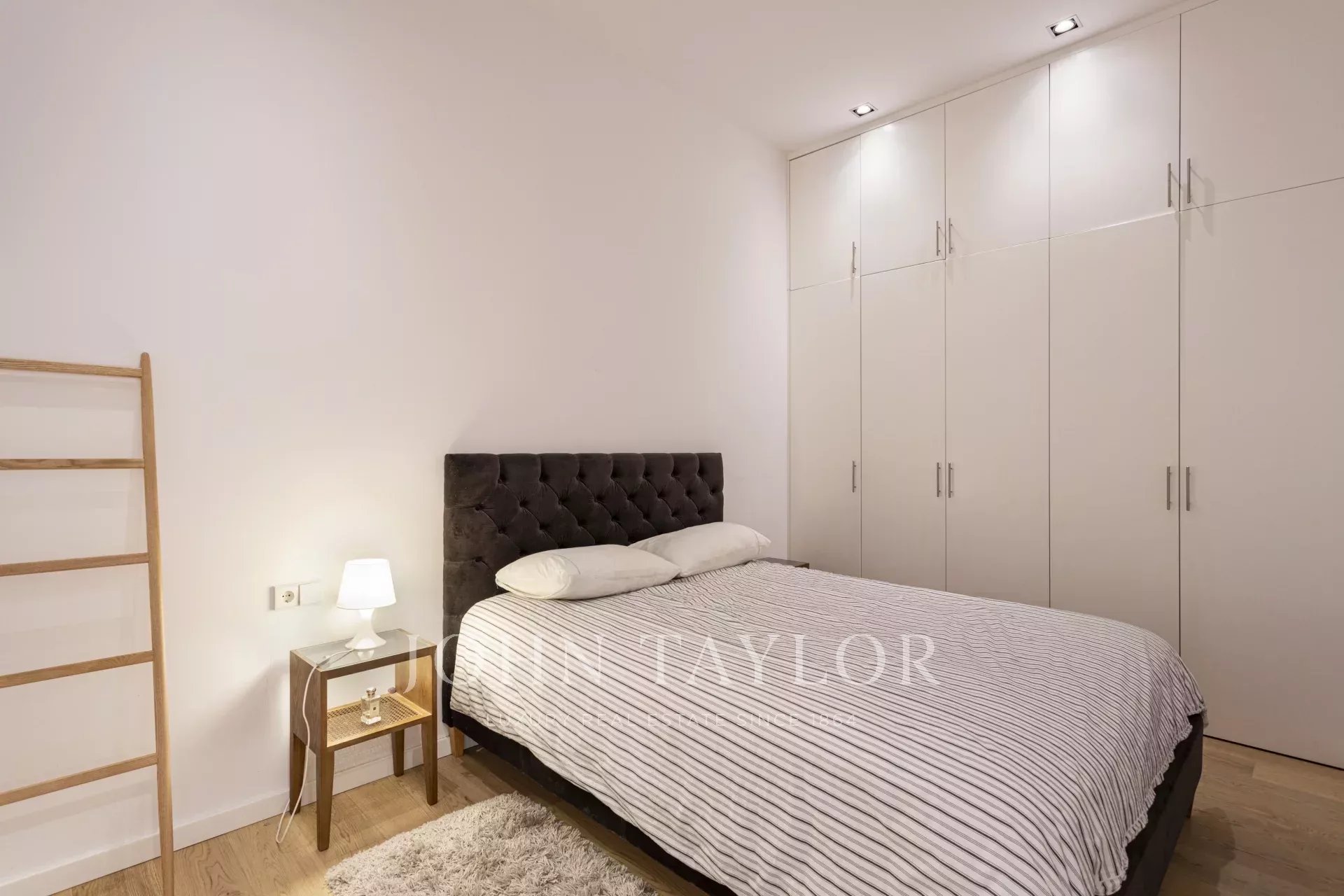 Renovated in 2019, the apartment boasts a spacious, light-filled open-plan living area that seamlessly combines kitchen, dining, and lounge spaces. Elegant double doors open onto a charming French balcony, flooding the interior with natural light and enhancing the warm ambiance created by wooden flooring and high ceilings.