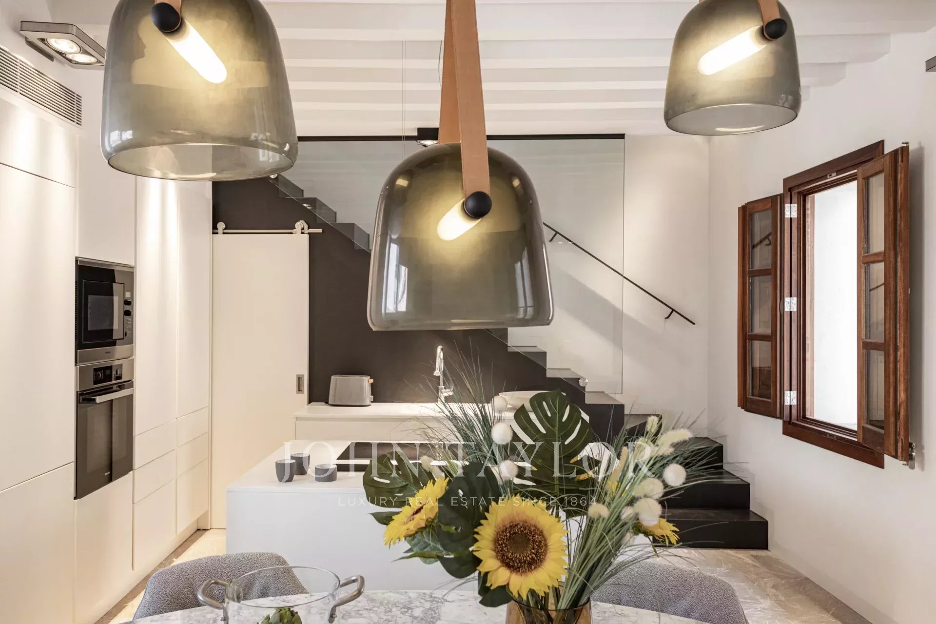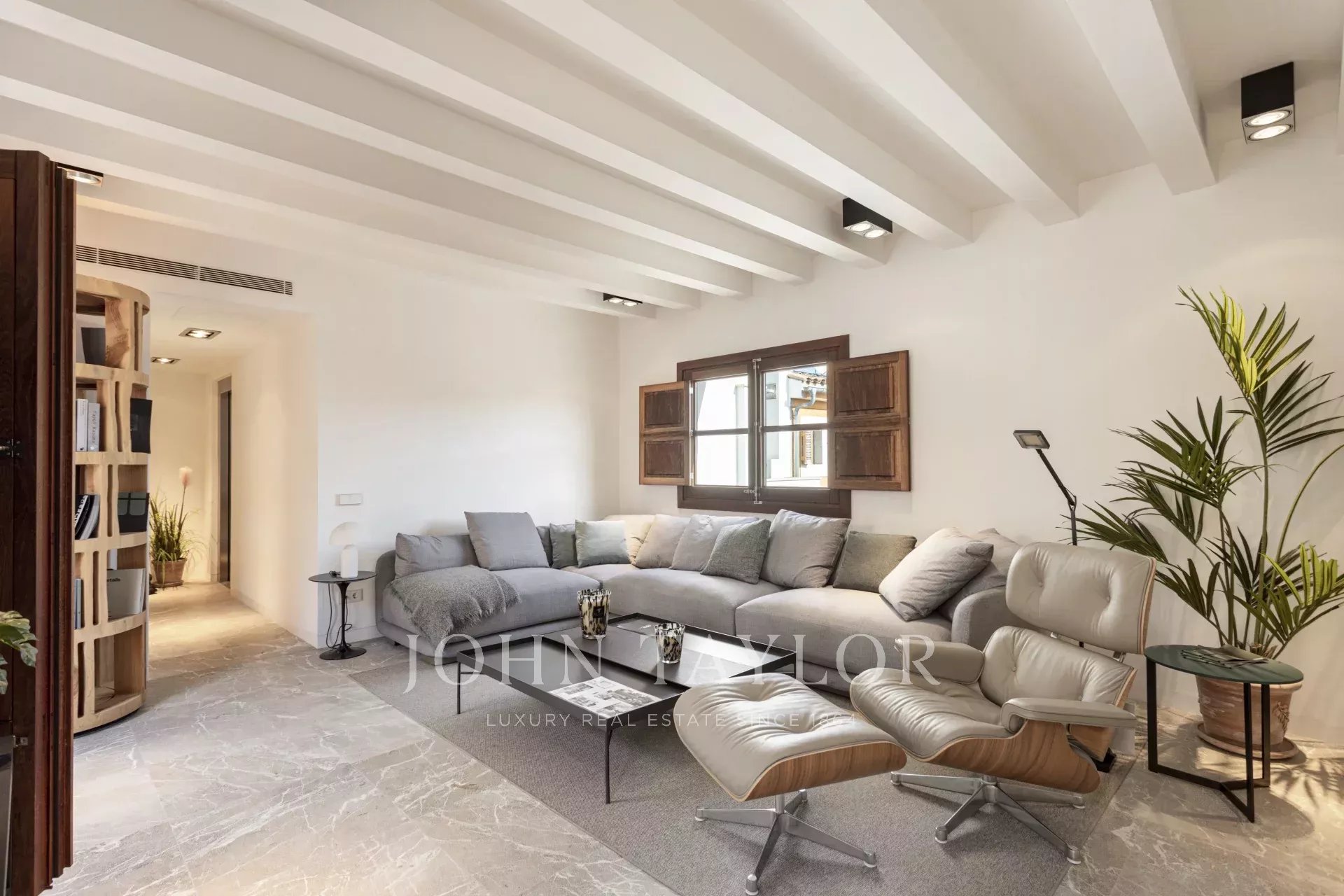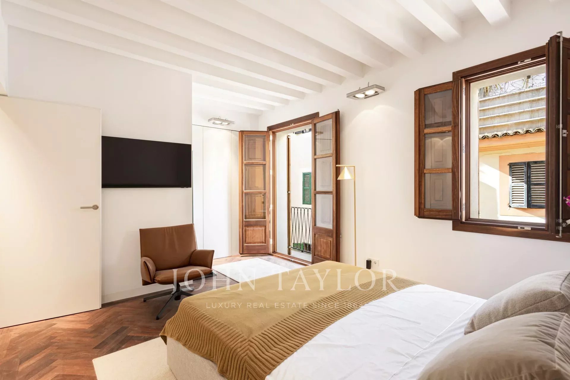In the very heart of Palma’s Old Town, just steps from Plaça Banc de l’Oli and a stone’s throw from the emblematic Plaza Cort, lies this newly created duplex penthouse — an architectural gem that blends the city’s historic essence with a contemporary aesthetic of clean lines and noble materials. Peacefully tucked away yet close to everything, it offers the perfect balance between tradition and modern living. The building has undergone a complete and meticulous refurbishment, executed with masterful craftsmanship and attention to detail. Its interior exudes sophistication and serenity, combining natural stone, herringbone wood flooring, and a warm palette that conveys calm and timeless elegance.