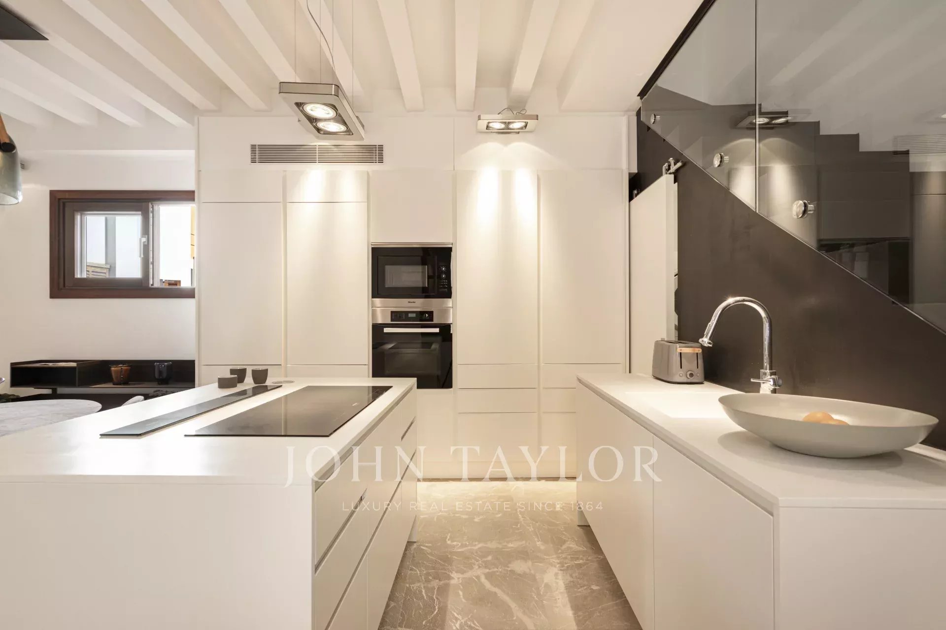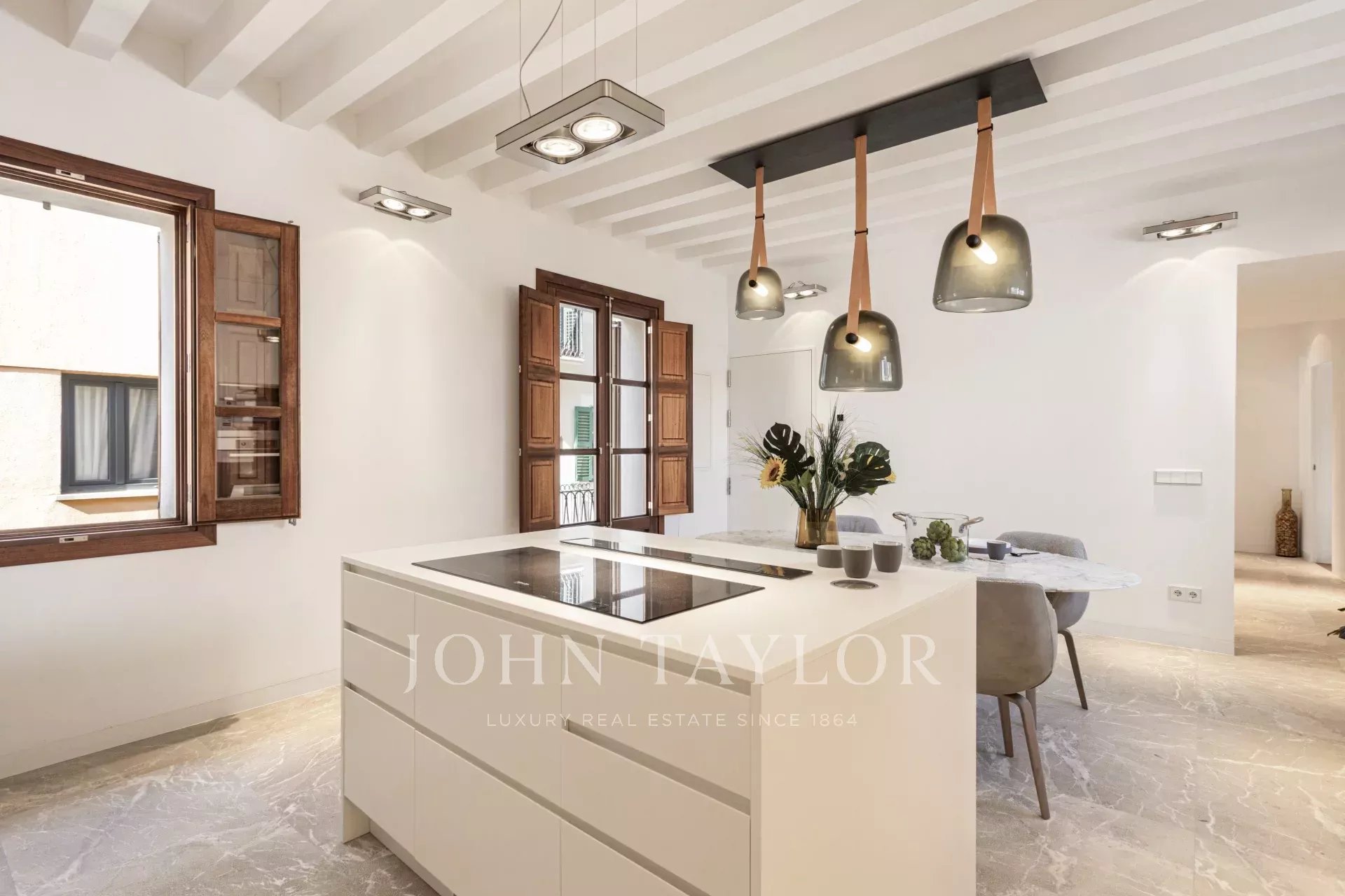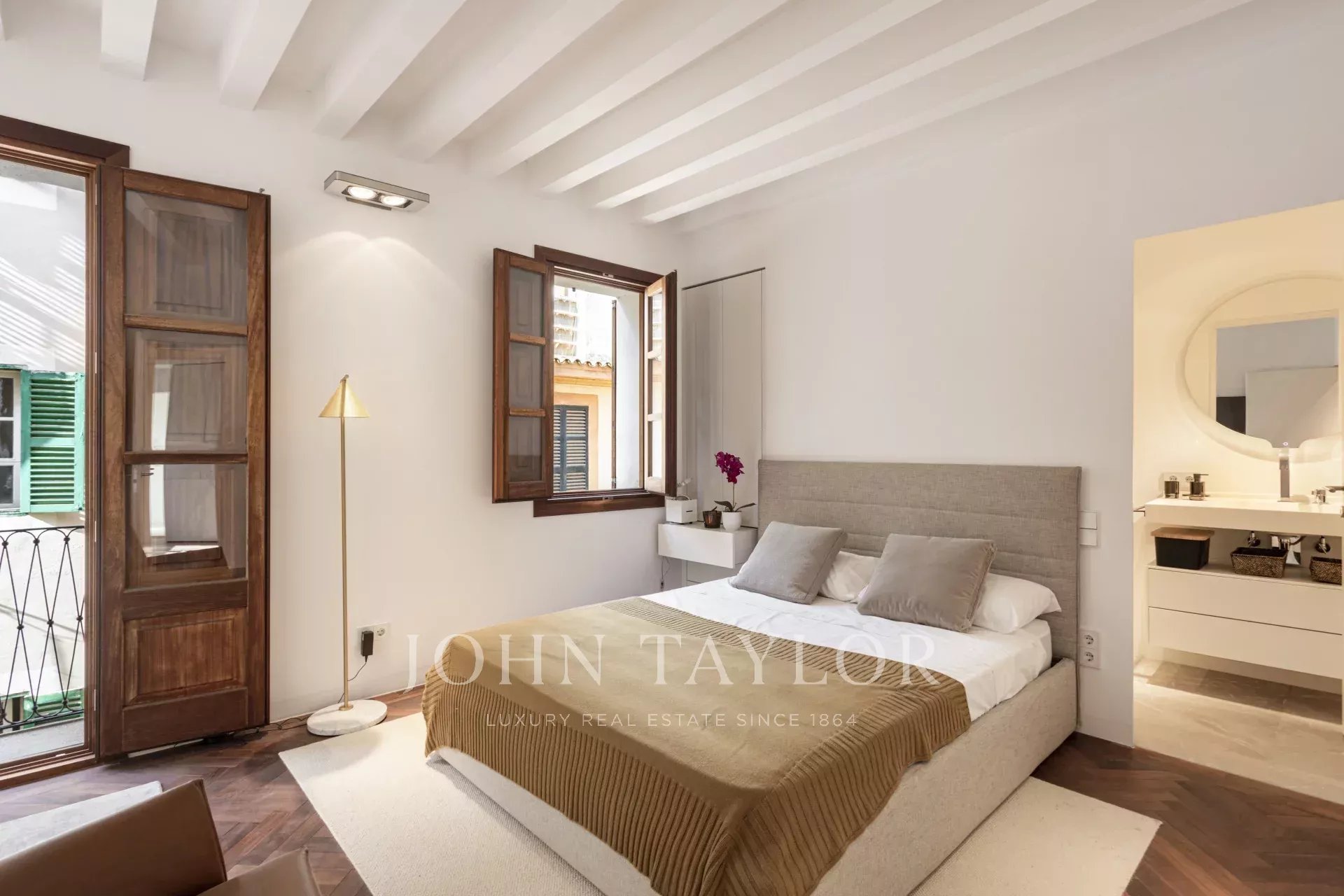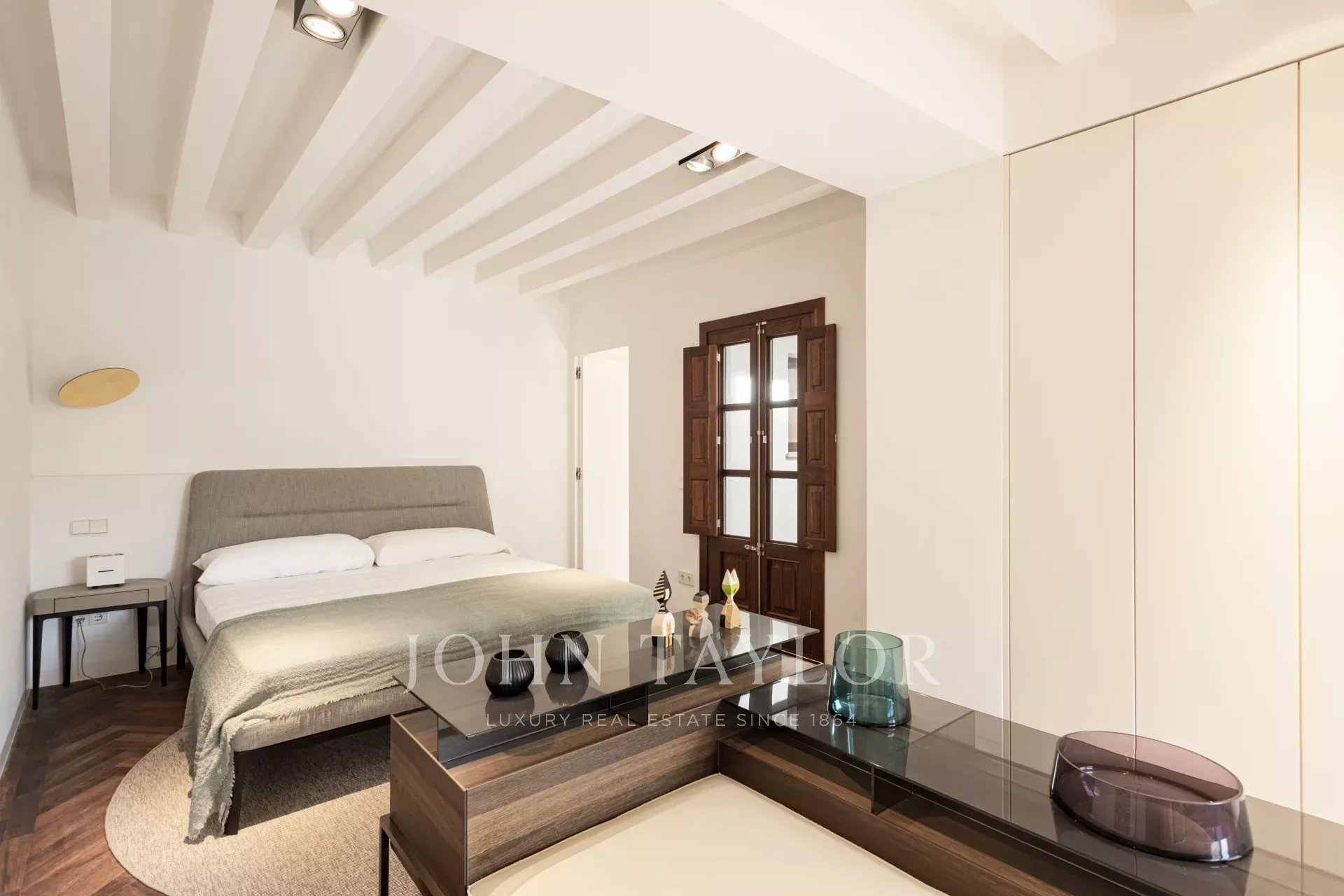 In the very heart of Palma’s Old Town, just steps from Plaça Banc de l’Oli and a stone’s throw from the emblematic Plaza Cort, lies this newly created duplex penthouse — an architectural gem that blends the city’s historic essence with a contemporary aesthetic of clean lines and noble materials. Peacefully tucked away yet close to everything, it offers the perfect balance between tradition and modern living. The building has undergone a complete and meticulous refurbishment, executed with masterful craftsmanship and attention to detail. Its interior exudes sophistication and serenity, combining natural stone, herringbone wood flooring, and a warm palette that conveys calm and timeless elegance.