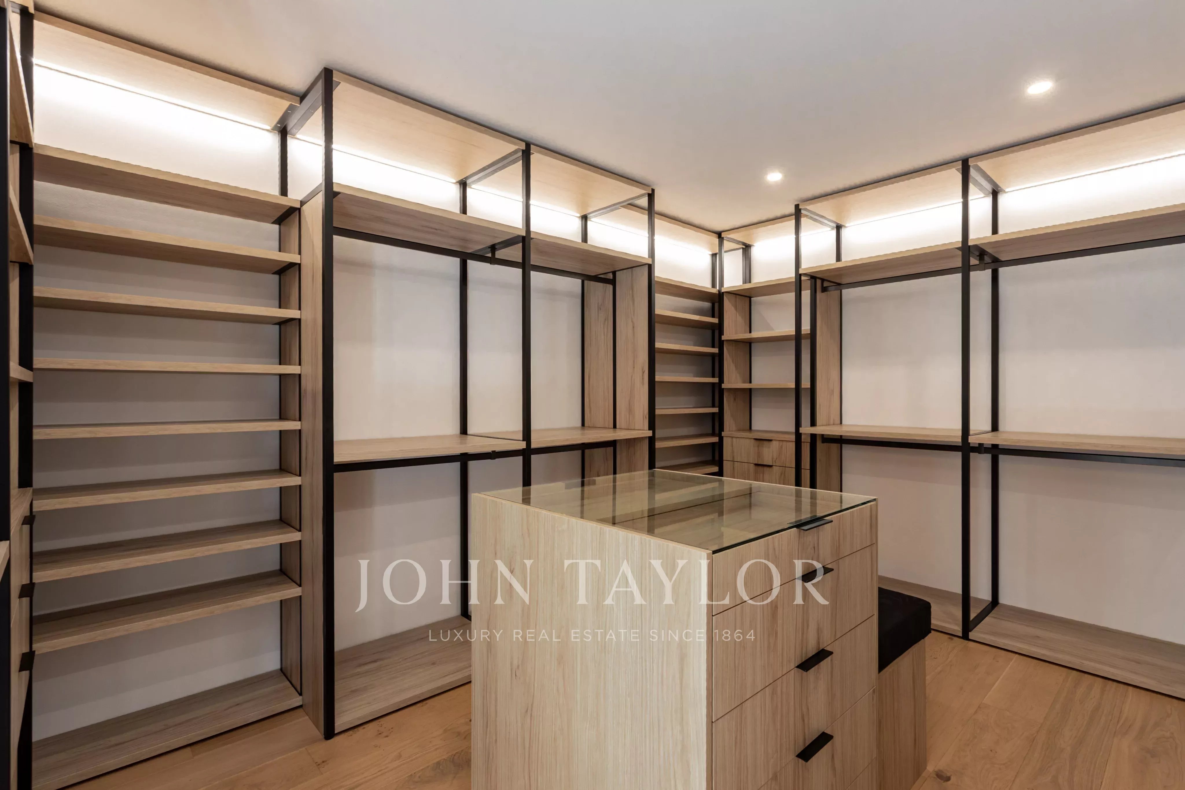 High-end finishes are found throughout the property, including parquet flooring, a designer kitchen equipped with Miele and Bora appliances, and elegant natural stone surfaces. Year-round comfort is ensured with gas central heating, central air conditioning, and underfloor heating in the dressing room area.