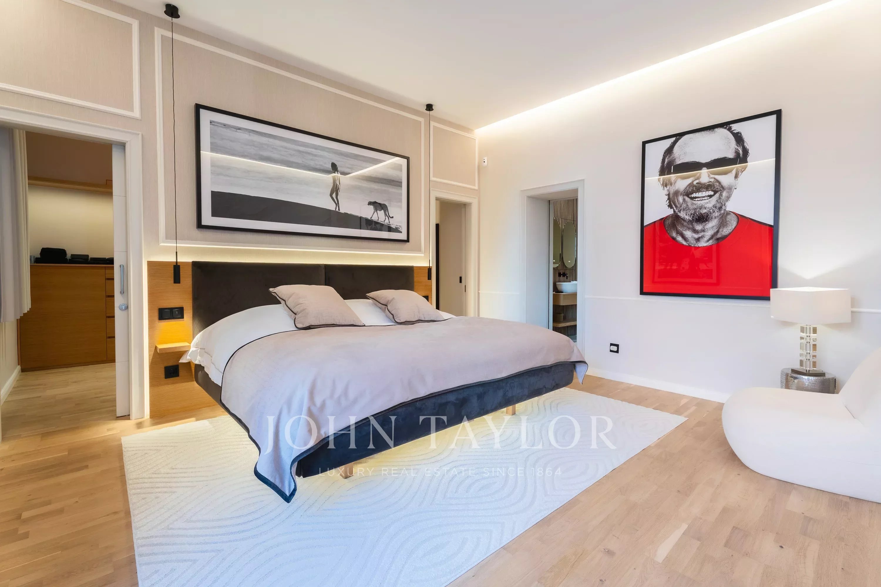 The layout is both spacious and functional. A large master suite includes a separate dressing area and a stylish en suite bathroom, creating a private retreat within the home. In addition, there is a separate guest bedroom and an extra bathroom, ideal for visitors or family living.