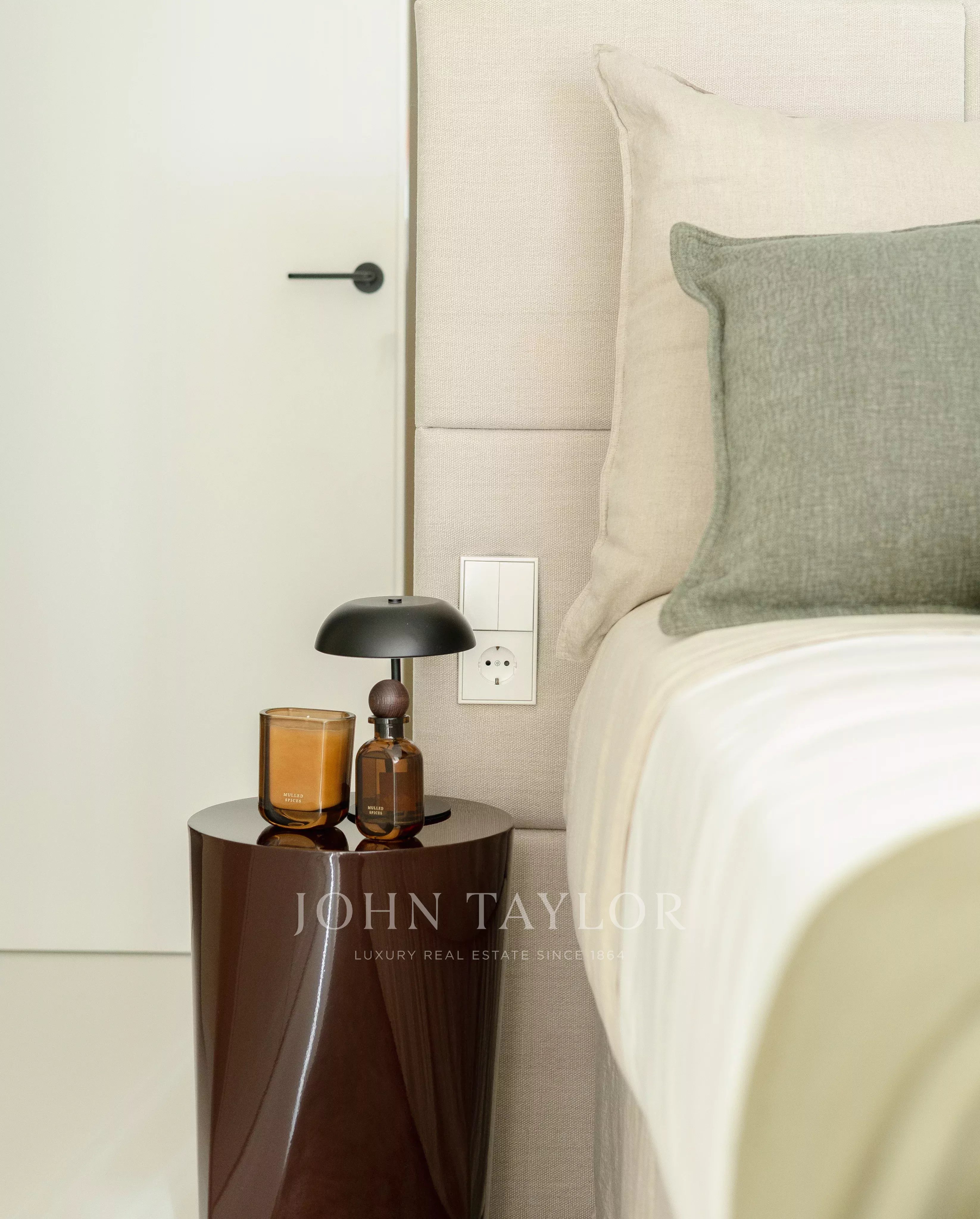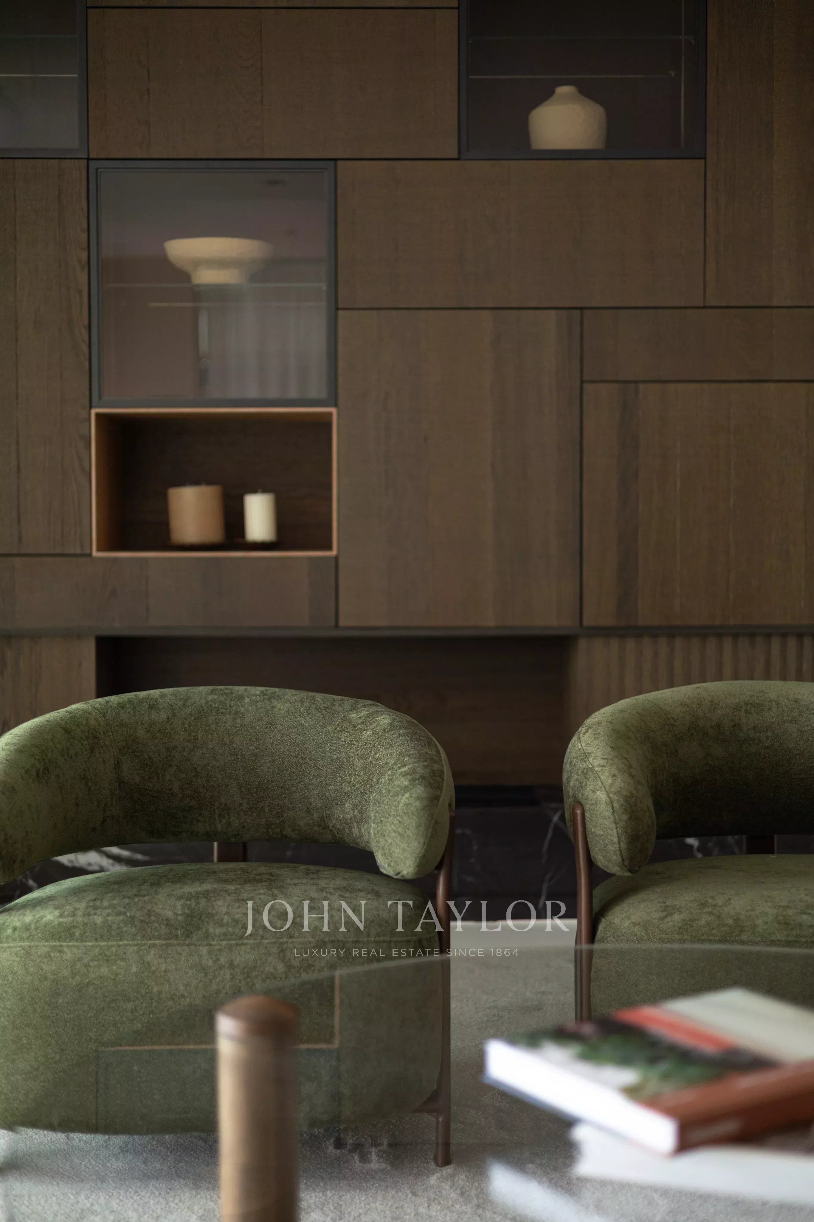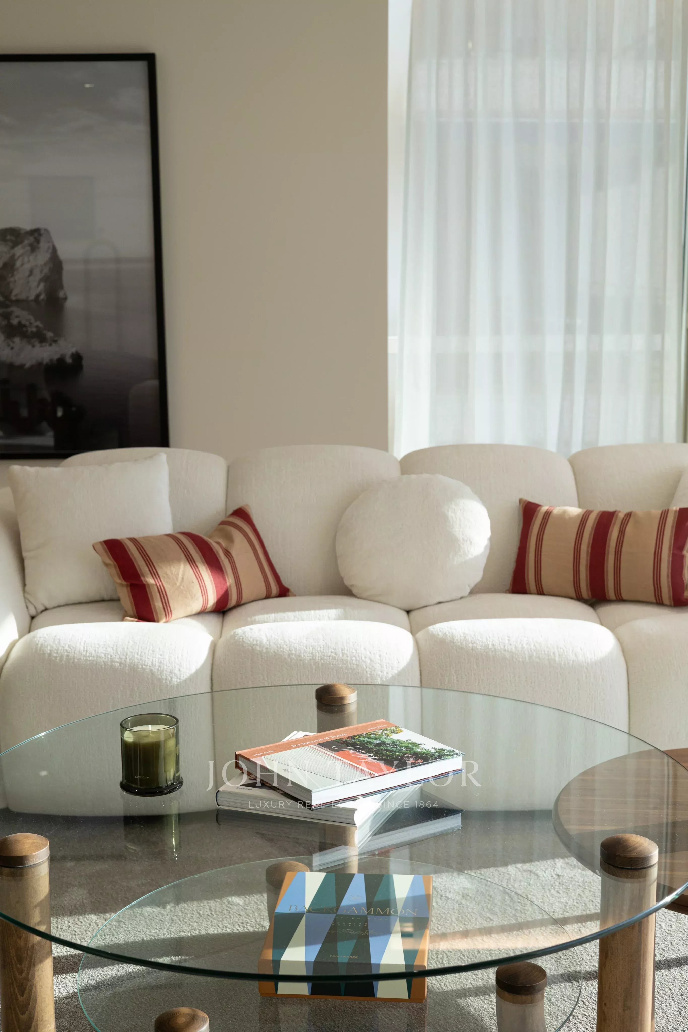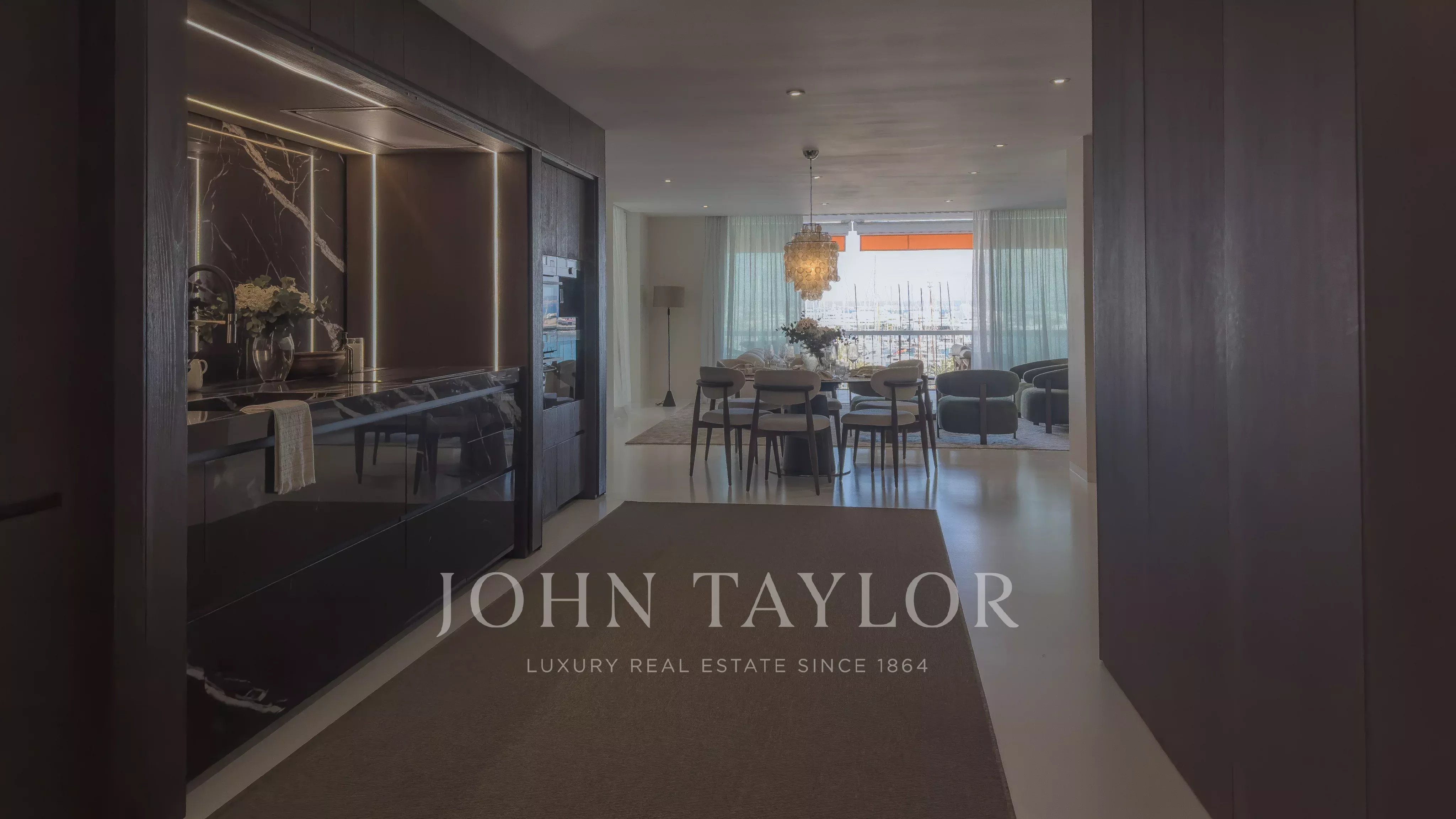 The custom-made, fully fitted kitchen with AEG appliances flows effortlessly to the dining and lounge area, complete with a cozy fireplace. The exterior terrace could not be a better place for entertaining, enjoying some sun, or sheer relaxation, and wraps around the apartment.
