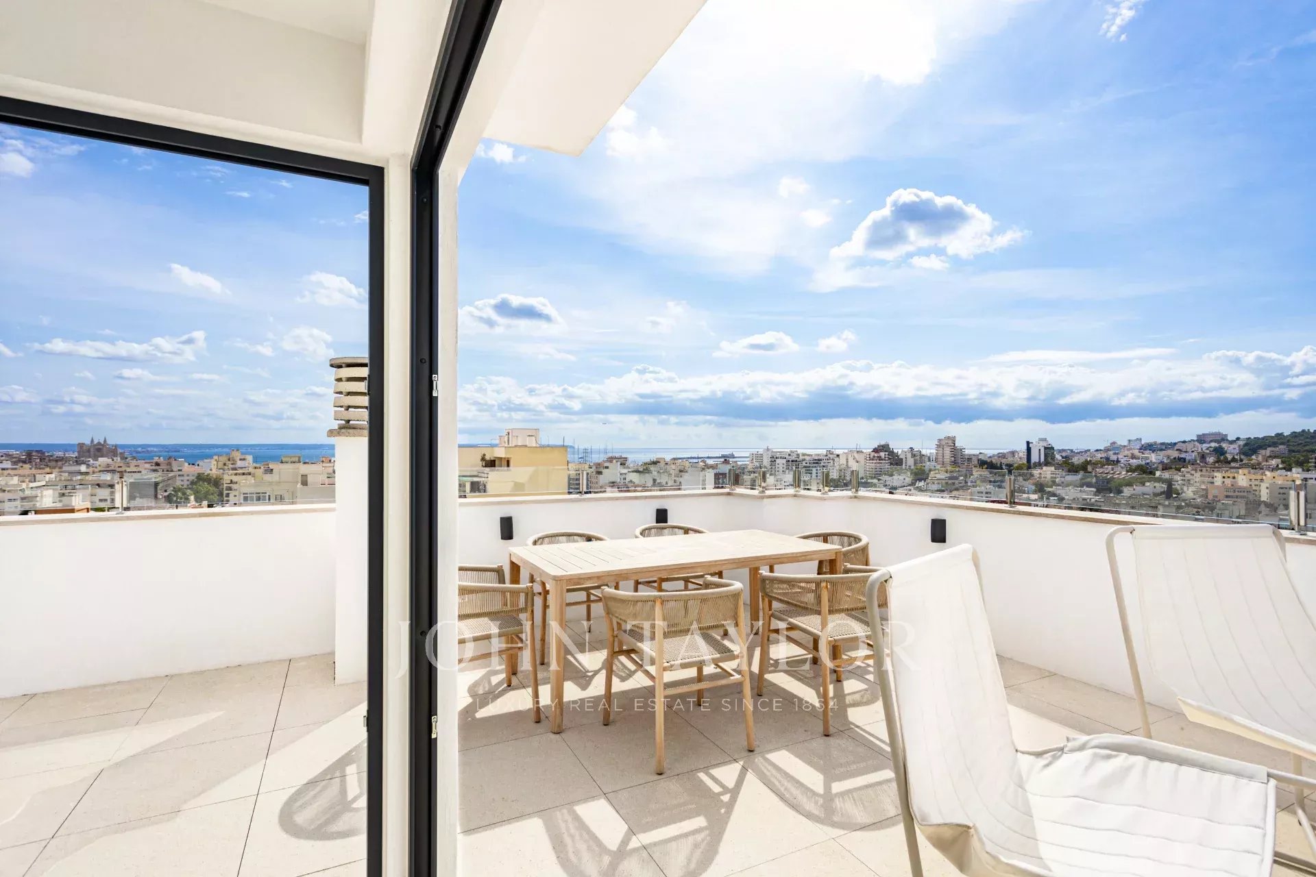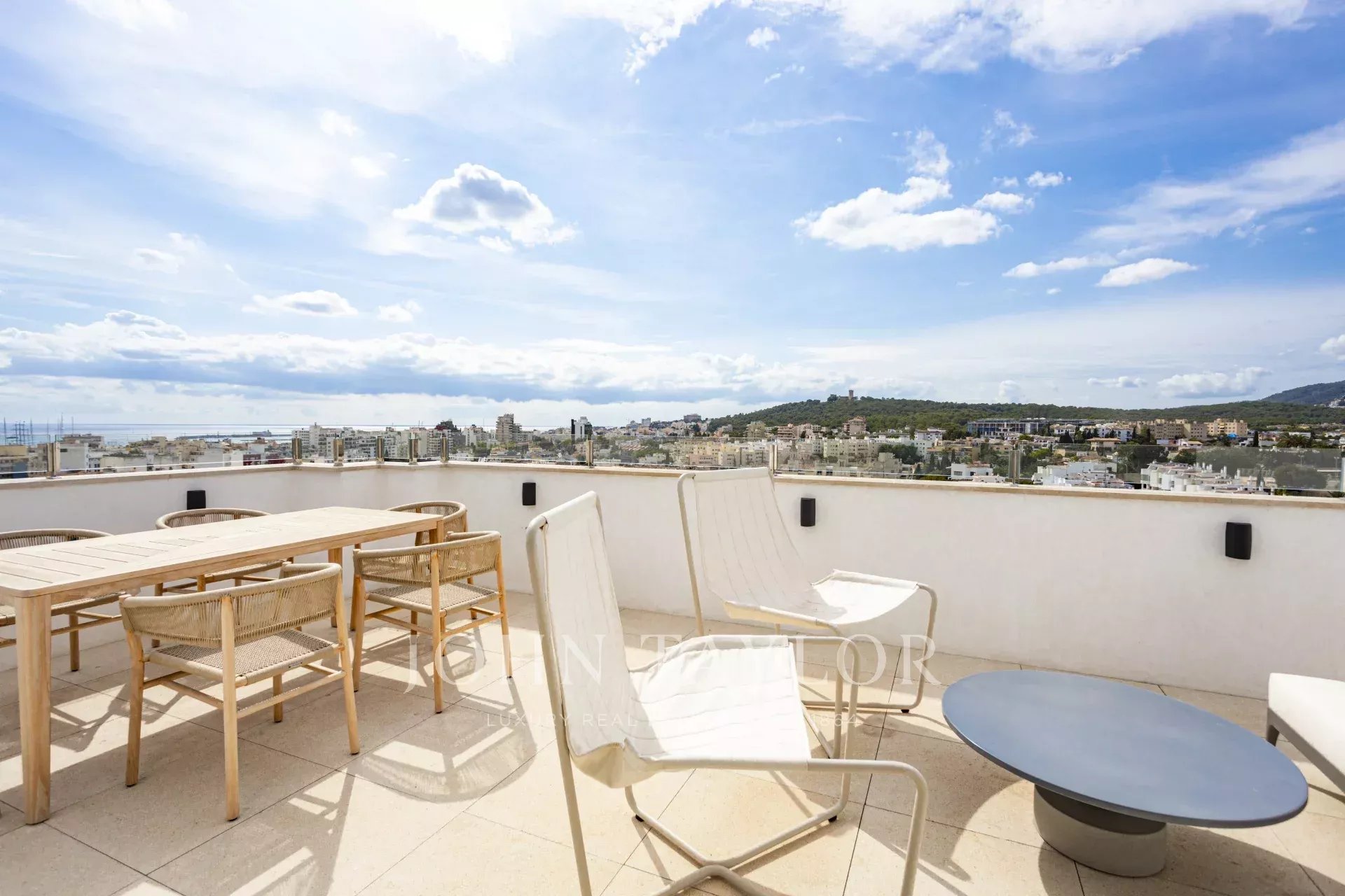 The rooftop hosts the highlight of this exceptional property: a large terrace with a dining area and a chill-out lounge with a sofa and armchairs, ideal for relaxing, entertaining guests, or enjoying the magnificent sunsets over Palma and the Mediterranean Sea.