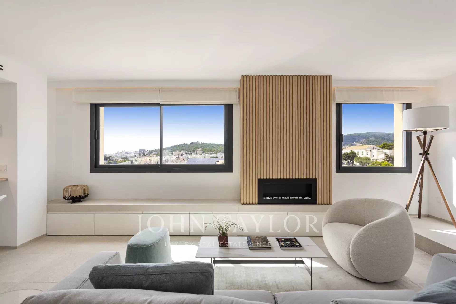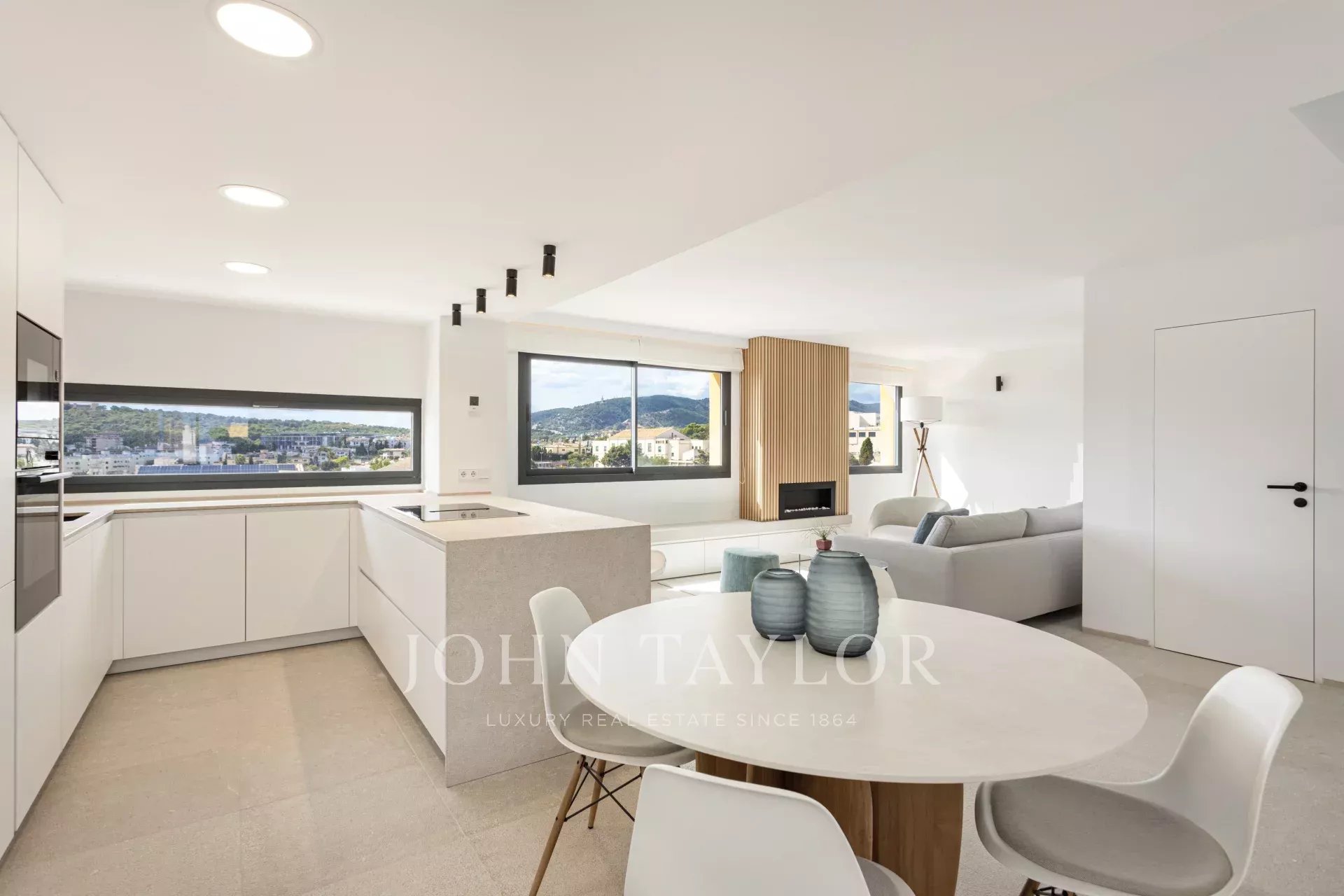 The main floor features a stylish open-plan living space that seamlessly connects the kitchen, dining, and lounge areas, surrounded by large windows that fill the home with sunlight and capture the stunning views from every angle. A modern ethanol fireplace adds a warm and refined touch, while a guest toilet enhances the comfort of this level.