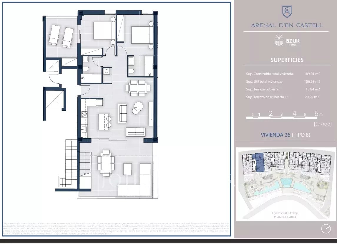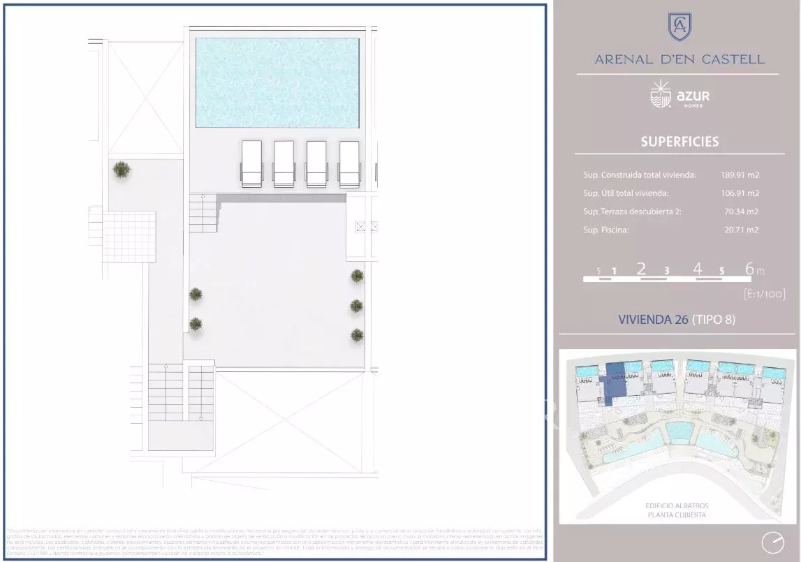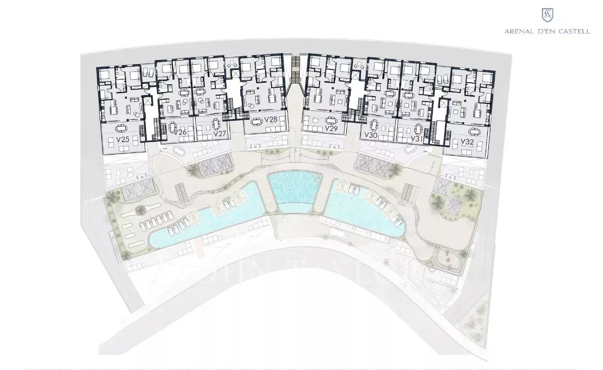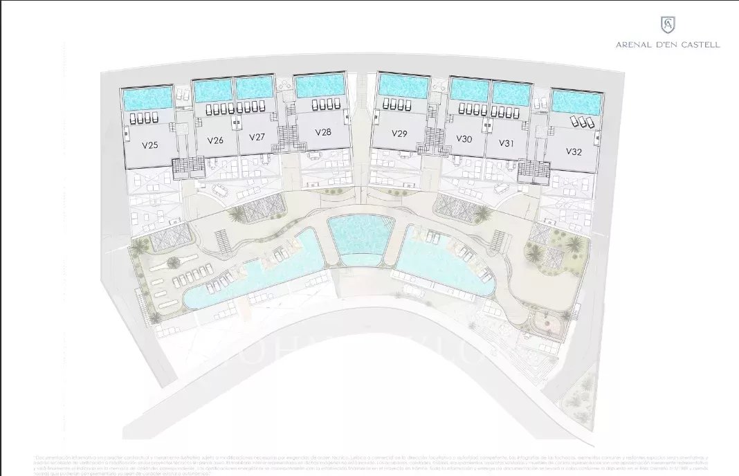 If you’re looking for breathtaking views and a modern, luxurious apartment, this property could be a golden opportunity. Here, you’ll live just 200 meters from Arenal d’en Castell beach, with all the necessary comforts for year-round well-being. You’ll find apartments with 1, 2, or 3 bedrooms and spacious terraces ranging from 100 to 260 square meters. The living space is generous and incredibly bright, allowing you to enjoy the wonderful surroundings right from your sofa. After enjoying the indoor spaces, you’ll have access to communal areas that include a children’s play area, coworking space, swimming pool, fitness area, and a spa. Boredom won’t be on the agenda!. The apartment has a private pool, a parking space, and a storage room.