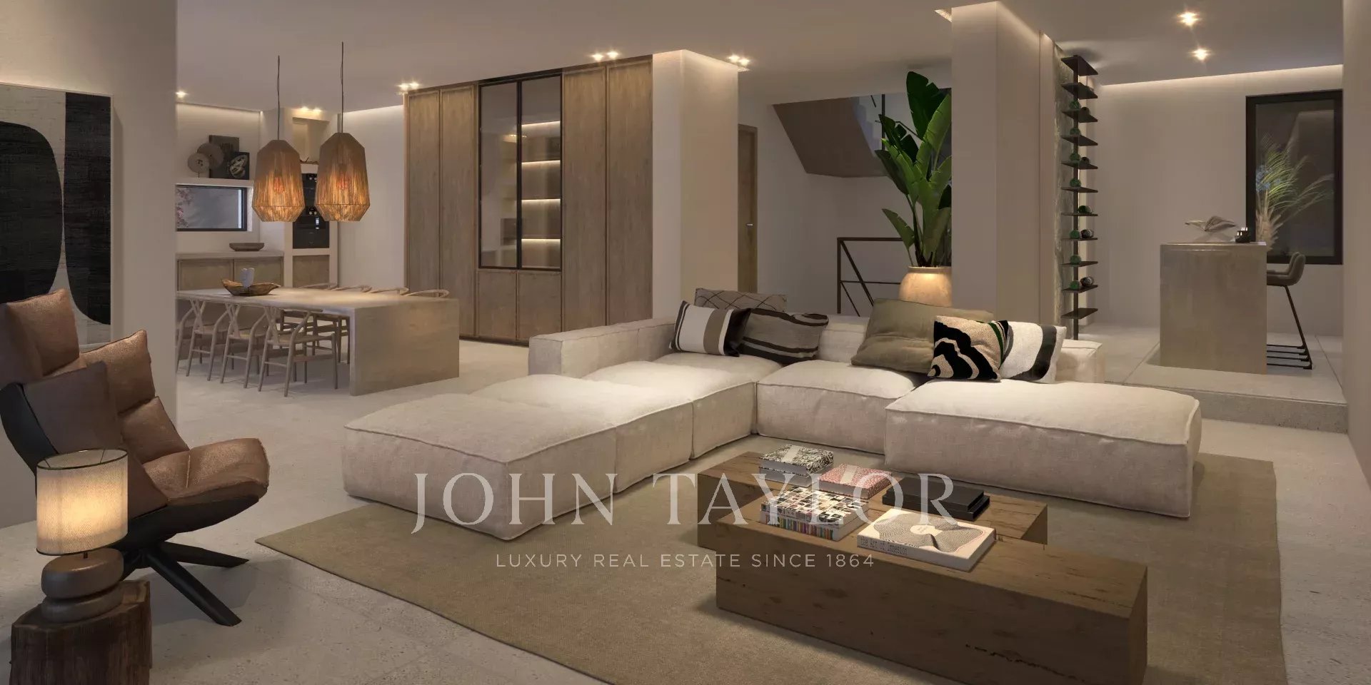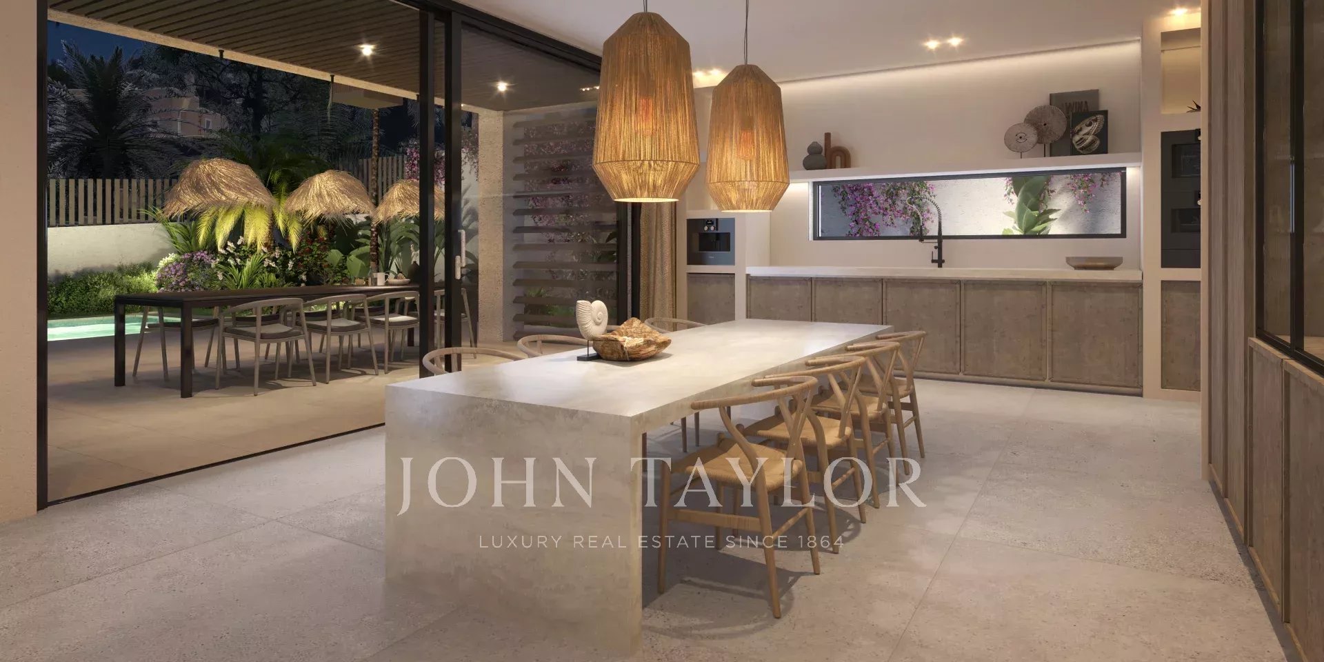 - Large windows connecting to a sun-drenched garden with terrace and swimming pool