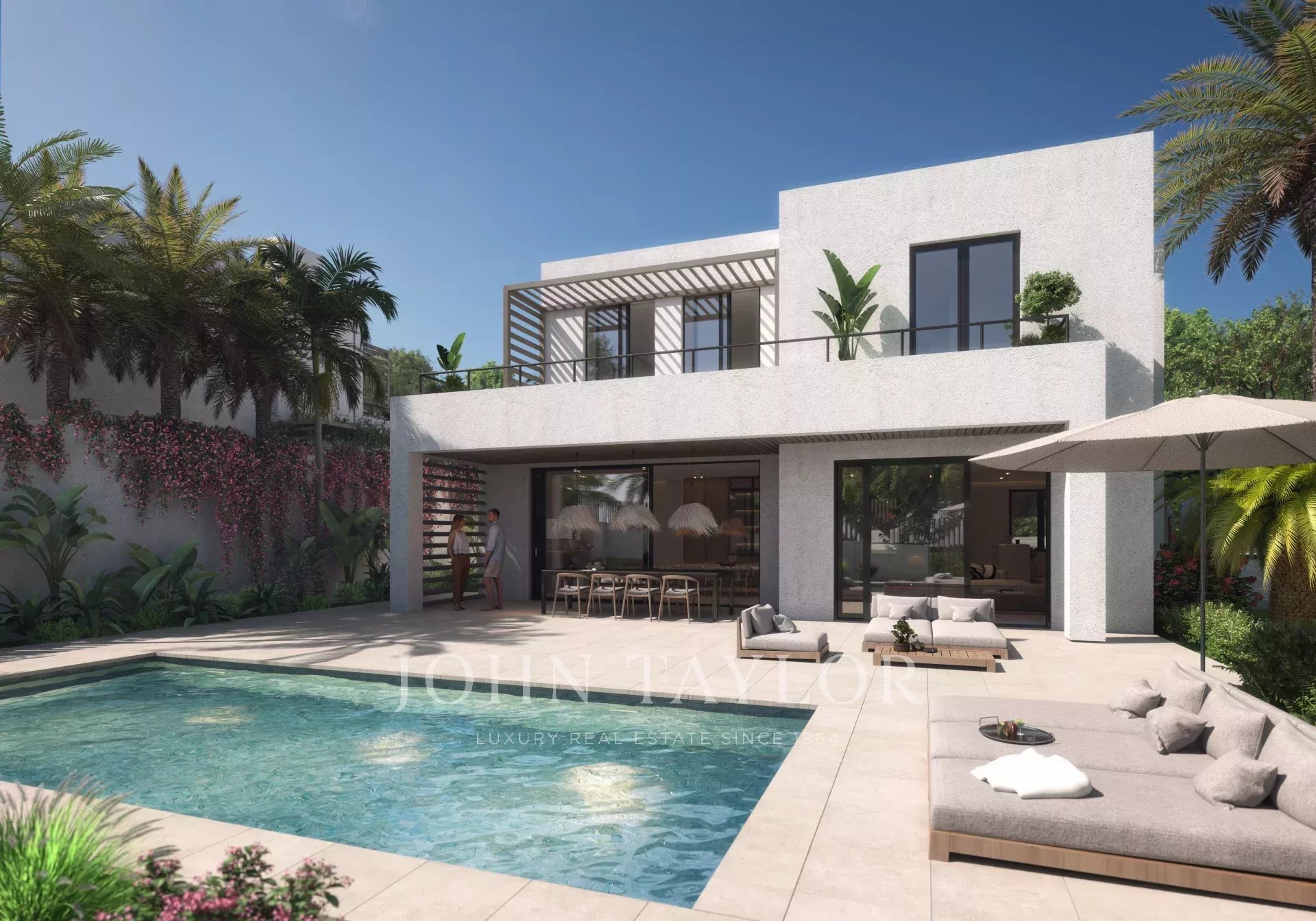The outdoor area is conceived as a private oasis with pool, garden and chill-out space, with the option to include a summer kitchen, barbecue or fireplace. The plot also includes three private parking spaces.