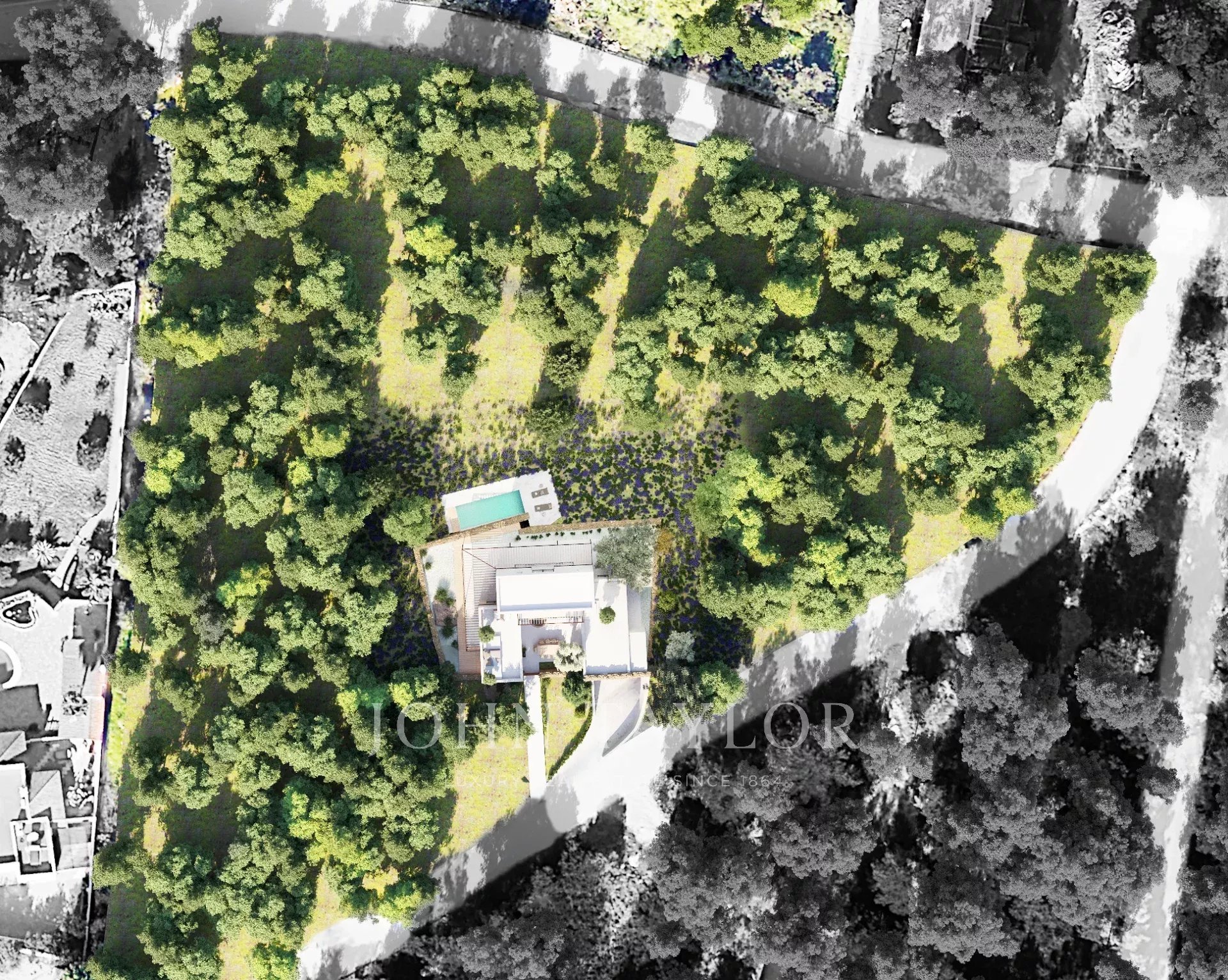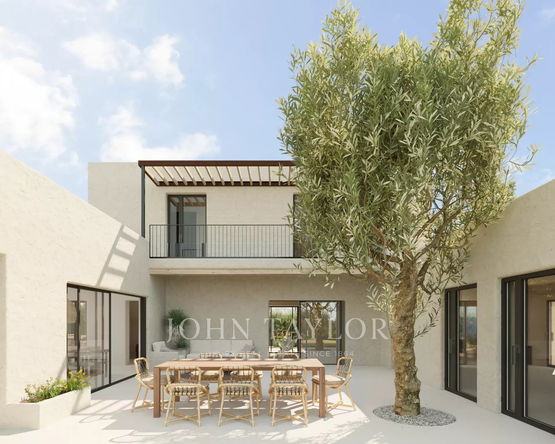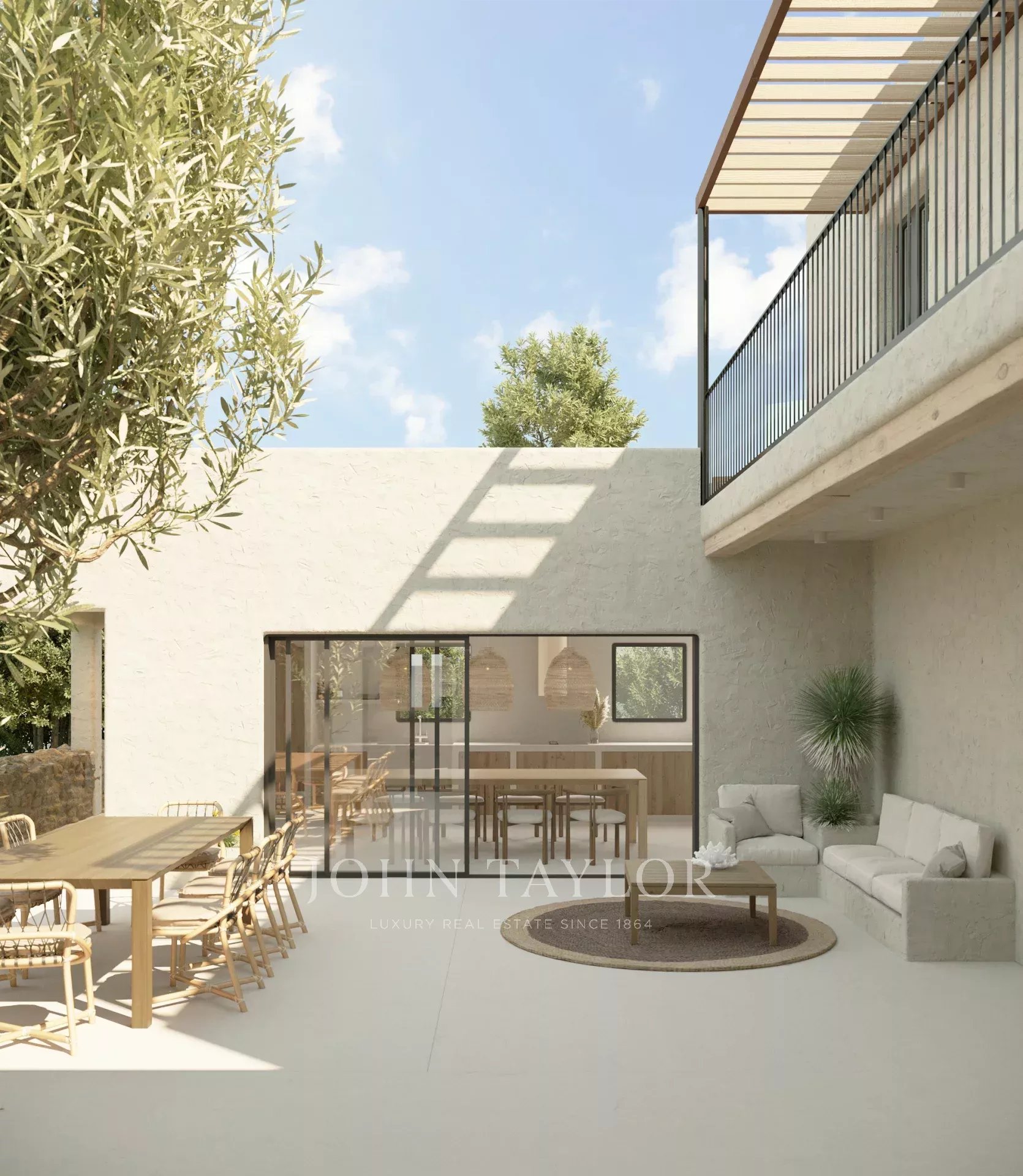 The ground floor of 157,35m2 has a large living room with fireplace, a separate kitchen, three bedrooms and three bathrooms. All the rooms open onto a large central courtyard.